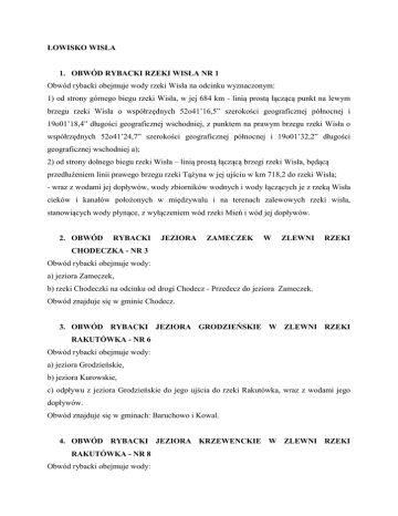 ŁOWISKO WISŁA 1. OBWÓD RYBACKI RZEKI WISŁA NR 1 Obwód rybacki obejmuje wody rzeki Wisła na odcinku wyznaczonym: 1) od strony górnego biegu rzeki Wisła, w jej 684 km - linią prostą łączącą punkt na lewym brzegu rzeki Wisła o współrzędnych 52o41’16,5” szerokości geograficznej północnej i 19o01’18,4” długości geograficznej wschodniej, z punktem na prawym brzegu rzeki Wisła o współrzędnych 52o41’24,7” szerokości geograficznej północnej i 19o01’32,2” długości geograficznej wschodniej a); 2) od strony dolnego biegu rzeki Wisła – linią prostą łączącą brzegi rzeki Wisła, będącą przedłużeniem linii prawego brzegu rzeki Tążyna w jej ujściu w km 718,2 do rzeki Wisła; - wraz z wodami jej dopływów, wody zbiorników wodnych i wody łączących je z rzeką Wisła cieków i kanałów położonych w międzywalu i na terenach zalewowych rzeki wisła, stanowiących wody płynące, z wyłączeniem wód rzeki Mień i wód jej dopływów. 2. OBWÓD RYBACKI JEZIORA ZAMECZEK W ZLEWNI RZEKI CHODECZKA - NR 3 Obwód rybacki obejmuje wody: a) jeziora Zameczek, b) rzeki Chodeczki na odcinku od drogi Chodecz - Przedecz do jeziora Zameczek. Obwód znajduje się w gminie Chodecz. 3. OBWÓD RYBACKI JEZIORA GRODZIEŃSKIE W ZLEWNI RZEKI RAKUTÓWKA - NR 6 Obwód rybacki obejmuje wody: a) jeziora Grodzieńskie, b) jeziora Kurowskie, c) odpływu z jeziora Grodzieńskie do jego ujścia do rzeki Rakutówka, wraz z wodami jego dopływów. Obwód znajduje się w gminach: Baruchowo i Kowal. 4. OBWÓD RYBACKI JEZIORA KRZEWENCKIE W ZLEWNI RZEKI RAKUTÓWKA - NR 8 Obwód rybacki obejmuje wody: a) jeziora Krzewenckie, b) odpływu z jeziora Krzewenckie do jego ujścia do jeziora Lubiechowskie. Obwód znajduje się w gminie Kowal. 5. OBWÓD RYBACKI JEZIORA GOREŃSKIE RAKUTÓWKA - NR 11 Obwód rybacki obejmuje wody jeziora Goreńskie. Obwód znajduje się w gminie Baruchowo. W ZLEWNI RZEKI