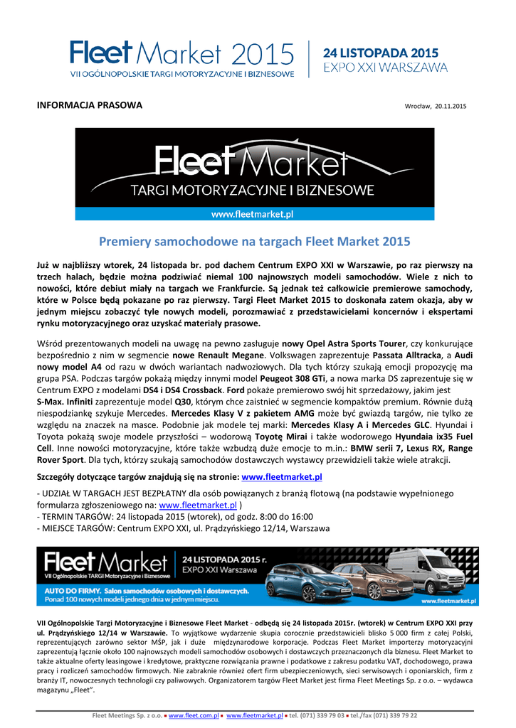 INFORMACJA PRASOWA Wrocław, 20.11.2015 Premiery samochodowe na targach Fleet Market 2015 Już w najbliższy wtorek, 24 listopada br. pod dachem Centrum EXPO XXI w Warszawie, po raz pierwszy na trzech halach, będzie można podziwiać niemal 100 najnowszych modeli samochodów. Wiele z nich to nowości, które debiut miały na targach we Frankfurcie. Są jednak też całkowicie premierowe samochody, które w Polsce będą pokazane po raz pierwszy. Targi Fleet Market 2015 to doskonała zatem okazja, aby w jednym miejscu zobaczyć tyle nowych modeli, porozmawiać z przedstawicielami koncernów i ekspertami rynku motoryzacyjnego oraz uzyskać materiały prasowe. Wśród prezentowanych modeli na uwagę na pewno zasługuje nowy Opel Astra Sports Tourer, czy konkurujące bezpośrednio z nim w segmencie nowe Renault Megane. Volkswagen zaprezentuje Passata Alltracka, a Audi nowy model A4 od razu w dwóch wariantach nadwoziowych. Dla tych którzy szukają emocji propozycję ma grupa PSA. Podczas targów pokażą między innymi model Peugeot 308 GTi, a nowa marka DS zaprezentuje się w Centrum EXPO z modelami DS4 i DS4 Crossback. Ford pokaże premierowo swój hit sprzedażowy, jakim jest S-Max. Infiniti zaprezentuje model Q30, którym chce zaistnieć w segmencie kompaktów premium. Równie dużą niespodziankę szykuje Mercedes. Mercedes Klasy V z pakietem AMG może być gwiazdą targów, nie tylko ze względu na znaczek na masce. Podobnie jak modele tej marki: Mercedes Klasy A i Mercedes GLC. Hyundai i Toyota pokażą swoje modele przyszłości – wodorową Toyotę Mirai i także wodorowego Hyundaia ix35 Fuel Cell. Inne nowości motoryzacyjne, które także wzbudzą duże emocje to m.in.: BMW serii 7, Lexus RX, Range Rover Sport. Dla tych, którzy szukają samochodów dostawczych wystawcy przewidzieli także wiele atrakcji. Szczegóły dotyczące targów znajdują się na stronie: www.fleetmarket.pl - UDZIAŁ W TARGACH JEST BEZPŁATNY dla osób powiązanych z branżą flotową (na podstawie wypełnionego formularza zgłoszeniowego na: www.fleetmarket.pl ) - TERMIN TARGÓW: 24 listopada 2015 (wtorek), od godz. 8:00 do 16:00 - MIEJSCE TARGÓW: Centrum EXPO XXI, ul. Prądzyńskiego 12/14, Warszawa VII Ogólnopolskie Targi Motoryzacyjne i Biznesowe Fleet Market - odbędą się 24 listopada 2015r. (wtorek) w Centrum EXPO XXI przy ul. Prądzyńskiego 12/14 w Warszawie. To wyjątkowe wydarzenie skupia corocznie przedstawicieli blisko 5 000 firm z całej Polski, reprezentujących zarówno sektor MŚP, jak i duże międzynarodowe korporacje. Podczas Fleet Market importerzy motoryzacyjni zaprezentują łącznie około 100 najnowszych modeli samochodów osobowych i dostawczych przeznaczonych dla biznesu. Fleet Market to także aktualne oferty leasingowe i kredytowe, praktyczne rozwiązania prawne i podatkowe z zakresu podatku VAT, dochodowego, prawa pracy i rozliczeń samochodów firmowych. Nie zabraknie również ofert firm ubezpieczeniowych, sieci serwisowych i oponiarskich, firm z branży IT, nowoczesnych technologii czy paliwowych. Organizatorem targów Fleet Market jest firma Fleet Meetings Sp. z o.o. – wydawca magazynu „Fleet”. Fleet Meetings Sp. z o.o. www.fleet.com.pl www.fleetmarket.pl tel. (071) 339 79 03 tel./fax (071) 339 79 22 WYSTAWCY FLEET MARKET 2015 KONTAKT DO ORGANIZATORA: ORGANIZACJA TARGÓW Małgorzata Mikołajczyk mał[email protected] kom. +48 666 373 920 tel. + 48 (71) 750 18 58 DZIAŁANIA MARKETINGOWE I PR Dominika Wejksznia [email protected] kom. +48 668 400 633 tel. +48 (71) 339 79 03 REDAKCJA MAGAZYNU FLEET Tomasz Siwiński [email protected] kom.: +48 668 353 040 tel. +48 (71) 339 79 03 Fleet Meetings Sp. z o.o. www.fleet.com.pl www.fleetmarket.pl tel. (071) 339 79 03 tel./fax (071) 339 79 22