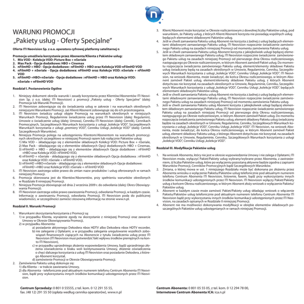 WARUNKI PROMOCJI „Pakiety usług - Oferty Specjalne” Oferta ITI Neovision Sp. z o.o. operatora cyfrowej platformy satelitarnej n Promocja umożliwia korzystanie przez Abonenta/Klienta z Pakietów usług: 1. Mix VOD - Kolekcje VOD: Picture Box + nSeriale 2. Max Pack - Opcje dodatkowe: HBO + Cinemax 3. nFilmHD + HBO - Opcje dodatkowe : nFilmHD + HBO oraz Kolekcja VOD nFilmHD VOD 4.nFilmHD + nSeriale - Opcja dodatkowa: nFilmHD oraz Kolekcje VOD: nSeriale + nFilmHD VOD 5. nFilmHD +HBO+nSeriale - Opcje dodatkowe : nFilmHD + HBO oraz Kolekcje VOD: nSeriale + nFilmHD VOD Rozdział I. Postanowienia Ogólne 1.Niniejszy dokument określa warunki i zasady korzystania przez Klientów/Abonentów ITI Neovision Sp. z o.o. (dalej: ITI Neovision) z promocji „Pakiety usług - Oferty Specjalne” (dalej: Promocja lub Warunki Promocji). 2. ITI Neovision zobowiązuje się do świadczenia usług w zakresie i na warunkach określonych niniejszymi Warunkami Promocji, zaś Klient/Abonent zobowiązuje się do ich przestrzegania. 3.ITI Neovision świadczy usługi objęte Promocją na warunkach określonych w niniejszych Warunkach Promocji, Regulaminie świadczenia usług przez ITI Neovision (dalej: Regulamin), Umowie o świadczenie usług (dalej: Umowa), Cenniku ITI Neovision (dalej: Cennik), Cennikach Promocyjnych, Szczegółowych Warunkach korzystania z usługi „kolekcje VOD”, Szczegółowych Warunkach korzystania z usługi „premiery VOD”, Cenniku Usługi „kolekcje VOD” (dalej: Cennik Szczegółowych Warunków). 4.Niniejsza Promocja polega na udostępnieniu Klientom/Abonentom na warunkach promocyjnych określonych szczegółowo w niniejszej Promocji razem lub rozłącznie Pakietów usług: 1) Mix VOD – składającego się z elementów składowych Kolekcji VOD: Picture Box + nSeriale, 2) Max Pack - składającego się z elementów składowych Opcji dodatkowych: HBO + Cinemax, 3) nFilmHD + HBO – składającego się z elementów składowych Opcje dodatkowe : nFilmHD +HBO oraz Kolekcja VOD: nFilmHD VOD, 4) nFilmHD + nSeriale - składającego się z elementów składowych Opcja dodatkowa : nFilmHD oraz Kolekcje VOD: nSeriale + nFilmHD VOD, 5) nFilmHD +HBO+nSeriale - składającego się z elementów składowych Opcje dodatkowe: nFilmHD +HBO oraz Kolekcje VOD: nSeriale + nFilmHD VOD 5. ITI Neovision zastrzega sobie prawo do zmian nazw produktów i usług oferowanych w ramach niniejszej Promocji. 6. Promocja skierowana jest do Klientów/Abonentów, przy spełnieniu warunków określonych w Rozdziale II niniejszej Promocji. 7.Niniejsza Promocja obowiązuje od dnia 2 września 2009 r. do odwołania (dalej: Okres Obowiązy wania Promocji). 8. ITI Neovision zastrzega sobie prawo zawieszenia Promocji, odwołania Promocji, w każdym czasie. Informację o zawieszeniu Promocji, odwołaniu Promocji, ITI Neovision poda do publicznej wiadomości, w szczególności zamieści stosowną informację na stronie www.n.pl. Rozdział II. Warunki Promocji 3. Klient/Abonent może korzystać w Okresie rozliczeniowym z dowolnej liczby Pakietów usług, pod warunkiem, że Pakiety usług, z których Klient/Abonent korzysta nie posiadają wspólnych usług będących elementami składowymi Pakietów usług. 4.Jeśli w chwili zamawiania Pakietu usług Abonent nie korzysta z żadnej z usług będących elementami składowymi zamawianego Pakietu usług, ITI Neovision rozpocznie świadczenie zamówionego Pakietu usług na zasadach niniejszej Promocji od momentu zamówienia Pakietu usług. 5.Jeśli w chwili zamawiania Pakietu usług Abonent korzysta z jakiejkolwiek usługi będącej elemetem składowym zamawianego Pakietu usług, ITI Neovision rozpocznie świadczenie zamówionego Pakietu usług na zasadach niniejszej Promocji od pierwszego dnia Okresu rozliczeniowego, następującego po Okresie rozliczeniowym, w którym Abonent zamówił Pakiet usług. Do momentu rozpoczęcia świadczenia zamówionego Pakietu usług, element/elementy składowe Pakietu usług świadczony będą na zasadach określonych w Umowie, Regulaminie, Cenniku, Szczegółowych Warunkach korzystania z usługi „kolekcje VOD”, Cenniku Usługi „kolekcje VOD”. ITI Neovision, na wniosek Abonenta, może świadczyć, do końca Okresu rozliczeniowego, w którym Abonent zamówił Pakiet usług, element/elementy składowe Pakietu usług, z których Abonent dotychczas nie korzystał, na zasadach określonych w Umowie, Regulaminie, Cenniku, Szczegółowych Warunkach korzystania z usługi „kolekcje VOD”, Cenniku Usługi „kolekcje VOD”. będących elementami składowymi Pakietów usług. 4.Jeśli w chwili zamawiania Pakietu usług Abonent nie korzysta z żadnej z usług będących elementami składowymi zamawianego Pakietu usług, ITI Neovision rozpocznie świadczenie zamówionego Pakietu usług na zasadach niniejszej Promocji od momentu zamówienia Pakietu usług. 5.Jeśli w chwili zamawiania Pakietu usług Abonent korzysta z jakiejkolwiek usługi będącej elementem składowym zamawianego Pakietu usług, ITI Neovision rozpocznie świadczenie zamówionego Pakietu usług na zasadach niniejszej Promocji od pierwszego dnia Okresu rozliczeniowego, następującego po Okresie rozliczeniowym, w którym Abonent zamówił Pakiet usług. Do momentu rozpoczęcia świadczenia zamówionego Pakietu usług, element składowy Pakietu usług świadczony będzie na zasadach określonych w Umowie, Regulaminie, Cenniku, Szczegółowych Warunkach korzystania z usługi „kolekcje VOD”, Cenniku Usługi „kolekcje VOD”. ITI Neovision, na wniosek Abonenta, może świadczyć, do końca Okresu rozliczeniowego, w którym Abonent zamówił Pakiet usług, element składowy Pakietu usług, z którego Abonent dotychczas nie korzystał, na zasadach określonych w Umowie, Regulaminie, Cenniku, Szczegółowych Warunkach korzystania z usługi „kolekcje VOD”, Cenniku Usługi „kolekcje VOD”. Rozdział III. Modyfikacje Pakietów usług 1.Na wniosek Abonenta, który nie jest w okr