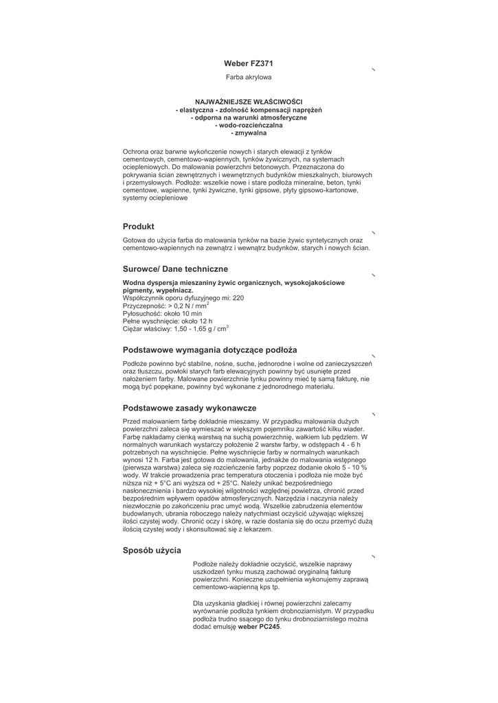 Weber FZ371 Farba akrylowa NAJWAŻNIEJSZE WŁAŚCIWOŚCI - elastyczna - zdolność kompensacji naprężeń - odporna na warunki atmosferyczne - wodo-rozcieńczalna - zmywalna Ochrona oraz barwne wykończenie nowych i starych elewacji z tynków cementowych, cementowo-wapiennych, tynków żywicznych, na systemach ociepleniowych. Do malowania powierzchni betonowych. Przeznaczona do pokrywania ścian zewnętrznych i wewnętrznych budynków mieszkalnych, biurowych i przemysłowych. Podłoże: wszelkie nowe i stare podłoża mineralne, beton, tynki cementowe, wapienne, tynki żywiczne, tynki gipsowe, płyty gipsowo-kartonowe, systemy ociepleniowe Produkt Gotowa do użycia farba do malowania tynków na bazie żywic syntetycznych oraz cementowo-wapiennych na zewnątrz i wewnątrz budynków, starych i nowych ścian. Surowce/ Dane techniczne Wodna dyspersja mieszaniny żywic organicznych, wysokojakościowe pigmenty, wypełniacz. Współczynnik oporu dyfuzyjnego mi: 220 Przyczepność: > 0,2 N / mm 2 Pyłosuchość: około 10 min Pełne wyschnięcie: około 12 h Ciężar właściwy: 1,50 - 1,65 g / cm3 Podstawowe wymagania dotyczące podłoża Podłoże powinno być stabilne, nośne, suche, jednorodne i wolne od zanieczyszczeń oraz tłuszczu, powłoki starych farb elewacyjnych powinny być usunięte przed nałożeniem farby. Malowane powierzchnie tynku powinny mieć tę samą fakturę, nie mogą być popękane, powinny być wykonane z jednorodnego materiału. Podstawowe zasady wykonawcze Przed malowaniem farbę dokładnie mieszamy. W przypadku malowania dużych powierzchni zaleca się wymieszać w większym pojemniku zawartość kilku wiader. Farbę nakładamy cienką warstwą na suchą powierzchnię, wałkiem lub pędzlem. W normalnych warunkach wystarczy położenie 2 warstw farby, w odstępach 4 - 6 h potrzebnych na wyschnięcie. Pełne wyschnięcie farby w normalnych warunkach wynosi 12 h. Farba jest gotowa do malowania, jednakże do malowania wstępnego (pierwsza warstwa) zaleca się rozcieńczenie farby poprzez dodanie około 5 - 10 % wody. W trakcie prowadzenia prac temperatura otoczenia i podłoża nie może być niższa niż + 5°C ani wyższa od + 25°C. Należy unikać bezpośredniego nasłonecznienia i bardzo wysokiej wilgotności względnej powietrza, chronić przed bezpośrednim wpływem opadów atmosferycznych. Narzędzia i naczynia należy niezwłocznie po zakończeniu prac umyć wodą. Wszelkie zabrudzenia elementów budowlanych, ubrania roboczego należy natychmiast oczyścić używając większej ilości czystej wody. Chronić oczy i skórę, w razie dostania się do oczu przemyć dużą ilością czystej wody i skonsultować się z lekarzem. Sposób użycia Podłoże należy dokładnie oczyścić, wszelkie naprawy uszkodzeń tynku muszą zachować oryginalną fakturę powierzchni. Konieczne uzupełnienia wykonujemy zaprawą cementowo-wapienną kps tp. Dla uzyskania gładkiej i równej powierzchni zalecamy wyrównanie podłoża tynkiem drobnoziarnistym. W przypadku podłoża trudno ssącego do tynku drobnoziarnistego można dodać emulsję weber PC245. Stare farby organiczne, dyspersyjne i olejne o złej przyczepności należy usunąć. Podłoże dokładnie zmyć wodą. Piaskujące się tynki z resztkami farb wapiennych trudnych do usunięcia, pokrywamy do nasycenia preparatem wzmacniającym weber PC244. Dokładnie mieszamy farbę. W przypadku malowania dużych powierzchni zaleca się wymieszać w większym pojemniku zawartość kilku wiader. Farbę nakładamy cienką warstwą na suchą powierzchnię, wałkiem lub pędzlem. W normalnych warunkach wystarczy położenie 2 warstw farby, w odstępach 12 h potrzebnych na wyschnięcie. Narzędzia po użyciu natychmiast umyć w wodzie. Zużycie około 0,25 kg / m2 - (jedna warstwa, gładka powierzchnia) około 0,4 kg / m2 - (dwie warstwy, gładka powierzchnia) Opakowanie wiadro 10 kg, 25 kg Magazynowanie W oryginalnym szczelnie zamkniętym opakowaniu Farba silikonowa może być przechowywana do 12 miesięcy. Chronić przed mrozem i wysoką temperaturą. Produkty systemu weber TP521 - tynk drobnoziarnisty weber PC244 - preparat wzmacniający weber PC245 - emulsja zwiększająca przyczepność Kolorystyka Paleta kolorów Weber