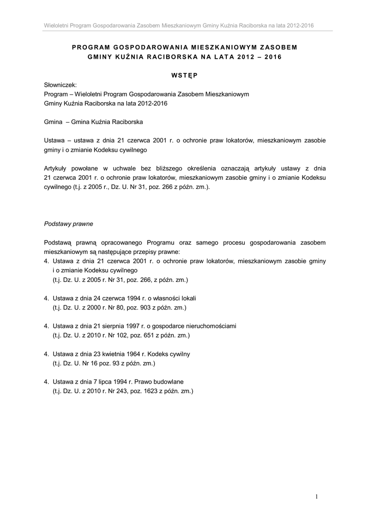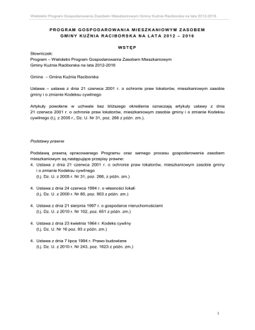 Wieloletni Program Gospodarowania Zasobem Mieszkaniowym Gminy Kuźnia Raciborska na lata 2012-2016 PRO G RAM G O SPO D ARO W ANI A MI ESZ K ANI O WYM Z ASO BEM G MI NY KUŹ NI A R ACI BO RS K A N A L AT A 201 2 – 2 016 WST ĘP Słowniczek: Program – Wieloletni Program Gospodarowania Zasobem Mieszkaniowym Gminy Kuźnia Raciborska na lata 2012-2016 Gmina – Gmina Kuźnia Raciborska Ustawa – ustawa z dnia 21 czerwca 2001 r. o ochronie praw lokatorów, mieszkaniowym zasobie gminy i o zmianie Kodeksu cywilnego Artykuły powołane w uchwale bez bliższego określenia oznaczają artykuły ustawy z dnia 21 czerwca 2001 r. o ochronie praw lokatorów, mieszkaniowym zasobie gminy i o zmianie Kodeksu cywilnego (t.j. z 2005 r., Dz. U. Nr 31, poz. 266 z późn. zm.). Podstawy prawne Podstawą prawną opracowanego Programu oraz samego procesu gospodarowania zasobem mieszkaniowym są następujące przepisy prawne: 4. Ustawa z dnia 21 czerwca 2001 r. o ochronie praw lokatorów, mieszkaniowym zasobie gminy i o zmianie Kodeksu cywilnego (t.j. Dz. U. z 2005 r. Nr 31, poz. 266, z późn. zm.) 4. Ustawa z dnia 24 czerwca 1994 r. o własności lokali (t.j. Dz. U. z 2000 r. Nr 80, poz. 903 z późn. zm.) 4. Ustawa z dnia 21 sierpnia 1997 r. o gospodarce nieruchomościami (t.j. Dz. U. z 2010 r. Nr 102, poz. 651 z późn. zm.) 4. Ustawa z dnia 23 kwietnia 1964 r. Kodeks cywilny (t.j. Dz. U. Nr 16 poz. 93 z późn. zm.) 4. Ustawa z dnia 7 lipca 1994 r. Prawo budowlane (t.j. Dz. U. z 2010 r. Nr 243, poz. 1623 z późn. zm.) 1 Wieloletni Program Gospodarowania Zasobem Mieszkaniowym Gminy Kuźnia Raciborska na lata 2012-2016 PO ST ANO WI E NI A O G Ó L NE Analiza celów Wieloletniego Programu Gospodarowania Zasobem Mieszkaniowym Cel 1: Celem Programu jest tworzenie warunków zapewniających mieszkańcom Gminy dostępność do mieszkania, zaspokajanie potrzeb mieszkaniowych zgodnie z preferencjami, aspiracjami i możliwościami ekonomicznymi gospodarstw domowych oraz tworzenie warunków zapewniających niezbędną dbałość o istniejący zasób mieszkaniowy. Cel 2: Celem Programu realizowanym przez zarządcę nieruchomości stanowiących zasób mieszkaniowy Gminy jest dążenie do racjonalizacji kosztów bieżącego funkcjonowania nieruchomości oraz prowadzenie polityki remontowej zapewniającej utrzymanie zasobu mieszkaniowego w niepogorszonym stanie technicznym, a w miarę możliwości finansowych do uzasadnionego inwestowania mającego na celu podnieść funkcjonalność i użyteczność nieruchomości tworzące gminny zasób mieszkaniowy. 2 Wieloletni Program Gospodarowania Zasobem Mieszkaniowym Gminy Kuźnia Raciborska na lata 2012-2016 RO Z DZ I AŁ I Prognoza dotycząca wielkości oraz stanu technicznego zasobu mieszkaniowego Gminy w poszczególnych latach z podziałem na lokale socjalne i pozostałe lokale mieszkalne 1. Analiza struktury zasobów mieszkaniowych 1.1. Wielkość zasobu mieszkaniowego Zasób mieszkaniowy Gminy Kuźnia Raciborska tworzą lokale mieszkalne znajdujące się w budynkach stanowiących w całości własność Gminy oraz w budynkach Wspólnot Mieszkaniowych, których Gmina jest współwłaścicielem. Na dzień 31.12.2010 r. gminny zasób mieszkaniowy stanowiło 654 lokali mieszkalnych, z czego 64 to lokale socjalne. Łączna powierzchnia użytkowa tych lokali wynosiła 29 656,65 m2 [w tym 2 200,81 m2 powierzchnia lokali socjalnych]. Spośród wszystkich lokali 51 usytuowanych jest w budynkach położonych w sołectwach. 1.2. Struktura wiekowa zasobu mieszkaniowego Głównym problemem, z jakim boryka się Gmina w zakresie gospodarowania zasobem mieszkaniowym, jest zużycie techniczne budynków spowodowane zarówno wiekiem budynków, w których są usytuowane lokale mieszkalne oraz niewystarczającą ilością remontów kapitalnych w poprzednich latach. Około 38% lokali mieszkalnych usytuowanych jest w budynkach, których wiek przekroczył 50 lat. Najwięcej lokali mieszkalnych stanowiących obecnie własność Gminy Kuźnia Raciborska wybudowanych zostało w latach 1960-1969 r. Po tym okresie wybudowano 5 budynków wielorodzinnych, w których obecnie Gmina posiada 85 lokali mieszkalnych [ok. 13% ogółu zasobów]. 1.3. Strukturę wiekową zasobów w odniesieniu do lokali mieszkaniowych oraz budynków przedstawiają tabel nr I.1 oraz tabela nr I.2. Tab. I.1. Struktura wiekowa lokali mieszkaniowych wchodzących w skład zasobów mieszkaniowych Rok budowy Ilość lokali Udział w [%] do 1950 111 17,00% 1950-1959 138 21,13% 1960-1969 319 48,70% 1970-1979 73 11,18% 1980-1989 3 0,46% 1990-1999 10 1,53% 654 100,00% Suma: 1 do 1950 1960-1969 1980-1989 1950-1959 1970-1979 1990-1999 3 Wieloletni Program Gospodarowania Zasobem Mieszkaniowym Gminy Kuźnia Raciborska na lata 2012-2016 Tab. I.2. Struktura wiekowa budynków stanowiących zasób mieszkaniowy Rok budowy Ilość budynków Udział w [%] do 1950 26 38,24% 1950-1959 16 23,53% 1960-1969 17 25,00% 1970-1979 4 5,88% 1980-1989 1 1,47% 1990-1999 4 5,88% 68 100,00% Suma: 1 do 1950 1960-1969 1980-1989 1950-1959 1970-1979 1990-1999 1.4. Wyposażenie techniczne zasobu mieszkaniowego Lokale stanowiące zasób mieszkaniowy zostały poddane kategoryzacji ze względu na stan techniczny i wyposażenie j.n.: Kategoria 1: lokal pełnostandardowy wyposażony w opomiarowaną instalację centralnego ogrzewania, do którego dostawa ciepła odbywa się z lokalnej kotłowni, posiadający instalację wodno-kanalizacyjną, wc i łazienkę. Obecnie w tej kategorii zaszeregowanych jest 255 lokali mieszkalnych, co stanowi 39% zasobów mieszkaniowych. Kategoria 2: lokal wyposażony w instalację centralnego ogrzewania, do którego dostawa ciepła odbywa się z lokalnej kotłowni, posiadający instalację wodno-kanalizacyjną, wc i łazienkę. Obecnie w tej kategorii zaszeregowanych jest 7 lokali mieszkalnych, co stanowi 1% zasobów mieszkaniowych. Kategoria 3: lokal wyposażony w ogrzewanie piecowe, posiadający instalację wodno-kanalizacyjną, wc i łazien