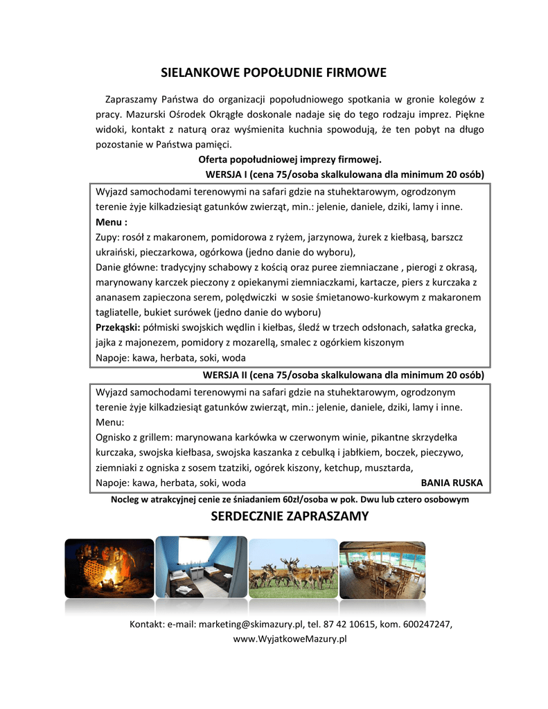 SIELANKOWE POPOŁUDNIE FIRMOWE Zapraszamy Państwa do organizacji popołudniowego spotkania w gronie kolegów z pracy. Mazurski Ośrodek Okrągłe doskonale nadaje się do tego rodzaju imprez. Piękne widoki, kontakt z naturą oraz wyśmienita kuchnia spowodują, że ten pobyt na długo pozostanie w Państwa pamięci. Oferta popołudniowej imprezy firmowej. WERSJA I (cena 75/osoba skalkulowana dla minimum 20 osób) Wyjazd samochodami terenowymi na safari gdzie na stuhektarowym, ogrodzonym terenie żyje kilkadziesiąt gatunków zwierząt, min.: jelenie, daniele, dziki, lamy i inne. Menu : Zupy: rosół z makaronem, pomidorowa z ryżem, jarzynowa, żurek z kiełbasą, barszcz ukraiński, pieczarkowa, ogórkowa (jedno danie do wyboru), Danie główne: tradycyjny schabowy z kością oraz puree ziemniaczane , pierogi z okrasą, marynowany karczek pieczony z opiekanymi ziemniaczkami, kartacze, piers z kurczaka z ananasem zapieczona serem, polędwiczki w sosie śmietanowo-kurkowym z makaronem tagliatelle, bukiet surówek (jedno danie do wyboru) Przekąski: półmiski swojskich wędlin i kiełbas, śledź w trzech odsłonach, sałatka grecka, jajka z majonezem, pomidory z mozarellą, smalec z ogórkiem kiszonym Napoje: kawa, herbata, soki, woda WERSJA II (cena 75/osoba skalkulowana dla minimum 20 osób) Wyjazd samochodami terenowymi na safari gdzie na stuhektarowym, ogrodzonym terenie żyje kilkadziesiąt gatunków zwierząt, min.: jelenie, daniele, dziki, lamy i inne. Menu: Ognisko z grillem: marynowana karkówka w czerwonym winie, pikantne skrzydełka kurczaka, swojska kiełbasa, swojska kaszanka z cebulką i jabłkiem, boczek, pieczywo, ziemniaki z ogniska z sosem tzatziki, ogórek kiszony, ketchup, musztarda, Napoje: kawa, herbata, soki, woda BANIA RUSKA Nocleg w atrakcyjnej cenie ze śniadaniem 60zł/osoba w pok. Dwu lub cztero osobowym SERDECZNIE ZAPRASZAMY Kontakt: e-mail: [email protected], tel. 87 42 10615, kom. 600247247, www.WyjatkoweMazury.pl