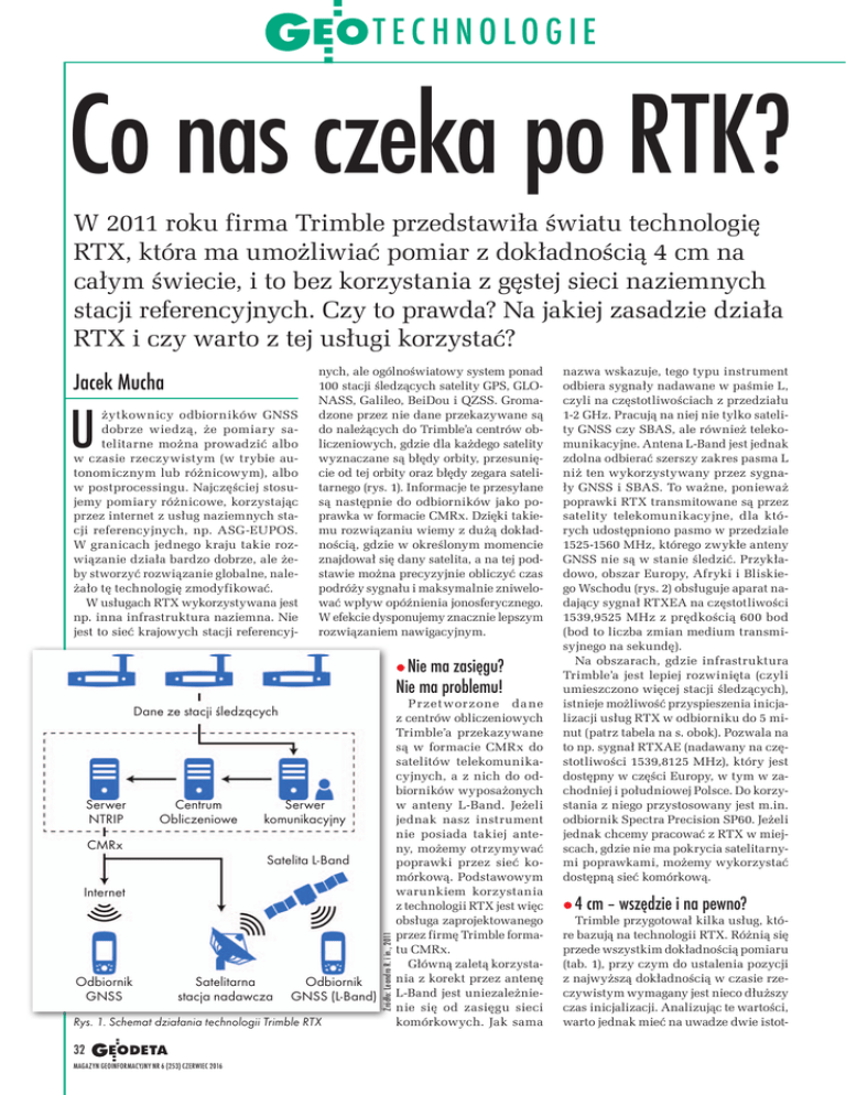 TECHNOLOGIE Co nas czeka po RTK? W 2011 roku firma Trimble przedstawiła światu technologię RTX, która ma umożliwiać pomiar z dokładnością 4 cm na całym świecie, i to bez korzystania z gęstej sieci naziemnych stacji referencyjnych. Czy to prawda? Na jakiej zasadzie działa RTX i czy warto z tej usługi korzystać? Jacek Mucha U żytkownicy odbiorników GNSS dobrze wiedzą, że pomiary satelitarne można prowadzić albo w czasie rzeczywistym (w trybie autonomicznym lub różnicowym), albo w postprocessingu. Najczęściej stosujemy pomiary różnicowe, korzystając przez internet z usług naziemnych stacji referencyjnych, np. ASG-EUPOS. W granicach jednego kraju takie rozwiązanie działa bardzo dobrze, ale żeby stworzyć rozwiązanie globalne, należało tę technologię zmodyfikować. W usługach RTX wykorzystywana jest np. inna infrastruktura naziemna. Nie jest to sieć krajowych stacji referencyj- nych, ale ogólnoświatowy system ponad 100 stacji śledzących satelity GPS, GLONASS, Galileo, BeiDou i QZSS. Gromadzone przez nie dane przekazywane są do należących do Trimble’a centrów obliczeniowych, gdzie dla każdego satelity wyznaczane są błędy orbity, przesunięcie od tej orbity oraz błędy zegara satelitarnego (rys. 1). Informacje te przesyłane są następnie do odbiorników jako poprawka w formacie CMRx. Dzięki takiemu rozwiązaniu wiemy z dużą dokładnością, gdzie w określonym momencie znajdował się dany satelita, a na tej podstawie można precyzyjnie obliczyć czas podróży sygnału i maksymalnie zniwelować wpływ opóźnienia jonosferycznego. W efekcie dysponujemy znacznie lepszym rozwiązaniem nawigacyjnym. Nie ma zasięgu? Nie ma problemu! l Dane ze stacji śledzących Serwer NTRIP Centrum Obliczeniowe CMRx Serwer komunikacyjny Satelita L-Band Odbiornik GNSS Satelitarna stacja nadawcza Odbiornik GNSS (L-Band) Rys. 1. Schemat działania technologii Trimble RTX 32 MAGAZYN geoinformacYJNY nr 6 (253) CZERWIEC 2016 Źródło: Leandro R. i in., 2011 Internet P rzet worzone da ne z centrów obliczeniowych Trimble’a przekazywane są w formacie CMRx do satelitów telekomunikacyjnych, a z nich do odbiorników wyposażonych w anteny L-Band. Jeżeli jednak nasz instrument nie posiada takiej anteny, możemy otrzymywać poprawki przez sieć komórkową. Podstawowym warunkiem korzystania z technologii RTX jest więc obsługa zaprojektowanego przez firmę Trimble formatu CMRx. Główną zaletą korzystania z korekt przez antenę L-Band jest uniezależnienie się od zasięgu sieci komórkowych. Jak sama nazwa wskazuje, tego typu instrument odbiera sygnały nadawane w paśmie L, czyli na częstotliwościach z przedziału 1-2 GHz. Pracują na niej nie tylko satelity GNSS czy SBAS, ale również telekomunikacyjne. Antena L-Band jest jednak zdolna odbierać szerszy zakres pasma L niż ten wykorzystywany przez sygnały GNSS i SBAS. To ważne, ponieważ poprawki RTX transmitowane są przez satelity telekomunikacyjne, dla których udostępniono pasmo w przedziale 1525-1560 MHz, którego zwykłe anteny GNSS nie są w stanie śledzić. Przykładowo, obszar Europy, Afryki i Bliskiego Wschodu (rys. 2) obsługuje aparat nadający sygnał RTXEA na częstotliwości 1539,9525 MHz z prędkością 600 bod (bod to liczba zmian medium transmisyjnego na sekundę). Na obszarach, gdzie infrastruktura Trimble’a jest lepiej rozwinięta (czyli umieszczono więcej stacji śledzących), istnieje możliwość przyspieszenia inicjalizacji usług RTX w odbiorniku do 5 minut (patrz tabela na s. obok). Pozwala na to np. sygnał RTXAE (nadawany na częstotliwości 1539,8125 MHz), który jest dostępny w części Europy, w tym w zachodniej i południowej Polsce. Do korzystania z niego przystosowany jest m.in. odbiornik Spectra Precision SP60. Jeżeli jednak chcemy pracować z RTX w miejscach, gdzie nie ma pokrycia satelitarnymi poprawkami, możemy wykorzystać dostępną sieć komórkową. l 4 cm – wszędzie i na pewno? Trimble przygotował kilka usług, które bazują na technologii RTX. Różnią się przede wszystkim dokładnością pomiaru (tab. 1), przy czym do ustalenia pozycji z najwyższą dokładnością w czasie rzeczywistym wymagany jest nieco dłuższy czas inicjalizacji. Analizując te wartości, warto jednak mieć na uwadze dwie istot- RTXEN 1557,8590 MHz 600 bod RTXSA 1539,8325 MHz 600 bod RTXEA 1539,9525 MHz 600 bod RTXAE 1539,8125 MHz 2400 bod RTXAP 1539,8325 MHz 600 bod Rys. 2. Mapa zasięgu poprawek RTX transmitowanych przez satelity ne kwestie. Po pierwsze, w przypadku technologii RTX możliwy jest szybki restart odbiornika. Jeżeli od wyłączenia instrument nie zmieniał swojego położenia, a do określenia ostatniej pozycji użyto RTX-a, wówczas czas inicjalizacji po włączeniu będzie bardzo krótki. Po drugie, wprowadzono zabezpieczenie przed niepożądaną ponowną inicjalizacją (Briding feature). Jeżeli więc odbiornik chwilowo utraci widoczność satelitów telekomunikacyjnych (np. przy wejściu pod most), zachowywane są ostatnie poprawki i nie jest rozpoczynana ponowna inicjalizacja, która mogłaby potrwać następne 30 minut. Po wznowieniu kontaktu z satelitą poprawki są przesyłane dalej. Poza pracą w czasie rzeczywistym technologia RTX oferuje także usługę postprocessingu. Jest ona darmowa dla wszystkich użytkowników zarejestrowanych na stronie trimblertx.com i oferuje dokładność pomiaru sięgającą 2 cm w poziomie. Do skorzystania z niej wystarczy zebrać dane statyczne i wysłać je do firmy Trimble przez stronę rtx-pp. com lub przez aplikację mobilną. Wymagania dla plików są następujące: l zapis w odbiorniku dwuczęstotliwościowym (na liście obsługiwanych są m.in. Spectra Precision: SP60, SP80, ProMark 700, Epoch 50, MobileMapper 300), l obserwacje statyczne i prowadzone przez minimum godzinę, l format danych zgodny ze standardem RINEX w wersji 2 lub 3 (bądź nowszej), l maksymalna częstotliwość zapisu danych to 1 Hz. Da