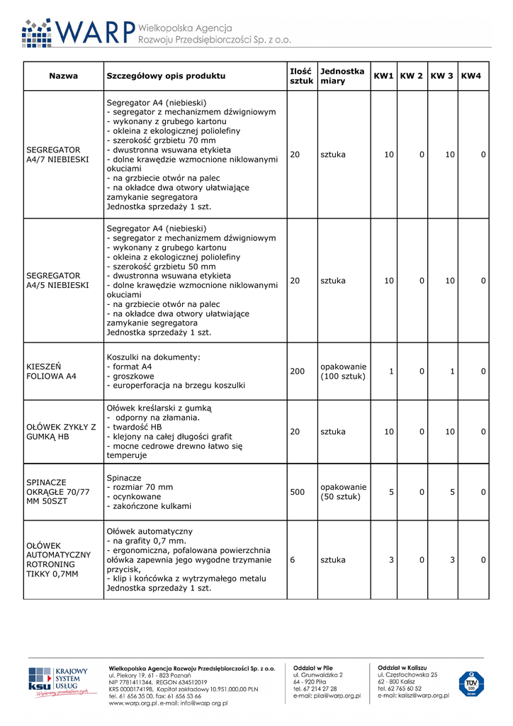 Nazwa Szczegółowy opis produktu Ilość sztuk Jednostka miary KW1
