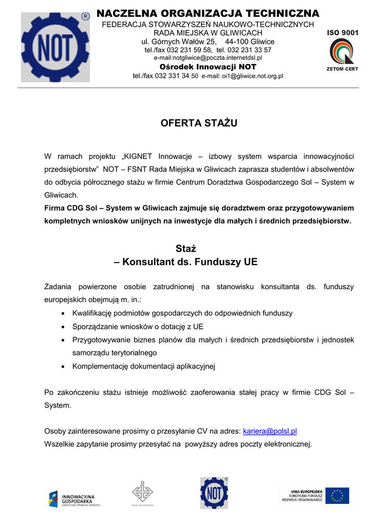 NACZELNA ORGANIZACJA TECHNICZNA FEDERACJA STOWARZYSZEŃ NAUKOWO-TECHNICZNYCH RADA MIEJSKA W GLIWICACH ul. Górnych Wałów 25, 44-100 Gliwice ISO 9001 tel./fax 032 231 59 58, tel. 032 231 33 57 e-mail:[email protected] Ośrodek Innowacji NOT ZETOM-CERT tel./fax 032 331 34 50 e-mail: [email protected] OFERTA STAŻU W ramach projektu „KIGNET Innowacje – izbowy system wsparcia innowacyjności przedsiębiorstw” NOT – FSNT Rada Miejska w Gliwicach zaprasza studentów i absolwentów do odbycia półrocznego stażu w firmie Centrum Doradztwa Gospodarczego Sol – System w Gliwicach. Firma CDG Sol – System w Gliwicach zajmuje się doradztwem oraz przygotowywaniem kompletnych wniosków unijnych na inwestycje dla małych i średnich przedsiębiorstw. Staż – Konsultant ds. Funduszy UE Zadania powierzone osobie zatrudnionej na stanowisku konsultanta ds. funduszy europejskich obejmują m. in.: Kwalifikację podmiotów gospodarczych do odpowiednich funduszy Sporządzanie wniosków o dotację z UE Przygotowywanie biznes planów dla małych i średnich przedsiębiorstw i jednostek samorządu terytorialnego Komplementację dokumentacji aplikacyjnej Po zakończeniu stażu istnieje możliwość zaoferowania stałej pracy w firmie CDG Sol – System. Osoby zainteresowane prosimy o przesyłanie CV na adres: [email protected] Wszelkie zapytanie prosimy przesyłać na powyższy adres poczty elektronicznej.