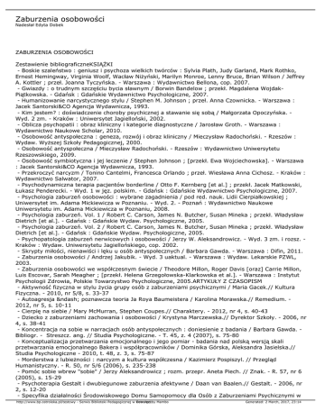 Zaburzenia osobowości Nadesłał Edyta Dobek ZABURZENIA OSOBOWOŚCI Zestawienie bibliograficzneKSIĄŻKI - Boskie szaleństwo : geniusz i psychoza wielkich twórców : Sylvia Plath, Judy Garland, Mark Rothko, Ernest Hemingway, Virginia Woolf, Wacław Niżyński, Marilyn Monroe, Lenny Bruce, Brian Wilson / Jeffrey A. Kottler ; przeł. Joanna Tyczyńska. - Warszawa : Wydawnictwo Bellona, cop. 2007. - Gwiazdy : o trudnym szczęściu bycia sławnym / Borwin Bandelow ; przekł. Magdalena WojdakPiątkowska. - Gdańsk : Gdańskie Wydawnictwo Psychologiczne, 2007. - Humanizowanie narcystycznego stylu / Stephen M. Johnson ; przeł. Anna Czownicka. - Warszawa : Jacek Santorski&CO Agencja Wydawnicza, 1993. - Kim jestem? : doświadczenie choroby psychicznej a stawanie się sobą / Małgorzata Opoczyńska. Wyd. 2 zm. - Kraków : Uniwersytet Jagielloński, 2002. - Oblicza psychopatii : obraz kliniczny i kategorie diagnostyczne / Jarosław Groth. - Warszawa : Wydawnictwo Naukowe Scholar, 2010. - Osobowość antyspołeczna : geneza, rozwój i obraz kliniczny / Mieczysław Radochoński. - Rzeszów : Wydaw. Wyższej Szkoły Pedagogicznej, 2000. - Osobowość antyspołeczna / Mieczysław Radochoński. - Rzeszów : Wydawnictwo Uniwersytetu Rzeszowskiego, 2009. - Osobowość symbiotyczna i jej leczenie / Stephen Johnson ; [przekł. Ewa Wojciechowska]. - Warszawa : Jacek Santorski&CO Agencja Wydawnicza, 1993. - Przekroczyć narcyzm / Tonino Cantelmi, Francesca Orlando ; przeł. Wiesława Anna Cichosz. - Kraków : Wydawnictwo Salwator, 2007. - Psychodynamiczna terapia pacjentów borderline / Otto F. Kernberg [et al.] ; przekł. Jacek Matkowski, Łukasz Penderecki. - Wyd. 1 w jęz. polskim. - Gdańsk : Gdańskie Wydawnictwo Psychologiczne, 2007. - Psychologia zaburzeń osobowości : wybrane zagadnienia / pod red. nauk. Lidii Cierpiałkowskiej ; Uniwersytet im. Adama Mickiewicza w Poznaniu. - Wyd. 2. - Poznań : Wydawnictwo Naukowe Uniwersytetu im. Adama Mickiewicza w Poznaniu, 2008. - Psychologia zaburzeń. Vol. 1 / Robert C. Carson, James N. Butcher, Susan Mineka ; przekł. Władysław Dietrich [et al.]. - Gdańsk : Gdańskie Wydaw. Psychologiczne, 2005. - Psychologia zaburzeń. Vol. 2 / Robert C. Carson, James N. Butcher, Susan Mineka ; przekł. Władysław Dietrich [et al.]. - Gdańsk : Gdańskie Wydaw. Psychologiczne, 2005. - Psychopatologia zaburzeń nerwicowych i osobowości / Jerzy W. Aleksandrowicz. - Wyd. 3 zm. i rozsz. Kraków : Wydaw. Uniwersytetu Jagiellońskiego, cop. 2002. - Skrypty miłości, nienawiści i lęku u osób antyspołecznych / Barbara Gawda. - Warszawa : Difin, 2011. - Zaburzenia osobowości / Andrzej Jakubik. - Wyd. 3 uaktual. - Warszawa : Wydaw. Lekarskie PZWL, 2003. - Zaburzenia osobowości we współczesnym świecie / Theodore Millon, Roger Davis [oraz] Carrie Millon, Luis Escovar, Sarah Meagher ; [przekł. Helena Grzegołowska-Klarkowska et al.]. - Warszawa : Instytut Psychologii Zdrowia, Polskie Towarzystwo Psychologiczne, 2005.ARTYKUŁY Z CZASOPISM - Aktywność fizyczna w stylu życia grupy osób z zaburzeniami psychicznymi / Maria Gacek.// Kultura Fizyczna. - 2010, nr 5/8, s. 33-37 - Autoagresja – poznawcza teoria Ja Roya Baumeistera / Karolina Morawska.// Remedium. 2012, nr 5, s. 10-11 - Cierpię na siebie / Mary McMurran, Stephen Coupes.// Charaktery. - 2012, nr 4, s. 40-43 - Dziecko z zaburzeniami zachowania i osobowości / Krystyna Marczewska.// Dyrektor Szkoły. - 2006, nr 4, s. 38-41 - Koncentracja na sobie w narracjach osób antyspołecznych : doniesienie z badania / Barbara Gawda. Bibliogr. - Streszcz. ang. // Studia Psychologiczne. - T. 45, z. 4 (2007), s. 75-80 - Konceptualizacja przetwarzania emocjonalnego i jego pomiar - badania nad polską wersją skali przetwarzania emocjonalnego Bakera i współpracowników / Dominika Górska, Aleksandra Jasielska.// Studia Psychologiczne - 2010, t. 48, z. 3, s. 75-87 - Morderstwa z lubieżności : narcyzm a kultura współczesna / Kazimierz Pospiszyl. // Przegląd Humanistyczny. - R. 50, nr 5/6 (2006), s. 235-238 - Pomóc sobie wbrew "sobie" / Jerzy Aleksandrowicz ; rozm. przepr. Aneta Piech. // Znak. - R. 57, nr 6 (2005), s. 15-29 - Psychoterapia Gestalt i dwubiegunowe zaburzenia afektywne / Daan van Baalen.// Gestalt. - 2006, nr 2, s. 12-20 - Specyfika działalności Środowiskowego Domu Samopomocy dla Osób z Zaburzeniami Psychicznymi w http://www.bp.ostroleka.pl/testowy - Serwis Biblioteki Pedagogicznej w Ostrołęce Powered by Mambo Generated: 2 March, 2017, 23:14 Opolu / Waldemar Maciaszczyk.// Biblioterapeuta. - 2006, nr 1, s. 12-13 - Teatr otwarty jako forma pracy z osobami po ciężkich kryzysach psychicznych / Barbara Czarnacka, Sebastian Szczypiński.// Gestalt. - 2006, nr 1, s. 29-33 - Tożsamość w sieci – w sieci tożsamości / Anna Łuczak, Bruno A.Mańczak, Adam Surdyk.// Remedium. - 2011, nr 10, s. 26-27 - Urojone oszustwa / Birgit Spinath ; tł. Paweł Brysacz.// Charaktery. - 2010, nr 3, s. 44-46 - W oddaleniu od zdrowia / Elżbieta Sadowska.// Biblioterapeuta. - 2006, nr 1, s. 10-12 - Warsztaty twórcze w resocjalizacji skazanych z niepsychotycznymi zaburzeniami osobowości / Janina Florczykiewicz.// Szkoła Specjalna. - 2012, nr 2, s. 121-128 http://www.bp.ostroleka.pl/testowy - Serwis Biblioteki Pedagogicznej w Ostrołęce Powered by Mambo Generated: 2 March, 2017, 23:14