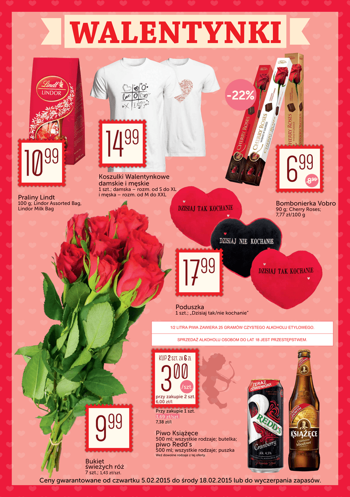 WALENTYNKI -22% 10 99 Praliny Lindt 14 99 6 99 Koszulki Walentynkowe damskie i męskie 1 szt.; damska – rozm. od S do XL i męska – rozm. od M do XXL 899 Bombonierka Vobro 100 g; Lindor Assorted Bag, Lindor Milk Bag 90 g; Cherry Roses; 7,77 zł/100 g 17 99 Poduszka 1 szt.; „Dzisiaj tak/nie kochanie” 1/2 LITRA PIWA ZAWIERA 25 GRAMÓW CZYSTEGO ALKOHOLU ETYLOWEGO. SPRZEDAŻ ALKOHOLU OSOBOM DO LAT 18 JEST PRZESTĘPSTWEM. KUP 2 szt. za 6 zł 3 00 /szt. przy zakupie 2 szt. 6,00 zł/l 9 99 Przy zakupie 1 szt. 3,69 zł/szt. 7,38 zł/l Piwo Książęce 500 ml; wszystkie rodzaje; butelka; piwo Redd’s 500 ml; wszystkie rodzaje; puszka Weź dowolne rodzaje z tej oferty. Bukiet świeżych róż 7 szt.; 1,43 zł/szt. Ceny gwarantowane od czwartku 5.02.2015 do środy 18.02.2015 lub do wyczerpania zapasów.