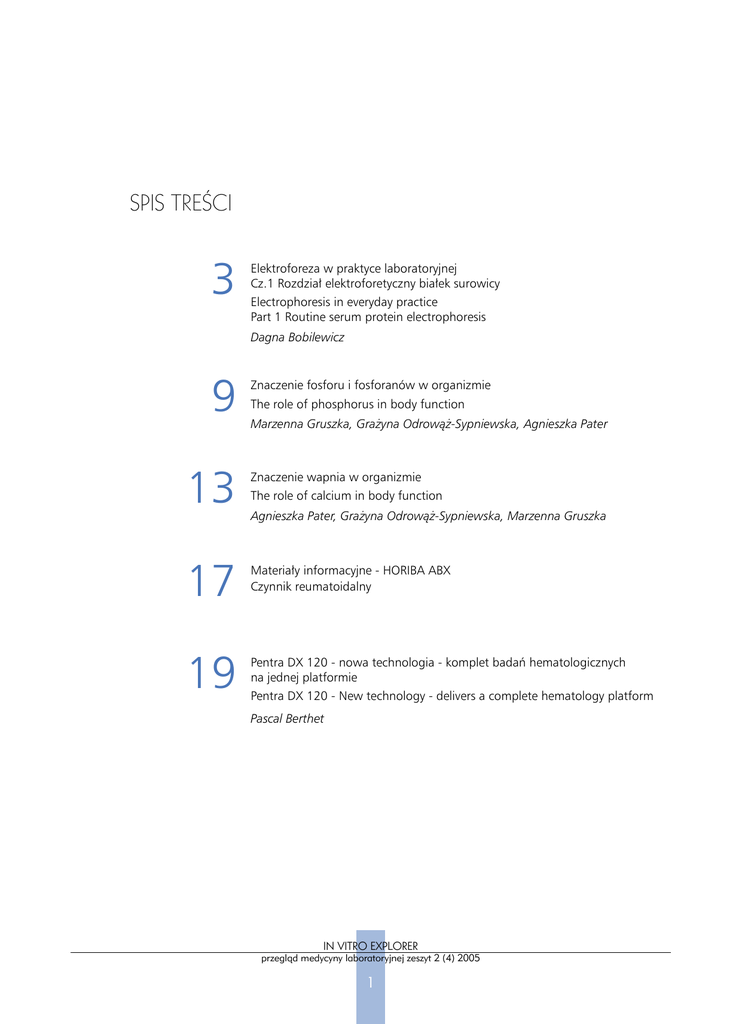 SPIS TREŚCI 3 Elektroforeza w praktyce laboratoryjnej Cz.1 Rozdział elektroforetyczny białek surowicy Electrophoresis in everyday practice Part 1 Routine serum protein electrophoresis Dagna Bobilewicz 9 Znaczenie fosforu i fosforanów w organizmie The role of phosphorus in body function Marzenna Gruszka, Grażyna Odrowąż-Sypniewska, Agnieszka Pater 13 Znaczenie wapnia w organizmie The role of calcium in body function 17 Materiały informacyjne - HORIBA ABX Czynnik reumatoidalny 19 Agnieszka Pater, Grażyna Odrowąż-Sypniewska, Marzenna Gruszka Pentra DX 120 - nowa technologia - komplet badań hematologicznych na jednej platformie Pentra DX 120 - New technology - delivers a complete hematology platform Pascal Berthet IN VITRO EXPLORER przegląd medycyny laboratoryjnej zeszyt 2 (4) 2005 1 Wydawca IN VITRO EXPLORER HORIBA ABX Sp. z o.o. Wał Miedzeszyński 598, 03-994 Warszawa, +48 (22) 673 20 22, +48 (22) 673 20 26 Redaktor koordynujący: dr Beata Olszewska, e-mail: [email protected] Zasady publikowania prac w IN VITRO EXPLORER do wglądu u dr Beaty Olszewskiej Redakcja: Maria Domagała, Marta Domagała Projekt graficzny: Aleksandra Król Skład i łamanie: Zych Studio ISSN 1732-9752 Nakład: 1500 egz. lipiec 2005 IN VITRO EXPLORER przegląd medycyny laboratoryjnej zeszyt 2 (4) 2005 2 clinical chemistry line ELEKTROFOREZA W PRAKTYCE LABORATORYJNEJ CZ.1 ROZDZIAŁ ELEKTROFORETYCZNY BIAŁEK SUROWICY ELECTROPHORESIS IN EVERYDAY PRACTICE PART 1 ROUTINE SERUM PROTEIN ELECTROPHORESIS Dagna Bobilewicz Streszczenie Rozdział elektroforetyczny białek surowicy na podłożu agarozowym pozwala na uzyskanie 5 głównych frakcji, w tym jednorodnej frakcji albumin i heterogennych globulin. Automatyzacja procesu umożliwia otrzymanie wyraźnych obrazów informujących nie tylko o zmianach w ramach poszczególnych frakcji, ale również o ogólnym stanie białek surowicy. Elektroforeza nie określa stężeń poszczególnych białek ani ich nie identyfikuje, lecz stanowi wstępny etap do dalszej diagnostyki. Słowa kluczowe elektroforeza białek surowicy, agaroza, systemy automatyczne. Summary Serum protein electrophoresis on agarose medium enables distinction of 5 main fraction among them homogenous albumin and heterogeneous globulins. Thanks to process automation bands are clearly separated and visible and provide information not only about changes within fraction but also those regarding the general protein pattern. Electrophoresis neither gives results for individual proteins nor identifies them but indicates the direction for further diagnostic process. Keywords serum protein electrophoresis, agarose, automatic systems. Białka są drugim po wodzie komponentem ustroju pozwala uniknąć tzw. etapu przejaśniania, charakte- ludzkiego, stąd możliwości oceny poszczególnych ich rystycznego dla octanu celulozy. Duże perspektywy ma składników budziły zainteresowanie od chwili poznania elektroforeza kapilarna, która rozwija się równolegle ich roli tak w procesach fizjologicznych, jak i w rozwoju do istniejących technik (2, 3). patologii. Już w 1878 roku francuski chemik Mehu Terminem elektroforeza określa się zjawisko migracji przedstawił propozycję oznaczeń albumin. Następny cząstek lub cząsteczek w polu elektrycznym w zależ- krok to rozdzielanie albumin od globulin przy za- ności od posiadanego ładunku. Elektroforeza stoso- stosowaniu siarczanu amonu. W roku 1930 Tiselius wana do podstawowego rozdziału białek (tzw. zone wprowadził klasyczną technikę rozdziału frakcji biał- electrophoresis) to zachodzący w porowatym podłożu kowych w polu elektrycznym, jednak użycie płynnego jednoczesny rozdział na poszczególne frakcje. Cząstki podłoża i skomplikowanej aparatury uniemożliwiało o ładunku dodatnim poruszają się w kierunku anody, wprowadzenie metody do badań rutynowych. Dopiero ujemne zaś w kierunku katody, natomiast ruchliwość w latach 60. XX wieku elektroforeza stała się częścią amfolitów (substancje mogące przybierać ładunek oznaczeń białkowych w laboratoriach medycznych, bądź dodatni, bądź ujemny; można do nich zaliczyć przechodząc kolejne stadia od rozdziałów prowa- białka ze względu na to, że posiadają zarówno grupy dzonych na bibule, poprzez używany do dziś jako aminowe, jak i karboksylowe) zależy od pH podłoża. nośnik octan celulozy, po żel agarozowy, który zyskał W środowisku kwaśnym o niższym pH niż ich punkt popularność. Jest on szeroko stosowany ze względu izoelektryczny mają one ładunek dodatni, w zasado- na dobre obrazy, a także swoją przeźroczystość, która wym przyjmują ładunek ujemny i migrują w kierunku IN VITRO EXPLORER przegląd medycyny laboratoryjnej zeszyt 2 (4) 2005 3 clinical chemistry line anody. Szybkość migracji zależy od: białko monoklonalne. W przypadku wątpliwości zaleca ładunku cząstki się nawet dodatkowe wykrzepienie surowicy przy użyciu wielkości i kształtu cząstki trombiny. siły elektrycznej pola (volt/cm) Zakresy wartości prawidłowych podawane przez producen- temperatury rozdziału tów jak również przez różnych autorów w piśmiennictwie właściwości nośnika. powinny być zweryfikowane przez laboratorium, które Szybkość migracji jest wprost proporcjonalna do ła- również powinno mieć wyliczone współczynniki zmienności dunku i odwrotnie proporcjonalna do wielkości cząstki dla nieprecyzji w odniesieniu do poszczególnych frakcji i lepkości podłoża. Istnieje również szereg innych (1, 2). Zgodnie z danymi z piśmiennictwa współczynnik czynników wpływających na migrację. zmienności dla oznaczeń w serii (na jednej płytce) wynosi Agaroza, najpopularniejszy nośnik stosowany w elektro- od 1% dla albumin do 4,5% dla betaglobulin, a między forezie białek, jest frakcją agaru i stosowana w niskich seriami (z dnia na dzień) odpowiednio od 2,1 do 7,3% (1). stężeniach (05-1%) tworzy duże pory, pozwalające na Doświadczenia własne 