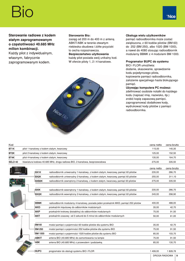 Bio Sterowanie radiowe z kodem sta³ym zaprogramowanym o czêstotliwoœci 40.685 MHz milion kombinacji. Ka¿dy pilot z indywidualnym, w³asnym, fabrycznie zaprogramowanym kodem. Sterowanie Bio: zasiêg od 200 m do 400 m z anten¹ ABKIT/ABK w terenie otwartym niebieska obudowa i ¿ó³te przyciski to cecha rozpoznawcza. Bezpieczeñstwo u¿ytkowania ka¿dy pilot posiada swój unikalny kod. W ofercie piloty 1, 2 i 4 kana³owe. Obs³uga wielu u¿ytkowników pamiêæ radioodbiornika mo¿e zostaæ zwiêkszona, z 60 kodów pilotów (BM 60) do 252 (BM 250), albo 1020 (BM 1000), a nawet do 4080 stosuj¹c radioodbiornik modularny BBMK z 4 modu³ami BM 1000. Programator BUPC do systemu BIO i FLOR umo¿liwia: dodanie, skasowanie, sprawdzenie kodu pojedynczego pilota, kopiowanie pamiêci radioodbiornika, za³o¿enie specjalnego has³a blokuj¹cego pamiêæ. U¿ywaj¹c komputera PC mo¿esz: zdefiniowaæ osobiste notatki do ka¿dego kodu (napisaæ imiê, nazwisko, itp.) zrobiæ kopiê zapasow¹ pamiêci, zaprogramowaæ dodatkowe kody, wydrukowaæ kody pilotów z pamiêci radioodbiornika. cena netto cena brutto BT1K pilot 1-kana³owy z kodem sta³ym, kwarcowy 115,00 140,30 BT2K pilot 2-kana³owy z kodem sta³ym, kwarcowy 125,00 152,50 BT4K pilot 4-kana³owy z kodem sta³ym, kwarcowy 135,00 164,70 SELD 40 klawiatura kodowa 40.685 MHz, droga radiowa BIO, 2-kana³owa, bezprzewodowa 275,00 335,50 Kod cena netto cena brutto BX1K radioodbiornik uniwersalny 1-kana³owy, z kodem sta³ym, kwarcowy, pamiêæ 60 pilotów 235,00 286,70 BX2K radioodbiornik uniwersalny 2-kana³owy, z kodem sta³ym, kwarcowy, pamiêæ 60 pilotów 255,00 311,10 BXB2K radioodbiornik zewnêtrzny 2-kana³owy, z kodem sta³ym, kwarcowy, pamiêæ 60 pilotów 275,00 335,50 BXIK radioodbiornik wewnêtrzny 1-kana³owy, z kodem sta³ym, kwarcowy, pamiêæ 60 pilotów 235,00 286,70 BXI2K radioodbiornik wewnêtrzny 2-kana³owy, z kodem sta³ym, kwarcowy, pamiêæ 60 pilotów 245,00 298,90 BBMK radioodbiornik modularny 4-kana³owy, posiada jeden przekaŸnik MXD, pamiêæ 252 pilotów 400,00 488,00 MXD przekaŸnik impulsowy do odbiorników modularnych 35,00 42,70 MXP przekaŸnik krokowy (bistabilny) do odbiorników modularnych 75,00 91,50 MXT przekaŸnik czasowy od 3 sekund do 5 minut do odbiorników modularnych 50,00 61,00 BM 60 modu³ pamiêci o pojemnoœci 60 kodów pilotów dla systemu BIO 35,00 42,70 BM 250 modu³ pamiêci o pojemnoœci 252 kodów pilotów dla systemu BIO 75,00 91,50 BM 1000 modu³ pamiêci o pojemnoœci 1020 kodów pilotów dla systemu BIO 85,00 103,70 ABKIT antena BIO (40.685 MHz) do zamontowania na lampie 75,00 91,50 ABK antena BIO (40.685 MHz) z przewodem i podstawk¹ 85,00 130,70 BUPC programator do obs³ugi systemu BIO i FLOR 1 499,00 1 828,78 DROGA RADIOWA 9