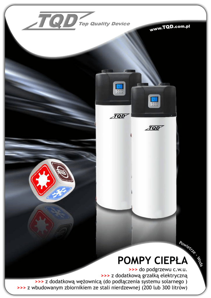 POMPY CIEPŁA >>> do podgrzewu c.w.u. >>> z dodatkową grzałką elektryczną >>> z dodatkową wężownicą (do podłączenia systemu solarnego ) >>> z wbudowanym zbiornikiem ze stali nierdzewnej (200 lub 300 litrów) Cechy ogólne pomp ciepła serii GT: Przykłady zastosowań Odzysk ciepła + wentylacja Zbiornik ze stali nierdzewnej o pojemności 200 lub 300 litrów Dodatkowa wężownica do podłączenia systemu solarnego Dodatkowa grzałka elektryczna o mocy 2 kW Serce pompy ciepła - kompresor - światowej klasy producenta Elektronicznie sterowany zawór rozprężny Anoda magnezowa Wielosezonowa praca Różne możliwości wykorzystania urządzenia w zależności od umiejscowienia (wentylacja pomieszczeń, chłodzenie, odzysk ciepła, osuszanie) Możliwość wykorzystania powstałego powietrza chłodnego (podczas podgrzewania c.w.u). Patrz przykłady zastosowań. Ochrona przed przegrzaniem, ochrona przeciwzamrożeniowa Praca automatyczna dzięki panelowi sterującemu Odzysk ciepła Odzysk ciepła + osuszanie Wylot powietrza (Φ zew.160mm) Wlot powietrza (Φ zew. 160mm) Pokrywa z tworzywa sztucznego Panel sterujący Odpływ skroplin Odzysk ciepła + osuszanie Wylot ciepłej wody Wejście systemu solarnego Zbiornik ze stali nierdzewnej (obudowa ze stali emaliowanej) Grzałka elektryczna Wyjście systemu solarnego Anoda magnezowa Rączka Odzysk ciepła + chłodzenie Przewód zasilający Wlot zimnej wody Spust wody Pojemność zbiornika Zasilanie elektryczne Moc grzewcza Natężenie prądu Pobór mocy Moc grzałki elektrycznej Maksymalne natężenie prądu z grzałką Maksymalny pobór mocy z grzałką Maksymalne ciśnienie tłoczenia spręż. Maksymalne ciśnienie ssania spręż. Maksymalne ciśnienie robocze wymiennika Dopuszczalne ciśnienie systemu Czynnik chłodniczy Stopień ochrony Poziom ochrony elektrycznej Wymagania dot. uziemienia Waga netto Wymiary Średnice króćców wodnych Poziom hałasu Temperatura otoczenia TQD GT 200 TQD GT 300 200 litrów 300 litrów 220-240V ~, 50Hz 220-240V ~, 50Hz 3,2 kW 3,2 kW 4,3 A 4,3 A 0,9 kW 0,9 kW 2,0 kW 2,0 kW 14,6 A 14,6 A 3,2 kW 3,2 kW 3,5 MPa 3,5 MPa 1,0 MPa 1,0 MPa 3,5 MPa 3,5 MPa 3,5 MPa 3,5 MPa R407C / 0,85 kg R407C / 0,85 kg IPX0 IPX0 I I <=0,1Ω <=0,1Ω 78 kg Φ 550 Φ 550 xx 1820mm 1820mm 3/4” 50dB(A) o -10~43 C 93 kg Φ 650 x 2000mm 3/4” 50dB(A) o -10~43 C Parametry wentylatora: 3 Max moc: 142 [W], Max pobór prądu: 0,64 [A], Max wydajność: 730 [m /h], 3 Max spręż: 190 Pa (przy wydajności 300m /h). Max sumaryczna długość kanałów wentylacyjnych (nawiew + wywiew): 25m Warunki testu urządzenia: o o o o Temperatura otoczenia 20 C/15 C; Temperatura wody (wlot / wylot): 15 C/55 C - Funkcja “timer” (auto włączanie / wyłączanie). - Nastawy / pomiar temperatury wody - Pomiar temperatury otoczenia - Sterowanie dodatkowym źródłem ogrzewania. - Sterowanie grzałką elektryczną. - Automatyczne okresowe rozmrażanie. - Sterowanie procesem okresowej sterylizacji zbiornika wysoką temperaturą. Kompresor TOSHIBA (solidny, cichy, oszczędny) Elektroniczny zawór rozprężny Zwór 4-drożny Czujnik niskiego i wysokiego ciśnienia Amortyzatory łap kompresora (brak przenoszenia wibracji) Elektroniczny system diagnozy błędów (kody błędów wyświetlane na panelu sterującym i płycie głównej) System ochrony kompresora System ochrony zamrożeniowej Ochrona przed przegrzaniem www.TQD.com.pl