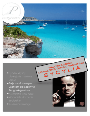 • Sycylia, Wyspy Liparyjskie majówka 2016! • Rejs komfortowym yachtem połączony z Tango Argentino • Atrakcyjna trasa rejsu • Wspaniałe doznania żeglarskie • Cudowne wakacje C 16!!! HTING 0 2 wka O YAC ó j ma ANG T E ON E L OR S Y C Y A I L Leszek & Magdalena zapraszają na TangoYachting Sycylia, Portorosa,30 kwietnia - 7maja 2016, Marina di Portorosa Oferujemy w cenie • Wakacyjny rejs luksusowym yachtem we wspaniałej atmosferze • Opiekę Skippera • Dla chętnych, podczas rejsu 3 dni po 3h praktyki Tango Argentino przy restauracjach portowych, w lagunach lub na plaży • W zależności od pogody oraz chęci uczestników możliwa dodatkowa praktyka taneczna • Wspaniałe doznania żeglarskie, interesujący plan rejsu, kąpiele w morzu, być może z delfinami, pogodna atmosfera, wakacyjny relaks, popołudniowe/wieczorne przybijanie do marin lub na kotwicowiska w zatokach urokliwych wysp • Kameralne grono - Magda i Leszek oraz 6 Uczestników, co gwarantuje swobodę i komfort podczas rejsu oraz przy doskonaleniu Tango Zapewniamy w cenie • Zakwaterowanie na wygodnym yachcie 8 osobowym w kajutach 2 osobowych • Wyżywienie na yachcie - zdrowe, wegetariańskie posiłki, które załoga wspólnie przygotowuje na yachcie wg planu dnia z poczynionych wspólnie zakupów spożywczych z części pieniędzy zawartych w cenie za rejs. • Opłaty portowe, paliwo i wodę do yachtu • Pościel na yachcie, sprzątanie końcowe • Ubezpieczenie OC • Bezpieczne i luksusowe warunki wakacyjnego relaksu na yachcie - doświadczenie nie jest konieczne • Żadnych innych ukrytych kosztów Opis yachtu: • Bavaria 45 lub 46 cruiser lub podobny • Ilość kajut: 4+kuchnia w pełni wyposażona • Ilość toalet i pryszniców: 3 • Długość/szerokość/wys salonu: 14,27m/4,35m/2,05m • Powierzchnia żagli/waga:108m2/13 600kg • Ponton, silnik, Wi-Fi • Zbiornik wody/paliwa: 360l/210l Wstępny plan rejsu: • Sycylia Portorosa - Wyspa Lipari • Wyspa Lipari - Wyspa Panarea • Wyspa Panarea - Wyspa Stromboli • Wyspa Stromboli - Wyspa Volcano • Wyspa Volcano - Sycylia Portorosa We własnym zakresie: • Dojazd do Warszawy na lotnisko i powrót - (np. PolskiBus) • Dodatkowe wizyty w restauracjach (jeśli wystąpią) • Alkohol Cena za pakiet: • 1 800,00 PLN/osobę - miejsce na yachcie w kajucie dwuosobowej • 130,00 PLN/osobę/dzień - składka na wyżywienie, paliwo, wodę, prąd, opłaty portowe • 350,00 PLN/osobę - transfer prywatnym busem: lotnisko - marina - lotnisko (150km w jedną stronę) • 600,00 PLN/osobę - cena na dzień 27.10.15 - za bilet lotniczy linii Wizzair na rasie: WarszawaKatania (Sycylia)-Warszawa • Łącznie: 3 060,00 PLN/osobę + samolot około 600,00 PLN = 3 660,00 PLN Zgłoszenia: • ILOŚĆ MIEJSC OGRANICZONA do 6 osób + Magdalena i Leszek! • DECYDUJE KOLEJNOŚĆ ZGŁOSZEŃ ORAZ WPŁATA ZALICZKI WYSOKOŚCI: 1 660,00 PLN, która stanowi bezzwrotną kwotę rezerwacji yachtu • Kolejna płatność: 2000,00 PLN/osoby do 15 marca 2016r. • Kontakt: Leszek Siennicki: T: 609 066 707, [email protected] SERDECZNIE ZAPRASZAMY :)
