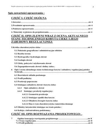 Projekt wykonawczy na remont zabudowy regulacyjnej potoku Srebrnik w km 0+000-0+0800 –w miejscowości Jarkowice ; Spis zawartości opracowania : CZĘŚĆ I. CZĘŚĆ OGÓLNA 1.Inwestor………………………………………………………..………………………..…str 4 2.Przedmiot opracowania……………………………………………………………...…...str 4 3.Podstawa opracowania …………………………………..………………………....……str 4 4. Materiały wyjściowe do projektowania…..…………………………………….…....…str 4 CZĘŚĆ II. OPIS ZLEWNI WRAZ Z OCENĄ AKTUALNEGO STANU TECHNICZNEGO KORYTA CIEKU I JEGO ZABUDOWY REGULACYJNEJ: 5.Krótka charakterystyka cieku : ……………………………………………………..….str 5 5.1 PołoŜenie geograficzne i administracyjne obiektu 5.2 Rzeźba terenu 5.3 Hydrografia i hydrologia zlewni 5.4 Geologia zlewni 5.5 Gleby, pokrycie i uŜytkowanie zlewni 5.6 Zagospodarowanie zlewni i doliny cieku ; 6 Opis i ocena aktualnego stanu technicznego koryta i zabudowy regulacyjnej potoku Srebrnik………………………………………………………………………………………………………………………….….str6 6.1 Rozwiniecie układu poziomego 6.2 Profil podłuŜny 6.3 Przekroje poprzeczne 6.4 Istniejąca zabudowa zlewni i koryta cieku: 6.4.1 Opis zabudowy zlewni 6.4.2 Istniejący przekrój regulacyjny: 6.4.2.1 Geometria przekroju 6.4.2.2 Istniejące spadki dna koryta 6.4.2.3 Obudowa brzegów koryta cieku 6.4.2.4 Dno-w tym charakterystyka rumowiska dennego 6.5 Obiekty inŜynierskie istniejące na trasie potoku : 6.6 Kolizje z infrastrukturą podziemną ; CZĘŚĆ III. OPIS ROZWIĄZANIA PROJEKTOWEGO: . 7 Ogólna koncepcja rozwiązania projektowego …………………………………...str 8 7.1 Trasa regulacyjna…………………………………………………………….…..str 8 7.2 Profil podłuŜny……………………………………………………...………….....str 8 2 Projekt wykonawczy na remont zabudowy regulacyjnej potoku Srebrnik w km 0+000-0+0800 –w miejscowości Jarkowice ; 3 7.3 Przepływy miarodajne i kontrolne dla aktualnego zagospodarowania doliny potoku……………………………………….………………………………..…….…str 9 7.4 Normalne przekroje regulacyjne i ich ubezpieczenie………...……………..…str 10 7.5 Projektowane budowle regulacyjne……………………………………….……str 10 7.6 Rozbiórka i odbudowa zniszczonych ubezpieczeń brzegowych………….…....str 13 7.7 Remont i przebudowa oraz zabezpieczenie obiektów infrastruktury towarzyszącej w tym :…………………………………………………………………………………str 13 8 Wytyczne technologiczne dla wykonawstwa i eksploatacji :.......................................str 13 9 Opis wykonania robót w kolejności technologicznej: …….………………….…....…str 14 10 Uwagi ogólne- związane z przygotowaniem zadania do realizacji prac jak i teŜ ich wykonywania:…………………………………………………………………..…….…..…str 14 11 Informacja o planie BIOZ. …….………………………………………………...….…str 14 CZĘŚĆ IV. CZĘŚĆ OBLICZENIOWA PROJEKTU: . 12 OBLICZENIA HYDROLOGICZNE ……………………………..……….…..…str 17 13 OBLICZENIA HYDRAULICZNE ….………………………………….……...…str 27 CZĘŚĆ V. CZĘŚĆ RYSUNKOWA PROJEKTU: ………...……..…..str 40 CZĘŚĆ VI – OPRACOWANIA TOWARZYSZĄCE……….…….....str 64 14. Dane opisowe i graficzne związane z właścicielami działek zlokalizowanych wzdłuŜ trasy potoku-……….........................................................................……………………..…str 68 15. Wykaz drzew przeznaczonych do usunięcia ……………………………………….....str 73 16. Zdjęcia poglądowe aktualnego stanu technicznego koryta potoku .…..………….....str 73 17.Szczegółowa inwentaryzacja fotograficzna aktualnego stanu cieku-płyta CD ….....str 74 18. CZĘŚĆ KOSZTOWA OPRACOWANIA: ……….........................................……..…str 66 18.1 Przedmiar robót…….........................................................................………..…str 67 18.2 Kosztorys Inwestorski……..............................................................…….…..…str 75 18.3 Szczegółowe Specyfikacje Techniczne- SST....................................……….….str 83 Informacja : 1. Po zakończeniu robót konieczne jest wznowienie linii brzegu. 2. W części Vi zamieszczono niezbędne dane opisowe i graficzne związane z właścicielami działek zlokalizowanych wzdłuŜ trasy potoku- objętej niniejszym projektem. Opracowanie zawiera 120 /sto dwadzieścia / jednostronnie numerowane karty; Projekt wykonawczy na remont zabudowy regulacyjnej potoku Srebrnik w km 0+000-0+0800 –w miejscowości Jarkowice ; 4 CZĘŚĆ I. CZĘŚĆ OGÓLNA. 1. Inwestor. Inwestorem jest Regionalny Zarząd Gospodarki Wodnej z siedzibą we Wrocławiu –przy ulicy Norwida 34. 2. Przedmiot i cel opracowania. Przedmiotem opracowania jest wykonanie kompletu dokumentacji niezbędnych i wymaganych przepisami dla sporządzenia projektu dla przywrócenia przekroju normalnego koryta wraz z fragmentarycznym remontem zabudowy regulacyjnej potoku Srebrnik /dawna nazwa Biała Woda / w km 0+000-0+0800-tj. w miejscowości Jarkowice. Zakres prac ustalony na uzgodnieniach z Zarządem Zlewni obejmuje odcinek koryta cieku od ujęcia potoku do potoku Złotna – do końca płyty bystrza jazu ruchomego wraz z ujęciem wody. Długość całego odcinka /od ujścia do jazu / wynosi około 140 mb. Ze względu na brak wiarygodnych danych dotyczących urzędowego kilometraŜowania potoku - przyjęto 