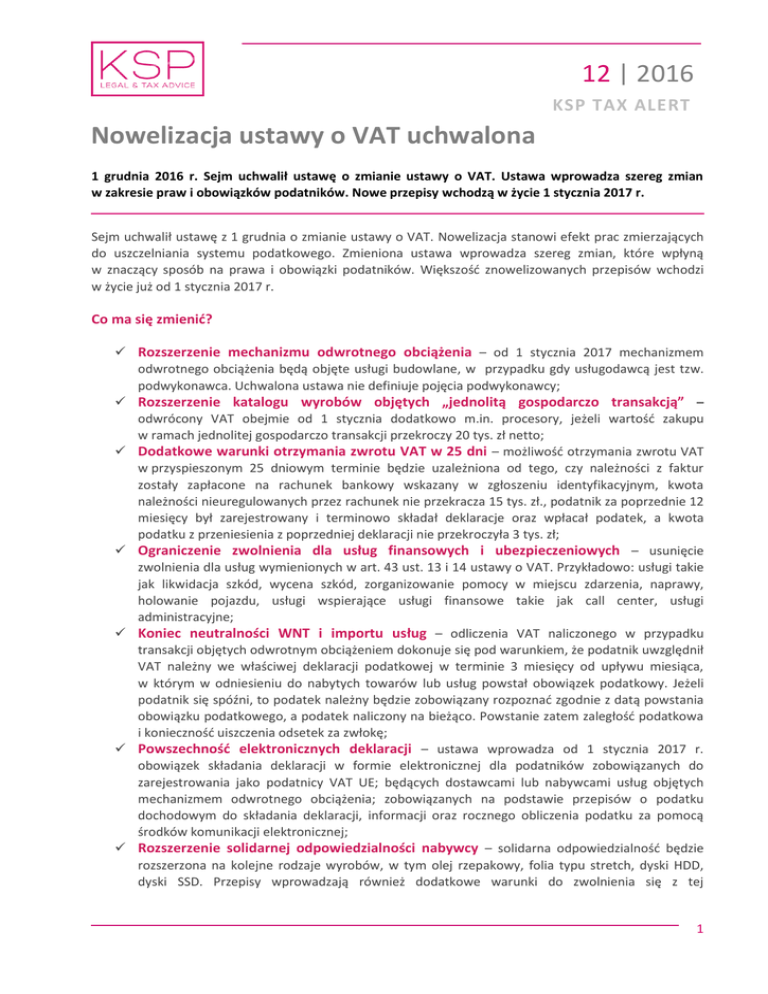 12 | 2016 KSP TAX ALERT Nowelizacja ustawy o VAT uchwalona 1 grudnia 2016 r. Sejm uchwalił ustawę o zmianie ustawy o VAT. Ustawa wprowadza szereg zmian w zakresie praw i obowiązków podatników. Nowe przepisy wchodzą w życie 1 stycznia 2017 r. Sejm uchwalił ustawę z 1 grudnia o zmianie ustawy o VAT. Nowelizacja stanowi efekt prac zmierzających do uszczelniania systemu podatkowego. Zmieniona ustawa wprowadza szereg zmian, które wpłyną w znaczący sposób na prawa i obowiązki podatników. Większość znowelizowanych przepisów wchodzi w życie już od 1 stycznia 2017 r. Co ma się zmienić? Rozszerzenie mechanizmu odwrotnego obciążenia – od 1 stycznia 2017 mechanizmem odwrotnego obciążenia będą objęte usługi budowlane, w przypadku gdy usługodawcą jest tzw. podwykonawca. Uchwalona ustawa nie definiuje pojęcia podwykonawcy; Rozszerzenie katalogu wyrobów objętych „jednolitą gospodarczo transakcją” – odwrócony VAT obejmie od 1 stycznia dodatkowo m.in. procesory, jeżeli wartość zakupu w ramach jednolitej gospodarczo transakcji przekroczy 20 tys. zł netto; Dodatkowe warunki otrzymania zwrotu VAT w 25 dni – możliwość otrzymania zwrotu VAT w przyspieszonym 25 dniowym terminie będzie uzależniona od tego, czy należności z faktur zostały zapłacone na rachunek bankowy wskazany w zgłoszeniu identyfikacyjnym, kwota należności nieuregulowanych przez rachunek nie przekracza 15 tys. zł., podatnik za poprzednie 12 miesięcy był zarejestrowany i terminowo składał deklaracje oraz wpłacał podatek, a kwota podatku z przeniesienia z poprzedniej deklaracji nie przekroczyła 3 tys. zł; Ograniczenie zwolnienia dla usług finansowych i ubezpieczeniowych – usunięcie zwolnienia dla usług wymienionych w art. 43 ust. 13 i 14 ustawy o VAT. Przykładowo: usługi takie jak likwidacja szkód, wycena szkód, zorganizowanie pomocy w miejscu zdarzenia, naprawy, holowanie pojazdu, usługi wspierające usługi finansowe takie jak call center, usługi administracyjne; Koniec neutralności WNT i importu usług – odliczenia VAT naliczonego w przypadku transakcji objętych odwrotnym obciążeniem dokonuje się pod warunkiem, że podatnik uwzględnił VAT należny we właściwej deklaracji podatkowej w terminie 3 miesięcy od upływu miesiąca, w którym w odniesieniu do nabytych towarów lub usług powstał obowiązek podatkowy. Jeżeli podatnik się spóźni, to podatek należny będzie zobowiązany rozpoznać zgodnie z datą powstania obowiązku podatkowego, a podatek naliczony na bieżąco. Powstanie zatem zaległość podatkowa i konieczność uiszczenia odsetek za zwłokę; Powszechność elektronicznych deklaracji – ustawa wprowadza od 1 stycznia 2017 r. obowiązek składania deklaracji w formie elektronicznej dla podatników zobowiązanych do zarejestrowania jako podatnicy VAT UE; będących dostawcami lub nabywcami usług objętych mechanizmem odwrotnego obciążenia; zobowiązanych na podstawie przepisów o podatku dochodowym do składania deklaracji, informacji oraz rocznego obliczenia podatku za pomocą środków komunikacji elektronicznej; Rozszerzenie solidarnej odpowiedzialności nabywcy – solidarna odpowiedzialność będzie rozszerzona na kolejne rodzaje wyrobów, w tym olej rzepakowy, folia typu stretch, dyski HDD, dyski SSD. Przepisy wprowadzają również dodatkowe warunki do zwolnienia się z tej 1 12 | 2016 KSP TAX ALERT odpowiedzialności, jak również dodatkowe warunki, które muszą być spełnione przez sprzedawcę składającego kaucję gwarancyjną; Solidarna odpowiedzialność pełnomocnika rejestrującego nowego podatnika VAT – wprowadza się solidarną odpowiedzialność pełnomocnika dokonującego rejestracji nowego podatnika VAT za zaległości podatkowe tego podmiotu powstałe w przeciągu 6 miesięcy od dnia rejestracji do wysokości 500 tys. zł; Przesłanki wykreślenia podatnika z rejestru VAT – organ podatkowy zyska uprawnienie do wykreślenia z rejestru podatnika VAT w m.in. sytuacji zawieszenia działalności gospodarczej, nieskładania deklaracji VAT lub braku wykazywania sprzedaży i zakupów, wystawiania fikcyjnych faktur bądź, gdy podatnik wiedział lub miał uzasadnione podstawy do tego by przypuszczać, że dostawcy lub nabywcy uczestniczą w oszustwie podatkowym; Powrót sankcji VAT w wysokości 20%, 30% i 100% – ustawa przewiduje dodatkową sankcję nakładaną na podatników, u których zostanie zidentyfikowana zaległość podatkowa. Sankcje będą nakładane w wysokości: o 20% zidentyfikowanej zaległości – jeżeli podatnik złoży korektę po zakończeniu kontroli podatkowej albo w trakcie prowadzonego postępowania kontrolnego, o 30% zidentyfikowanej zaległości – w razie jej stwierdzenia przez organ i niezłożenia w tym zakresie korekty deklaracji przez podatnika, o 100% zidentyfikowanej zaległości – jeżeli zaległość wynika z faktur, które zostały wystawione przez podmiot nieistniejący; stwierdzają czynności, które nie zostały dokonane; podają kwoty niezgodne z rzeczywistością lub potwierdzają czynności nieważne albo pozorne. Mając na uwadze powyższe, planowane zmiany powinny zostać niezwłocznie przeanalizowane przez podatników pod kątem prowadzonej działalności. Gdyby byli Państwo zainteresowani uzyskaniem dodatkowych informacji w powyższym zakresie, uprzejmie prosimy o kontakt: Kontakt w KSP: Magdalena Patryas Partner T: +48 32 731 68 53 E: [email protected] Elżbieta Lis Partner T: +48 32 731 68 50 E: [email protected] KSP Legal & Tax Advice ul. Chorzowska 150 40-101 Katowice F: +48 32 731 68 51 E: [email protected] www.ksplegal.pl www.ksplegal.pl/blog-o-podatkach Mamy nadzieję, że powyższa informacja będzie dla Państwa pomocna. Informacje te nie stanowią opinii prawnej ani porady. W celu uzyskania pełnych informacji lub porady prawnej, prosimy o kontakt. Jeżeli nie wyrażają Państwo zgody na przesyłanie dalszych newsletterów, prosimy o odesłanie