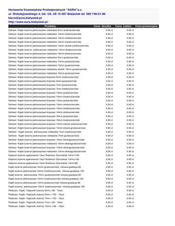Hurtownia Kosmetyków Profesjonalnych "AURA"s.c. ul. Wołodyjowskiego 4, lok. U5, U6 15-287 Białystok tel. 085 746-01-86 [email protected] http://www.aura.bialystok.pl/ Produkty Cena (brutto) Cena (netto) Gehwol -Kapki ścierne jednorazowe niebieskie 5mm średnioziarniste 0.00 zł 0.00 zł Gehwol -Kapki ścierne jednorazowe niebieskie 10mm średnioziarniste 0.00 zł 0.00 zł Gehwol -Kapki ścierne jednorazowe niebieskie 13mm średnioziarniste 0.00 zł 0.00 zł Gehwol -Kapki ścierne jednorazowe niebieskie 16mm średnioziarniste 0.00 zł 0.00 zł Gehwol -Kapki ścierne jednorazowe niebieskie 13mm stożek średnioziarniste 0.00 zł 0.00 zł Gehwol -Kapki ścierne jednorazowe niebieskie 13mm drobnoziarniste 0.00 zł 0.00 zł Gehwol -Kapki ścierne jednorazowe niebieskie 16mm drobnoziarniste 0.00 zł 0.00 zł Gehwol -Kapki ścierne jednorazowe niebieskie 5mm gruboziarniste 0.00 zł 0.00 zł Gehwol -Kapki ścierne jednorazowe niebieskie 10mm gruboziarniste 0.00 zł 0.00 zł Gehwol -Kapki ścierne jednorazowe niebieskie 13mm gruboziarniste 0.00 zł 0.00 zł Gehwol -Kapki ścierne jednorazowe niebieskie stożek 13mm gruboziarniste 0.00 zł 0.00 zł Gehwol -Kapki ścierne jednorazowe niebieskie 16mm gruboziarniste 0.00 zł 0.00 zł Gehwol -Kapki ścierne jednorazowe brązowe 5mm średnioziarniste 0.00 zł 0.00 zł Gehwol -Kapki ścierne jednorazowe brązowe 5mm gruboziarniste 0.00 zł 0.00 zł Gehwol -Kapki ścierne jednorazowe brązowe 7mm gruboziarniste 0.00 zł 0.00 zł Gehwol -Kapki ścierne jednorazowe brązowe 7mm średnioziarniste 0.00 zł 0.00 zł Gehwol -Kapki ścierne jednorazowe brązowe 10mm gruboziarniste 0.00 zł 0.00 zł Gehwol -Kapki ścierne jednorazowe brązowe 10mm średnioziarniste 0.00 zł 0.00 zł Gehwol -Kapki ścierne jednorazowe brązowe 13mm gruboziarniste 0.00 zł 0.00 zł Gehwol -Kapki ścierne jednorazowe brązowe 13mm drobnoziarniste 0.00 zł 0.00 zł Gehwol -Kapki ścierne jednorazowe brązowe 13mm średnioziarniste 0.00 zł 0.00 zł Gehwol -Kapki ścierne jednorazowe brązowe 16mm drobnoziarniste 0.00 zł 0.00 zł Gehwol -Kapki ścierne jednorazowe brązowe 16mm gruboziarniste 0.00 zł 0.00 zł Gehwol -Kapki ścierne jednorazowe brązowe 16mm średnioziarniste 0.00 zł 0.00 zł Gehwol -Kapki ścierne jednorazowe brązowe 13mm stożek średnioziarniste 0.00 zł 0.00 zł Gehwol -Kapki ścierne jednorazowe brązowe 13mm stożek gruboziarniste 0.00 zł 0.00 zł Gehwol - Kapki ścierne jednorazowe niebieskie 7mm średnioziarniste 0.00 zł 0.00 zł Gehwol - Kapki ścierne jednorazowe niebieskie 7mm gruboziarniste 0.00 zł 0.00 zł Gehwol -Kapki ścierne jednorazowe brązowe 10mm ekstragruboziarniste 0.00 zł 0.00 zł Gehwol -Kapki ścierne jednorazowe niebieskie 10mm ekstragruboziarniste 0.00 zł 0.00 zł Gehwol -Kapki ścierne jednorazowe brązowe 13mm ekstragruboziarniste 0.00 zł 0.00 zł Gehwol -Kapki ścierne jednorazowe niebieskie 13mm ekstragruboziarniste 0.00 zł 0.00 zł Kapturki ścierne opakowanie 10szt Średnica/ Ziarnistość 10mm/150 0.00 zł 0.00 zł Kapturki ścierne opakowanie 10szt Średnica/ Ziarnistość 13mm/150 0.00 zł 0.00 zł Kapturki ścierne opakowanie 10szt Średnica/ Ziarnistość 13mm/80 0.00 zł 0.00 zł Kapki ścierne jednorazowe 16mm gruboziarniste różowe,gradacja 80 0.00 zł 0.00 zł Kapki ścierne jednorazowe 16mm średnioziarniste różowe,gradacja 150 0.00 zł 0.00 zł Kapki ścierne jednorazowe 13mm gruboziarniste różowe,gradacja 80 0.00 zł 0.00 zł Kapki ścierne jednorazowe 13mm średnioziarniste różowe,gradacja 150 0.00 zł 0.00 zł Kapki ścierne jednorazowe 10mm gruboziarniste różowe,gradacja 80 0.00 zł 0.00 zł Kapki ścierne jednorazowe 10mm średnioziarniste różowe,gradacja 150 0.00 zł 0.00 zł Pedicare -Kapki- Kapturek ścierny 5mm x 80 - 10szt. 0.00 zł 0.00 zł Pedicare -Kapki- Kapturek ścierny 5mm x 150 - 10szt. 0.00 zł 0.00 zł Pedicare -Kapki- Kapturek ścierny 7mm x 150 - 10szt. 0.00 zł 0.00 zł Pedicare -Kapki- Kapturek ścierny 7mm x 80 - 10szt. 0.00 zł 0.00 zł Pedicare -Kapki- Kapturek ścierny 10mm x 80 - 10szt. 0.00 zł 0.00 zł Cena promocyjna Pedicare -Kapki- Kapturek ścierny 10mm x 150 - 10szt. 0.00 zł 0.00 zł Pedicare -Kapki- Kapturek ścierny 13mm x 150 - 10szt. 0.00 zł 0.00 zł Pedicare -Kapki- Kapturek ścierny 13mm x 80 - 10szt. 0.00 zł 0.00 zł Pedicare -Kapki- Kapturek ścierny 16mm x 80 - 10szt. 0.00 zł 0.00 zł Pedicare -Kapki- Kapturek ścierny 16mm x 150 - 10szt. 0.00 zł 0.00 zł Pedicare -Kapki- Kapturek ścierny 5mm x 150 - 10szt. 0.00 zł 0.00 zł