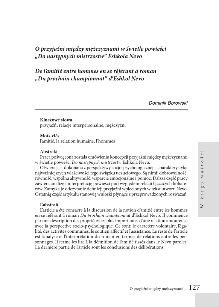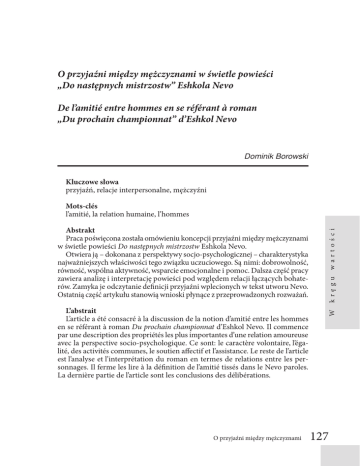 O przyjaźni między mężczyznami w świetle powieści „Do następnych mistrzostw” Eshkola Nevo De l’amitié entre hommes en se référant à roman „Du prochain championnat” d’Eshkol Nevo Dominik Borowski Kluczowe słowa przyjaźń, relacje interpersonalne, mężczyźni L’abstrait L’article a été consacré à la discussion de la notion d’amitié entre les hommes en se référant à roman Du prochain championnat d’Eshkol Nevo. Il commence par une description des propriétés les plus importantes d’une relation amoureuse avec la perspective socio-psychologique. Ce sont: le caractère volontaire, l’égalité, des activités communes, le soutien affectif et l’assistance. Le reste de l’article est l’analyse et l’interprétation du roman en termes de relations entre les personnages. Il ferme les lire à la définition de l’amitié tissés dans le Nevo paroles. La dernière partie de l’article sont les conclusions des délibérations. O przyjaźni między mężczyznami k rę g u W Abstrakt Praca poświęcona została omówieniu koncepcji przyjaźni między mężczyznami w świetle powieści Do następnych mistrzostw Eshkola Nevo. Otwiera ją – dokonana z perspektywy socjo-psychologicznej – charakterystyka najważniejszych właściwości tego związku uczuciowego. Są nimi: dobrowolność, równość, wspólna aktywność, wsparcie emocjonalne i pomoc. Dalsza część pracy zawiera analizę i interpretację powieści pod względem relacji łączących bohaterów. Zamyka je odczytanie definicji przyjaźni wplecionych w tekst utworu Nevo. Ostatnią część artykułu stanowią wnioski płynące z przeprowadzonych rozważań. w ar to ś c i Mots-clés l’amitié, la relation humaine, l’hommes 127 Dominik Borowski O przyjaźni między mężczyznami w świetle powieści „Do następnych mistrzostw „Eshkola Nevo „Przyjaźń to rzecz dziwna. Podczas gdy w miłości mówimy o miłości, między prawdziwymi przyjaciółmi nie mówi się o przyjaźni. Przyjaźń czynimy, nie nazywając jej ani jej nie komentując. Jest silna i cicha. Jest skromna. Jest męska. To romantyzm mężczyzn. Musi być dużo głębsza i solidniejsza niż miłość, skoro nie trwonimy jej głupio w słowach, deklaracjach, wierszach i listach. Musi być dużo bardziej satysfakcjonująca niż seks, ponieważ nie myli jej się z przyjemnością i świerzbieniem w ciele”. k rę g u W Przyjaźń jest powszechnie znanym pojęciem, które funkcjonuje w codziennej komunikacji językowej. Jednak próba jego eksplikacji przysparza wielu trudności. Takie status quo może tłumaczyć fakt, że w potocznym rozumieniu przyjaźni przypisuje się szeroki diapazon znaczeń. Na tej podstawie rodzi się przypuszczenie, że wielu ludzi nadużywa tego pojęcia, nie pojmując jego idei. Istotne zatem wydaje się scharakteryzowanie najważniejszych aspektów przyjaźni z perspektywy socjo-psychologicznej. Jej podstawowy wyróżnik stanowi dobrowolność1, nie jest ona bowiem nikomu narzucona odgórnie, lecz zależy od świadomej decyzji zainteresowanych ludzi. Należy w tym miejscu podkreślić, że dokonywany wybór opisywanego związku uczuciowego nie może być motywowany osiągnięciem celu innego niż sama chęć pozostawania w bliskich stosunkach2. Przyjaciele mają względem siebie taką samą pozycję społeczną, żaden z nich nie dominuje nad drugim i nie podporządkowuje go sobie. Takie relacje między nimi świadczą o równości3. Kolejną właściwością przyjaźni jest podejmowanie wspólnej aktywności. Ludzie darzący się nią dążą do poświęcania sobie jak największej ilości wolnego czasu, który przeznaczają na rozrywkę oraz rozmowy. Niewątpliwie sprzyja to rozszerzaniu sieci kontaktów społecznych. Przyjaciele zapoznają siebie nawzajem ze swoimi rodzinami, a także z kolegami i znajomymi. Ich wspólne konwersacje prowadzą do ukształtowania się wspólnego kodu komunikacyjnego. Istniejącym jednostkom leksykalnym i sygnałom niewerbalnym nadają nowe znaczenia, które w ar to ś c i Eric-Emmanuel Schmitt, Przypadek Adolfa H. L. Niebrzydowski, E. Płaszczyński, Przyjaźń i otwartość w stosunkach międzyludzkich, Warszawa 1989, s. 33. 2 J. Hardwig, W poszukiwaniu etyki związków osobistych, [w:] Mosty zamiast murów. Podręcznik do komunikacji interpersonalnej, red. nauk. J. Stewart, tłum. J. Kowalczewska, Warszawa 2008, s. 393. 3 M.B. Adelman, M.R. Parks, T.L. Albrecht, Natura przyjaźni i jej rozwój, [w:] Mosty zamiast murów…, s. 362–367. 1 O przyjaźni między mężczyznami 129 W k rę g u w ar toś c i znane są wyłącznie im. W ten sposób mogą swobodnie rozmawiać o prywatnych sprawach w gronie innych ludzi. Wyznacznikiem przyjaźni jest również zapewnianie wsparcia emocjonalnego. Wiąże się ono z budowaniem zaufania i zwiększaniem bliskości między przyjaciółmi. Ma na to duży wpływ wspólne spędzanie wolnego czasu, kiedy to pojawia się możliwość wzajemnego zwierzania się. Warto zauważyć, że tego typu rozmowy odznaczają się otwartością w zakresie każdego tematu. Przyjaciele opowiadają sobie zarówno o błahych zdarzeniach, jak i o kwestiach intymnych, a także podejmują dyskusje na temat własnych poglądów i postaw życiowych. Dzięki temu odgrywają nawzajem kluczową rolę w kształtowaniu swojego poczucia wartości i samooceny. Ważny aspekt okazywania wsparcia emocjonalnego stanowi podobieństwo, którego stopień wzrasta wraz z rozwojem znajomości4. Obejmuje ono wyznawane wartości, stawiane sobie cele i przyjęty kanon zachowań. Zgodność wskazanych kategorii sprawia, że przyjaciele odczuwają stabilność i przestaje zagrażać im niepewność poznawcza. Potrafią oni przewidywać swoje reakcje i rozumieją ich motywacje5. Dzięki temu coraz lepiej czują się, przebywając razem. Towarzyszy temu powstanie potrzeby okazywania sobie nawzajem pomocy, co stanowi kolejną właściwość przyjaźni. Partnerzy wspier