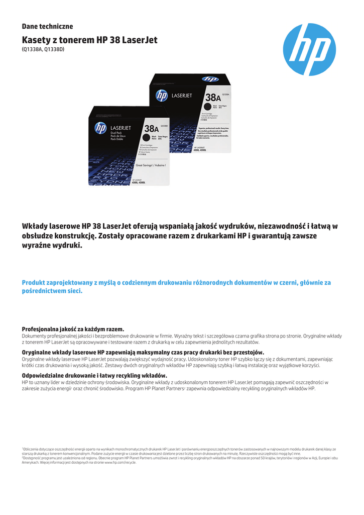 Dane techniczne Kasety z tonerem HP 38 LaserJet (Q1338A, Q1338D) Wkłady laserowe HP 38 LaserJet oferują wspaniałą jakość wydruków, niezawodność i łatwą w obsłudze konstrukcję. Zostały opracowane razem z drukarkami HP i gwarantują zawsze wyraźne wydruki. Produkt zaprojektowany z myślą o codziennym drukowaniu różnorodnych dokumentów w czerni, głównie za pośrednictwem sieci. Profesjonalna jakość za każdym razem. Dokumenty profesjonalnej jakości i bezproblemowe drukowanie w firmie. Wyraźny tekst i szczegółowa czarna grafika strona po stronie. Oryginalne wkłady z tonerem HP LaserJet są opracowywane i testowane razem z drukarką w celu zapewnienia jednolitych rezultatów. Oryginalne wkłady laserowe HP zapewniają maksymalny czas pracy drukarki bez przestojów. Oryginalne wkłady laserowe HP LaserJet pozwalają zwiększyć wydajność pracy. Udoskonalony toner HP szybko łączy się z dokumentami, zapewniając krótki czas drukowania i wysoką jakość. Zestawy dwóch oryginalnych wkładów HP zapewniają szybką i łatwą instalację oraz wyjątkowe korzyści. Odpowiedzialne drukowanie i łatwy recykling wkładów. HP to uznany lider w dziedzinie ochrony środowiska. Oryginalne wkłady z udoskonalonym tonerem HP LaserJet pomagają zapewnić oszczędności w zakresie zużycia energii1 oraz chronić środowisko. Program HP Planet Partners2 zapewnia odpowiedzialny recykling oryginalnych wkładów HP. 1Obliczenia dotyczące oszczędności energii oparto na wynikach monochromatycznych drukarek HP LaserJet i porównaniu energooszczędnych tonerów zastosowanych w najnowszym modelu drukarek danej klasy ze starszą drukarką z tonerem konwencjonalnym. Podane zużycie energii w czasie drukowania jest dzielone przez liczbę stron drukowanych na minutę. Rzeczywiste oszczędności mogą być inne. 2Dostępność programu jest uzależniona od regionu. Obecnie program HP Planet Partners umożliwia zwrot i recykling oryginalnych wkładów HP na obszarze ponad 50 krajów, terytoriów i regionów w Azji, Europie i obu Amerykach. Więcej informacji jest dostępnych na stronie www.hp.com/recycle. Dane techniczne | Kasety z tonerem HP 38 LaserJet Informacje o zgodności Drukarki serii HP LaserJet 4200 Dane techniczne produktu P/N Opis Kod UPC Wymiary (dł x szer x gł) Waga Średnia wydajność kasety z tonerem Q1338A HP 38A wkład z czarnym tonerem 808736185417 385 x 192 x 312 mm 2,8 kg 12 000 stron Q1338D HP 38A zestaw 2 oryginalnych wkładów z czarnym tonerem LaserJet 808736633994 395 x 397 x 332 mm 5,3 kg Na wkład: 12 000 stron Przybliżona średnia wydajność wg normy ISO/IEC 19752. Rzeczywista wydajność może się znacznie różnić w zależności od zawartości drukowanych stron i innych czynników. Szczegółowe informacje są dostępne pod adresem http://www.hp.com/go/learnaboutsupplies. Aby uzyskać więcej informacji na temat materiałów konsumpcyjnych HP, odwiedź http://www.hp.com © Copyright 2014 Hewlett-Packard Development Company, L.P. Informacje zawarte w tym dokumencie mogą bez uprzedzenia ulec zmianie. Jedyne gwarancje, jakich HP udziela na produkty i usługi, są określone w oświadczeniach gwarancyjnych dostarczanych wraz z takimi produktami i usługami. Żaden zapis niniejszego dokumentu nie może być uważany za dodatkową gwarancję. HP nie ponosi odpowiedzialności za błędy techniczne lub redakcyjne oraz braki występujące w niniejszym dokumencie. 4AA5-3318PLE, Czerwiec 2014