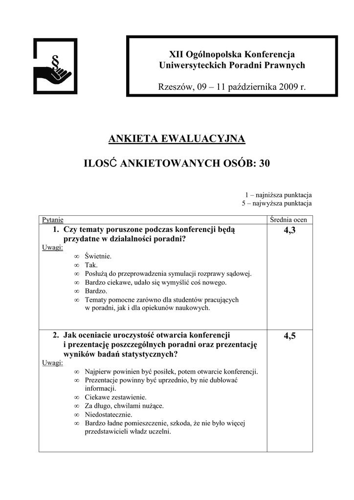 XII Ogólnopolska Konferencja Uniwersyteckich Poradni Prawnych Rzeszów, 09 – 11 października 2009 r. ANKIETA EWALUACYJNA ILOSĆ ANKIETOWANYCH OSÓB: 30 1 – najniŜsza punktacja 5 – najwyŜsza punktacja Pytanie Średnia ocen 1. Czy tematy poruszone podczas konferencji będą przydatne w działalności poradni? Uwagi: • • • • • • Świetnie. Tak. PosłuŜą do przeprowadzenia symulacji rozprawy sądowej. Bardzo ciekawe, udało się wymyślić coś nowego. Bardzo. Tematy pomocne zarówno dla studentów pracujących w poradni, jak i dla opiekunów naukowych. 2. Jak oceniacie uroczystość otwarcia konferencji i prezentację poszczególnych poradni oraz prezentację wyników badań statystycznych? Uwagi: • • • • • • 4,3 Najpierw powinien być posiłek, potem otwarcie konferencji. Prezentacje powinny być uprzednio, by nie dublować informacji. Ciekawe zestawienie. Za długo, chwilami nuŜące. Niedostatecznie. Bardzo ładne pomieszczenie, szkoda, Ŝe nie było więcej przedstawicieli władz uczelni. 4,5 3. Jak oceniacie warsztaty na temat interaktywnych metod nauczania prawa? 4,3 Uwagi: • • • • • • Rewelacyjne warsztaty. ZaangaŜowanie wszystkich uczestników uatrakcyjniło warsztaty. Bardzo ciekawe i przydatne zajęcia. Metoda oŜywiająca zajęcia. Bardzo dobre połączenie teorii i zajęć praktycznych, świetna integracja grupy. Bardzo interesująco mówiła Marta Skrodzka. 4. Czy chcielibyście powtórzyć takie ćwiczenia z wykorzystaniem usług profesjonalnego operatora kamery ? 3,9 Uwagi: • • • • • • Jak najbardziej, bardzo ciekawy pomysł – daje wiele moŜliwości. Powtórzyć jak najbardziej, ale nie z profesjonalistą. Raczej tak. Tak – 3 razy. Do przemyślenia. Jak najbardziej. 5. Jak oceniacie pracę w podziale na dwie grupy zadaniowe? 4,5 Uwagi: • • • • • • • Bardzo dobrze. Dobry pomysł. Bardzo owocna, dobra formuła. Za mało czasu na dopracowanie kręconych filmów. Trafiony pomysł, dzięki temu mogliśmy odpowiednio wykorzystać naszą wiedzę. Integracja była efektywniejsza. Bardzo dobry pomysł – w ten sposób moŜemy wymienić się doświadczeniami. Dobry pomysł. Mniejsza grupa – praca bardziej efektywna. 6. Jak oceniacie przygotowanie merytoryczne trenerów warsztatów? Uwagi: • • • • Pełen profesjonalizm. Ok. Jak zawsze bardzo profesjonalnie. Brak zastrzeŜeń. 4,3 7. Jak oceniacie stronę organizacyjną konferencji? 4,1 Uwagi: • • • • • • • • Na wysokim poziomie. Jest przepięknie. Dla wszystkich, którzy przyczynili się do organizacji: dziękuję! Rzeszów daje radę. Rewelacja. Brakowało organizatorów. Kontakt z nimi był utrudniony. Dobry hotel. Świetne wyŜywienie. W sumie ok. Przydałaby się osoba zarządzająca czasem uczestników (np. mówiąca, o której się spotykamy). 8. Jak oceniacie organizację czasu wolnego, w tym zwiedzanie Rzeszowa? 3,9 Uwagi: • • • • • • • Bardzo dobrze. Nie uczestniczyłam. Zwiedzanie mogłoby być bardziej rozbudowane. Szkoda, Ŝe padało. Bardzo ciekawe. Imprezy ok., ale zwiedzanie miasta, a raczej jego brak pozostawia niedosyt. Bardzo interesująca wycieczka. 9. Jak oceniacie zakwaterowanie i wyŜywienie podczas konferencji? 4,4 Uwagi: • • • • • • • • • Bardzo dobrze. Na wysokim poziomie: 10 pkt.. Doskonale. W cale nie przeszkadzało, ze hotel i restauracja były róŜnych miejscach. Szkoda, Ŝe restauracja była w innym miejscu niŜ zakwaterowanie. Dwudziestominutowe spacery nie były miłe. Jedzenie bardzo smaczne. WyŜywienie bardzo dobre z tym, Ŝe nie uwzględniało potrzeb wegetarian. Odległość śniadania była czasem irytująca. WyŜywienie super. WyŜywienie ok. Super nocleg i super jedzenie. 10. Jakie wraŜenie zrobił na Was Rzeszów? Uwagi: • • • Bardzo dobre. Miasto jest niezwykłe, niepowtarzalny klimat i niesamowite dziewczęta. Piękny, duŜy pomnik. 4,4 • • • • • Ładne miasto (zwłaszcza zabytkowe centrum). Pozytywne. Klimatyczne miasto. „Było” mało Rzeszowa, a miasto sprawia wraŜenie miłego i ładnego. Bardzo ładne miasto. Piękna starówka. Bardzo pozytywne. Urocze miasto. 11. Jakie tematy powinny być poruszone podczas kolejnej konferencji? • • • • • • • • • • Szkolenia psychologiczne dla opiekunów poradni. Street law – 3 razy. Zarządzanie administracją. Techniki szkolenia opiekunów poradni. Ciekawe. Etyka zawodów prawniczych w nauczaniu klinicznym – 3 razy. Wprowadzenie do programu nauczania ćwiczeń z pisania pism procesowych i aspektów psychologicznych na płaszczyźnie prawnik – klient. Kolejne pomysły, formy prowadzenia zajęć. Inne formy aktywności poradni niŜ tylko udzielanie porad plus szkolenia. Jeszcze raz zrobić tematy związane z psychologią. Nauka jak prowadzić szkolenia psychologiczne. Jak radzić sobie z klientami, którzy przynoszą 400 stron kserokopii dokumentów i którzy mają problem, a do poradni przychodzą się wyŜalić? Jak zaangaŜować wszystkich? 12. Uwagi • Było super.
