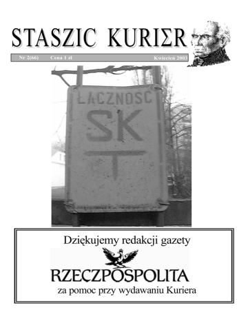 STASZIC KURI Σ R Nr 2(66) Cena 1 zł Kwiecień 2003 Dziękujemy redakcji gazety za pomoc przy wydawaniu Kuriera Szybkim klawiaturem “KANGUR” WYNIKI OLIMPIAD Miłośnicy matematyki mogli sprawdzić swoje umiejętności podczas Między-narodowego Konkursu “Kangur Matematyczny”. Odbył się on w naszym liceum w czwartek, 20 marca. WSTĘPNIAK O zaiste, niezbadane są losy Kuryjera, który po długim okresie marazmu, powstawszy niedawno z impetem z bagnistych wymiocin niepamięci, pojawia się znowu. Macie przed sobą numer primaaprilisowy, o którym nie mam zamiaru nic pisać, wychodząc z założenia że byłoby to działanie nieuzasadnione. Mogę tylko nadmienić, że Kuryjer nie jest związan z żadno opcjo polityczno. Śladami zeszłonumerowego Kuby Skowrona, chcę tylko poczynić uwagi na temat sytuacji ogólnej. Reakcje czytelników były najróżniejsze. Pierwszy numer wywołał zachwyt całością, obszerną swą częścią, dwoma felietonami, a w opinii dwóch osób, z którymi rozmawiałem – niczym. Parę dni temu, będąc żółtodziobym idealistą w nieplatońskim znaczeniu, miałem czelność twierdzić, że Kuryjer wraz ze SKAFANDREM A.D. wywołają emocje jednolyte. Teraz tej czelności nie mam i bezczelnie chcę się przyznać do zdziwienia. Nakład 130 egzemplarzy stopniał w dzień, a dwudziestojednoegzempalrzowy dodruk, dzień po nazajutrz. Odbyły się dwie dyskusje na Forum Staszycum (maarne...), egzemplarz biblioteczny jest – z tego co wiem – stale na chodzie. Mimo wysiłków, w sondzie Mateusza Adamowskiego wiele osób figuruje jako ci, do których Kuryjer nie dotarł. Może to świadczyć o niewrażliwości pobratymców na ogłoszenia (badania w tej kwestii mamy zamiar przeprowadzić), albo Bóg wie Ogłoszone zostały wyniki olimpiad przedmiotowych: matematycznej i fizycznej. Jak co roku, w gronie finalistów jest wielu uczniów naszej szkoły. o czym jeszcze. Listów do Redakcji przyszło nieskończenie mało. Jako wyrozumiała matka (rzeczownik “redakcja” jest rodzaju pięknego), Redakcja nie zastosowała cenzury w stosunku do niektórych wywrotowo-bełkotliwych fraz towarzysza Skowrona, chcąc być POSTRZEGANĄ JAKO (por. “Wstępniak” Skafander nr 1/2003). Maciey Gnyszka Szkolne kółko filmowe zorganizowało II Nocny Maraton Filmowy, który odbył się w nocy z piątku na sobotę (z 28 na 29 marca). Spotkanie rozpoczęło się o godz. 17.00. Projekcje filmów (m.in. “Wielkiego błękitu” L. Bessona oraz “Trzech kolorów” K.Kieślowskiego) poprzedzone były prelekcją o kinie francuskim, wygłoszoną przez Pana Andrzeja Wernera– krytyka filmowego. WIZYTA W DOMU DZIECKA 4 marca grupa uczniów z naszej szkoły odwiedziła Dom Dziecka przy ul. Rakowieckiej. Zanieśliśmy tam słodycze zebrane na wniosek siostry Katarzyny i urządziliśmy dzieciom wieczorek zabaw. XV FESTIWAL POEZJI WSPÓLCZESNEJ 25 marca minął termin składania zgłoszeń do Festiwalu – pięciu utworów oraz informacji dotyczących autora. W poniedziałek, 31 marca została ogłoszona lista osób zakwalifikowanych do finału, który odbędzie się 4 kwietnia o godzinie 18.00 w budynku naszej szkoły. Człowiek od składu apeluje! Pisząc do Kuriera pamiętaj o: - nierozdzielnych spacjach (ctrl+shift+ spacja) po samotnych 'i', 'w', ‘o’ itp. - nie wstawianiu podwójnych spacji przed '.', '!', '?' itp. - wstawianiu spacji przed i po myślnikach - ogólnie respektowaniu zasad ortografii, interpunkcji i gramatyki ZESPÓL REDAKCYJNY: redaktor naczelny: skład: Maciek Gnyszka I E Tomek Żółtak III b operator ksero: dział niusów i ogłoszeń: dział statystyki i ekonomii: brechownica: Kurier w internecie: Grzesio Zaniewski Marta Zygmunt Jacek Wojciechowski Marysia Witewska Mateusz Adamowski PISZCIE DO KURIERA! Kronika policyjna [email protected] [email protected] [email protected] [email protected] [email protected] teksty: Maciey Gnyszka, marf, Macinek T. i Mei Dei, Kuba Skowron, Ślepy, TTQŚ, Yerzy rysunki: Mei Dei, Kuba Skowron 2☺ II NOCNY MARATON FILMOWY STASZIC KURIER - 1(65) M ARZEC 2003 Obywatel F. podejrzany o urwanie łba hydrze dzieckiem w kolebce. Hydrze odrosło kilka łbów, natomiast dziecko zostało poważnie poturbowane, kolebka zaś nie nadaje się już do użytku. Obywatel F., już w młodości notowany za pastwienie się nad centaurami, został zatrzymany do czasu wyjaśnienia sprawy. JW KÓŁKO EUROPEJSKIE NOWOŚCI LITERACKIE WIESZCZ ZNÓW PRZEMÓWIŁ, czyli o 1001 sposobach pana Mirka Oto zwiastuję wam radość wielką, drodzy czytelnicy! Wyszła bowiem właśnie z dawna oczekiwana książka pana Mirka. Dzieło to ważne i pożyteczne podsumowuje wieloletnią pracę naszego nowego wieszcza, który nie szczędził rąk, nóg i pomysłów (co do lewej ręki nadszarpniętej przez krokodyla, lekarz stwierdził przed chwilą, że niestety trzeba będzie amputować nadgarstek; cóż, mogło być gorzej...), by zbierać zaprawdę krwawe żniwa swoich doświadczeń. Od lat, jak zapewne wszyscy wiedzą, nasz skarb narodowy, opętany szaleńczą myślą zmiecenia swej osoby z powierzchni ziemi i wrzucenia na kompost historii literatury, gdzie kiszą się m.in. ogóreczki Mikołaja Reja i staruszek przewiązujący pomidory, wszelkie swoje finezyjne do granic próby opisywał w opowiadaniach i wierszach, które publikowane na łamach czasopism literackich na całym świecie cieszyły się uwielbieniem rosnącej geometrycznie rzeszy fanów. I to właśnie dzięki nim możliwe stało się to niezwykłe przedsięwzięcie, które zaowocowało eksplozją literackiego geniuszu pana Mirka – podróż dookoła świata, w czasie której nasz wielki pisarz ponad 1000 razy usiłował popełnić samobójstwo. Gdyby nie grono wielbicieli (o czym wspomina we wstępie sam autor) zorganizowanych w ogólnoświatową agencję informacyjno-interwencyjną, którzy deptali mu po piętach i w ostatniej chwili ratowali go z opresji, reanimowali i opatrywali rany, prawdopod