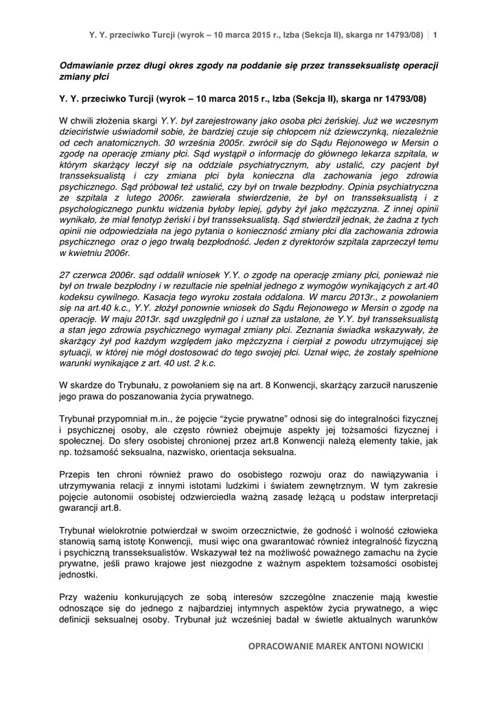 Y. Y. przeciwko Turcji (wyrok – 10 marca 2015 r., Izba (Sekcja II), skarga nr 14793/08) 1 Odmawianie przez długi okres zgody na poddanie się przez transseksualistę operacji zmiany płci Y. Y. przeciwko Turcji (wyrok – 10 marca 2015 r., Izba (Sekcja II), skarga nr 14793/08) W chwili złożenia skargi Y.Y. był zarejestrowany jako osoba płci żeńskiej. Już we wczesnym dzieciństwie uświadomił sobie, że bardziej czuje się chłopcem niż dziewczynką, niezależnie od cech anatomicznych. 30 września 2005r. zwrócił się do Sądu Rejonowego w Mersin o zgodę na operację zmiany płci. Sąd wystąpił o informację do głównego lekarza szpitala, w którym skarżący leczył się na oddziale psychiatrycznym, aby ustalić, czy pacjent był transseksualistą i czy zmiana płci była konieczna dla zachowania jego zdrowia psychicznego. Sąd próbował też ustalić, czy był on trwale bezpłodny. Opinia psychiatryczna ze szpitala z lutego 2006r. zawierała stwierdzenie, że był on transseksualistą i z psychologicznego punktu widzenia byłoby lepiej, gdyby żył jako mężczyzna. Z innej opinii wynikało, że miał fenotyp żeński i był transseksualistą. Sąd stwierdził jednak, że żadna z tych opinii nie odpowiedziała na jego pytania o konieczność zmiany płci dla zachowania zdrowia psychicznego oraz o jego trwałą bezpłodność. Jeden z dyrektorów szpitala zaprzeczył temu w kwietniu 2006r. 27 czerwca 2006r. sąd oddalił wniosek Y.Y. o zgodę na operację zmiany płci, ponieważ nie był on trwale bezpłodny i w rezultacie nie spełniał jednego z wymogów wynikających z art.40 kodeksu cywilnego. Kasacja tego wyroku została oddalona. W marcu 2013r., z powołaniem się na art.40 k.c., Y.Y. złożył ponownie wniosek do Sądu Rejonowego w Mersin o zgodę na operację. W maju 2013r. sąd uwzględnił go i uznał za ustalone, że Y.Y. był transseksualistą a stan jego zdrowia psychicznego wymagał zmiany płci. Zeznania świadka wskazywały, że skarżący żył pod każdym względem jako mężczyzna i cierpiał z powodu utrzymującej się sytuacji, w której nie mógł dostosować do tego swojej płci. Uznał więc, że zostały spełnione warunki wynikające z art. 40 ust. 2 k.c. W skardze do Trybunału, z powołaniem się na art. 8 Konwencji, skarżący zarzucił naruszenie jego prawa do poszanowania życia prywatnego. Trybunał przypomniał m.in., że pojęcie “życie prywatne” odnosi się do integralności fizycznej i psychicznej osoby, ale często również obejmuje aspekty jej tożsamości fizycznej i społecznej. Do sfery osobistej chronionej przez art.8 Konwencji należą elementy takie, jak np. tożsamość seksualna, nazwisko, orientacja seksualna. Przepis ten chroni również prawo do osobistego rozwoju oraz do nawiązywania i utrzymywania relacji z innymi istotami ludzkimi i światem zewnętrznym. W tym zakresie pojęcie autonomii osobistej odzwierciedla ważną zasadę leżącą u podstaw interpretacji gwarancji art.8. Trybunał wielokrotnie potwierdzał w swoim orzecznictwie, że godność i wolność człowieka stanowią samą istotę Konwencji, musi więc ona gwarantować również integralność fizyczną i psychiczną transseksualistów. Wskazywał też na możliwość poważnego zamachu na życie prywatne, jeśli prawo krajowe jest niezgodne z ważnym aspektem tożsamości osobistej jednostki. Przy ważeniu konkurujących ze sobą interesów szczególne znaczenie mają kwestie odnoszące się do jednego z najbardziej intymnych aspektów życia prywatnego, a więc definicji seksualnej osoby. Trybunał już wcześniej badał w świetle aktualnych warunków OPRACOWANIE MAREK ANTONI NOWICKI 2 Y. Y. przeciwko Turcji (wyrok – 10 marca 2015 r., Izba (Sekcja II), skarga nr 14793/08) rozmaite sprawy dotyczące problemów, z jakimi stykają się transseksualiści i stwierdził stały postęp w działaniach państw dla ochrony tych osób oraz uznania ich szczególnej sytuacji. Na wstępie Trybunał podkreślił, że we wcześniejszych sprawach rozpatrywał zarzuty osób transeksualnych operowanych albo które zostały poddane określonym zabiegom chirurgicznym w celu zmiany płci. W tej sprawie natomiast w dniu wniesienia skargi skarżący, niezoperowany transseksualista, znajdował się w sytuacji, w której sąd odmawiał mu zgody sądowej na taką operację, ponieważ nie był trwale bezpłodny. Sprawa ta dotyczyła więc jednego z problemów, z którymi mogą zetknąć się osoby transseksualne znajdujące się w innym położeniu, niż skarżący w dotychczas rozpatrzonych sprawach w tej dziedzinie. Rodziła ona w istocie kwestię możliwych wstępnych wymagań procesu zmiany płcii ich zgodność z art.8 Konwencji. W tym przypadku nie można było zastosować wprost kryteriów i zasad wskazanych w orzecznictwie, zostały bowiem sformułowane w kontekście wyraźnie odmiennym. Mogły jednak być pomocne Trybunałowi przy ocenie. Skarżący zarzucił w pierwszej kolejności, że krajowe organy sądowe odmówiły uwzględnienia jego wniosku o zgodę na operację zmiany płci. W związku z tym Trybunał potwierdził, że autonomia osobista jednostki może zasadniczo rozciągać się na prawo do operacji na swoim ciele w zależności od własnej woli. Nawet, jeśli art.8 nie można interpretować w sposób oznaczający bezwarunkową gwarancję prawa do operacji zmiany płci, Trybunał przypomniał, że na poziomie międzynarodowym transseksualizm szeroko uznaje się za za stan medyczny usprawiedliwiający zabieg, który ma pomóc takim osobom. Służby zdrowia większości państw Konwencji uznają go i gwarantują albo wyrażają zgodę na zabiegi, w tym operacje chirurgiczne nieodwracalnej zmiany płci. Trybunał uważał, że odmowa, z jaką początkowo spotkał się skarżący, miała niezaprzeczalnie negatywne konsekwencje dla jego prawa do tożsamości seksualnej i osobistego rozwoju, które stanowią fundamentalne aspekty prawa do poszanowania ż