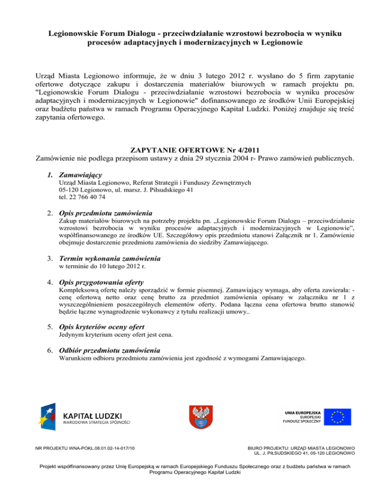 Legionowskie Forum Dialogu - przeciwdziałanie wzrostowi bezrobocia w wyniku procesów adaptacyjnych i modernizacyjnych w Legionowie Urząd Miasta Legionowo informuje, że w dniu 3 lutego 2012 r. wysłano do 5 firm zapytanie ofertowe dotyczące zakupu i dostarczenia materiałów biurowych w ramach projektu pn. "Legionowskie Forum Dialogu - przeciwdziałanie wzrostowi bezrobocia w wyniku procesów adaptacyjnych i modernizacyjnych w Legionowie" dofinansowanego ze środków Unii Europejskiej oraz budżetu państwa w ramach Programu Operacyjnego Kapitał Ludzki. Poniżej znajduje się treść zapytania ofertowego. ZAPYTANIE OFERTOWE Nr 4/2011 Zamówienie nie podlega przepisom ustawy z dnia 29 stycznia 2004 r- Prawo zamówień publicznych. 1. Zamawiający Urząd Miasta Legionowo, Referat Strategii i Funduszy Zewnętrznych 05-120 Legionowo, ul. marsz. J. Piłsudskiego 41 tel. 22 766 40 74 2. Opis przedmiotu zamówienia Zakup materiałów biurowych na potrzeby projektu pn. „Legionowskie Forum Dialogu – przeciwdziałanie wzrostowi bezrobocia w wyniku procesów adaptacyjnych i modernizacyjnych w Legionowie”, współfinansowanego ze środków UE. Szczegółowy opis przedmiotu stanowi Załącznik nr 1. Zamówienie obejmuje dostarczenie przedmiotu zamówienia do siedziby Zamawiającego. 3. Termin wykonania zamówienia w terminie do 10 lutego 2012 r. 4. Opis przygotowania oferty Kompleksową ofertę należy sporządzić w formie pisemnej. Zamawiający wymaga, aby oferta zawierała: cenę ofertową netto oraz cenę brutto za przedmiot zamówienia opisany w załączniku nr 1 z wyszczególnieniem poszczególnych elementów oferty. Podana łączna cena ofertowa brutto stanowić będzie łączne wynagrodzenie wykonawcy z tytułu realizacji umowy.. 5. Opis kryteriów oceny ofert Jedynym kryterium oceny ofert jest cena. 6. Odbiór przedmiotu zamówienia Warunkiem odbioru przedmiotu zamówienia jest zgodność z wymogami Zamawiającego. NR PROJEKTU WNA-POKL.08.01.02-14-017/10 BIURO PROJEKTU: URZĄD MIASTA LEGIONOWO UL. J. PIŁSUDSKIEGO 41, 05-120 LEGIONOWO Projekt współfinansowany przez Unię Europejską w ramach Europejskiego Funduszu Społecznego oraz z budżetu państwa w ramach Programu Operacyjnego Kapitał Ludzki 7. Uwagi: Termin związania ofertą – 7 dni od dnia złożenia oferty Ofertę należy złożyć do dnia 6 lutego do godz. 15.00 na adres (e-mail): [email protected] SZCZEGÓŁOWY OPIS PRZEDMIOTU ZAMÓWIENIA Lp. Nazwa artykułu Szczegółowy opis artykułu Ilość 1. Markery kolorowe 4 różne kolory w zestawie (w tym czarny) 10 zestawów 2. Karteczki samoprzylepne Bloczek 100 kartek, żółte, wymiar ok. 130 x 75 mm 10 szt. 3. Teczka z gumką Zamykana na dwie narożne gumki, 100 szt. z mocnego kartonu, z trzema zakładkami chroniącymi dokumenty formatu A4, kolor pomarańczowy 4. Naklejki Wymiar: ok 100 x 150 mm, białe z 100 szt. kolorowym nadrukiem (wykonanie projektu nadruku (loga UE, herb miasta Legionowo, tytuł projektu, data), papier foliowy co najmniej 220 g, klej trwały. Pozycja wymaga wykonania nadruku. 5. Papier kserograficzny Format A4, gramatura-80g/m2, przeznaczony do druku kolorowego i czarno-białego, 1 ryza- 500 arkuszy 10 szt. 6. Toner do drukarki HP LaserJet P2015 dn Czarny 1 szt. 7. Toner do drukarki Samsung 4 wkłady: YELLOW, MAGENTA, CYAN, 1 szt. CLP-310N BLACK 8. Etykiety 12 etykiet na stronie, 105 mm x 48 mm, 100 szt. w opakowaniu Flipchart Uniwersalna i stabilna tablica 1 szt. suchościeralna typu flipchart, metalowa półka na markery na całej szerokości dolnej krawędzi, unoszony, bardzo wygodny (na 9. NR PROJEKTU WNA-POKL.08.01.02-14-017/10 2 opakowania BIURO PROJEKTU: URZĄD MIASTA LEGIONOWO UL. J. PIŁSUDSKIEGO 41, 05-120 LEGIONOWO Projekt współfinansowany przez Unię Europejską w ramach Europejskiego Funduszu Społecznego oraz z budżetu państwa w ramach Programu Operacyjnego Kapitał Ludzki zawiasach) metalowy uchwyt na arkusze papieru, regulowany rozstaw haków na papier, regulacja wysokości tablicy w zakresie od 105 cm do 184 cm 10. Papier do flipchartów 50 kartek, wymiar 1000 mm x 650 mm 5 6 szt. standardowych 12 mm otworów do tablicy, papier gładki 80 g/m2, 11. Masa mocująca Służy do przytwierdzania plakatów, kartek papieru, rysunków, fotografii. Po odklejeniu nie pozostawia plam. Do wielokrotnego użycia. NR PROJEKTU WNA-POKL.08.01.02-14-017/10 1 szt. BIURO PROJEKTU: URZĄD MIASTA LEGIONOWO UL. J. PIŁSUDSKIEGO 41, 05-120 LEGIONOWO Projekt współfinansowany przez Unię Europejską w ramach Europejskiego Funduszu Społecznego oraz z budżetu państwa w ramach Programu Operacyjnego Kapitał Ludzki