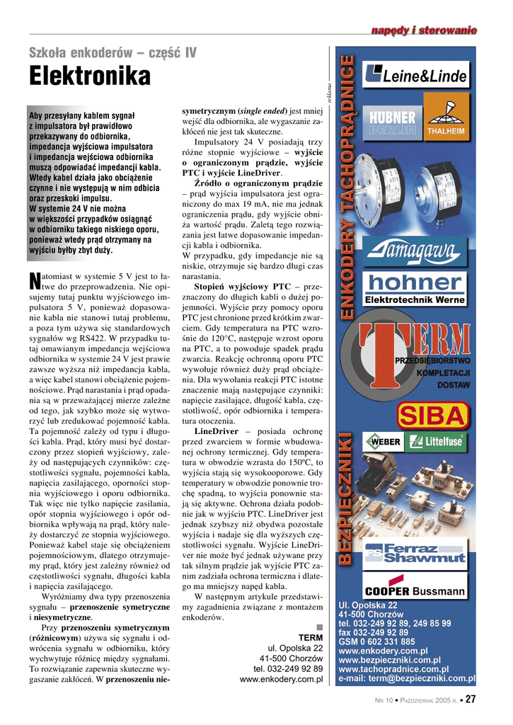 Szkoła enkoderów – część IV Aby przesyłany kablem sygnał z impulsatora był prawidłowo przekazywany do odbiornika, impedancja wyjściowa impulsatora i impedancja wejściowa odbiornika muszą odpowiadać impedancji kabla. Wtedy kabel działa jako obciążenie czynne i nie występują w nim odbicia oraz przeskoki impulsu. W systemie 24 V nie można w większości przypadków osiągnąć w odbiorniku takiego niskiego oporu, ponieważ wtedy prąd otrzymany na wyjściu byłby zbyt duży. N atomiast w systemie 5 V jest to łatwe do przeprowadzenia. Nie opisujemy tutaj punktu wyjściowego impulsatora 5 V, ponieważ dopasowanie kabla nie stanowi tutaj problemu, a poza tym używa się standardowych sygnałów wg RS422. W przypadku tutaj omawianym impedancja wejściowa odbiornika w systemie 24 V jest prawie zawsze wyższa niż impedancja kabla, a więc kabel stanowi obciążenie pojemnościowe. Prąd narastania i prąd opadania są w przeważającej mierze zależne od tego, jak szybko może się wytworzyć lub zredukować pojemność kabla. Ta pojemność zależy od typu i długości kabla. Prąd, który musi być dostarczony przez stopień wyjściowy, zależy od następujących czynników: częstotliwości sygnału, pojemności kabla, napięcia zasilającego, oporności stopnia wyjściowego i oporu odbiornika. Tak więc nie tylko napięcie zasilania, opór stopnia wyjściowego i opór odbiornika wpływają na prąd, który należy dostarczyć ze stopnia wyjściowego. Ponieważ kabel staje się obciążeniem pojemnościowym, dlatego otrzymujemy prąd, który jest zależny również od częstotliwości sygnału, długości kabla i napięcia zasilającego. Wyróżniamy dwa typy przenoszenia sygnału – przenoszenie symetryczne i niesymetryczne. Przy przenoszeniu symetrycznym (różnicowym) używa się sygnału i odwrócenia sygnału w odbiorniku, który wychwytuje różnicę między sygnałami. To rozwiązanie zapewnia skuteczne wygaszanie zakłóceń. W przenoszeniu nie- reklama Elektronika symetrycznym (single ended) jest mniej wejść dla odbiornika, ale wygaszanie zakłóceń nie jest tak skuteczne. Impulsatory 24 V posiadają trzy różne stopnie wyjściowe – wyjście o ograniczonym prądzie, wyjście PTC i wyjście LineDriver. Źródło o ograniczonym prądzie – prąd wyjścia impulsatora jest ograniczony do max 19 mA, nie ma jednak ograniczenia prądu, gdy wyjście obniża wartość prądu. Zaletą tego rozwiązania jest łatwe dopasowanie impedancji kabla i odbiornika. W przypadku, gdy impedancje nie są niskie, otrzymuje się bardzo długi czas narastania. Stopień wyjściowy PTC – przeznaczony do długich kabli o dużej pojemności. Wyjście przy pomocy oporu PTC jest chronione przed krótkim zwarciem. Gdy temperatura na PTC wzrośnie do 120°C, następuje wzrost oporu na PTC, a to powoduje spadek prądu zwarcia. Reakcję ochronną oporu PTC wywołuje również duży prąd obciążenia. Dla wywołania reakcji PTC istotne znaczenie mają następujące czynniki: napięcie zasilające, długość kabla, częstotliwość, opór odbiornika i temperatura otoczenia. LineDriver – posiada ochronę przed zwarciem w formie wbudowanej ochrony termicznej. Gdy temperatura w obwodzie wzrasta do 150ºC, to wyjścia stają się wysokooporowe. Gdy temperatury w obwodzie ponownie trochę spadną, to wyjścia ponownie stają się aktywne. Ochrona działa podobnie jak w wyjściu PTC. LineDriver jest jednak szybszy niż obydwa pozostałe wyjścia i nadaje się dla wyższych częstotliwości sygnału. Wyjście LineDriver nie może być jednak używane przy tak silnym prądzie jak wyjście PTC zanim zadziała ochrona termiczna i dlatego ma mniejszy napęd kabla. W następnym artykule przedstawimy zagadnienia związane z montażem enkoderów. TERM ul. Opolska 22 41-500 Chorzów tel. 032-249 92 89 www.enkodery.com.pl NR 10 PAŹDZIERNIK 2005 R. 27