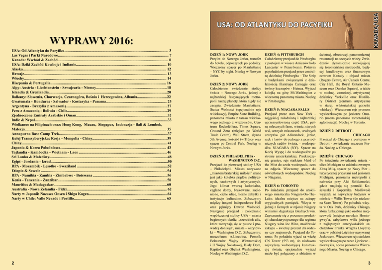 KANADA/USA USA: OD ATLANTYKU DO PACYFIKU WYPRAWY 2016: USA: Od Atlantyku do Pacyfiku............................................................................................................ 3 Las Vegas i Parki Narodowe................................................................................................................... 7 Kanada: Wschód & Zachód................................................................................................................... 8 USA: Dziki Zachód Kowboje i Indianie.............................................................................................. 10 Alaska..................................................................................................................................................... 12 Hawaje.................................................................................................................................................... 13 Włochy.................................................................................................................................................... 14 Hiszpania & Portugalia........................................................................................................................ 16 Alpy: Austria - Liechtenstein - Szwajcaria - Niemcy..........................................................................18 Islandia & Grenlandia...........................................................................................................................20 Bałkany: Słowenia, Chorwacja, Czarnogóra, Bośnia i Hercegowina, Albania...............................22 Gwatemala - Honduras - Salwador - Kostaryka - Panama............................................................... 25 Argentyna - Brazylia z Amazonią.........................................................................................................27 Peru z Amazonią - Boliwia - Chile........................................................................................................29 Zjednoczone Emiraty Arabskie i Oman...............................................................................................32 Indie & Nepal..........................................................................................................................................33 Wielkanoc na Filipinach oraz: Hong Kong, Macau, Singapur, Indonezja - Bali & Lombok, Malezja................................................................................................................................................... 35 Annapurna Base Camp Trek.................................................................................................................37 Kolej Transsyberyjska: Rosja - Mongolia - Chiny..............................................................................39 Chiny....................................................................................................................................................... 41 Japonia & Korea Południowa.............................................................................................................. 43 Tajlandia - Kambodża - Wietnam - Laos ............................................................................................46 Sri Lanka & Malediwy...........................................................................................................................48 Egipt - Jordania - Izrael.........................................................................................................................50 RPA - Mozambik - Lesotho - Swaziland ..............................................................................................52 Etiopia & Seszele ...................................................................................................................................54 RPA - Namibia - Zambia - Zimbabwe - Botswana .............................................................................56 Kenia - Tanzania - Zanzibar..................................................................................................................58 Mauritius & Madagaskar......................................................................................................................60 Australia - Nowa Zelandia - Fidżi........................................................................................................ 62 Narty w Japonii: Nozawa Onsen i Shiga Kogen..................................................................................64 Narty w Chile: Valle Nevado i Portillo................................................................................................ 65 2 DZIEŃ 1: NOWY JORK Przylot do Nowego Jorku, transfer do hotelu, odpoczynek po podróży. Wieczorny spacer po Manhattanie – NYC by night. Nocleg w Nowym Jorku. DZIEŃ 2: NOWY JORK Całodzienne zwiedzanie stolicy świata – Nowego Jorku, jednej z najbardziej fascynujących metropolii naszej planety, która nigdy nie zasypia. Zwiedzanie Manhattanu: Statua Wolności (opcjonalnie rejs widokowy), Empire State Building, panorama miasta z tarasu widokowego jednego z wieżowców, Centrum Rockefellera, Times Square, Ground Zero (miejsce po World Trade Centre), Wall Street, słynna 5th Avenue, kościół św.Trójcy oraz spacer po Central Park. Nocleg w Nowym Jorku. DZIEŃ 3: PHILADELPHIA WASHINGTON D.C. Przejazd do pierwszej stolicy USA – Philadelphii. Miasto nazywane „miastem braterskiej miłości” znane jest jako kolebka prądów politycznych, naukowych i artystycznych. Jego klimat tworzą kolonialne, ceglane domy, brukowane, zacienione, ciche ulice, liczne zabytki i instytucje kulturalne. Zobaczymy między innymi Independence Hall oraz pęknięty Dzwon Wolności. Następnie przejazd i zwiedzanie współczesnej stolicy USA - miasta bagiennych okolic, „szerokich ulic, które zaczynają się w pustce i prowadzą donikąd”, miasta - wizytówki - Washington D.C. Zobaczymy: mauzoleum A.Lincolna, Pomnik Bohaterów Wojny