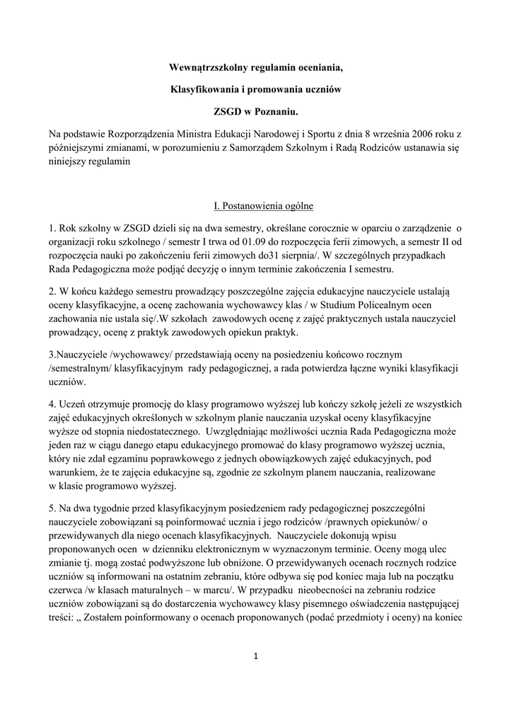 Wewnątrzszkolny regulamin oceniania, Klasyfikowania i promowania uczniów ZSGD w Poznaniu. Na podstawie Rozporządzenia Ministra Edukacji Narodowej i Sportu z dnia 8 września 2006 roku z późniejszymi zmianami, w porozumieniu z Samorządem Szkolnym i Radą Rodziców ustanawia się niniejszy regulamin I. Postanowienia ogólne 1. Rok szkolny w ZSGD dzieli się na dwa semestry, określane corocznie w oparciu o zarządzenie o organizacji roku szkolnego / semestr I trwa od 01.09 do rozpoczęcia ferii zimowych, a semestr II od rozpoczęcia nauki po zakończeniu ferii zimowych do31 sierpnia/. W szczególnych przypadkach Rada Pedagogiczna może podjąć decyzję o innym terminie zakończenia I semestru. 2. W końcu każdego semestru prowadzący poszczególne zajęcia edukacyjne nauczyciele ustalają oceny klasyfikacyjne, a ocenę zachowania wychowawcy klas / w Studium Policealnym ocen zachowania nie ustala się/.W szkołach zawodowych ocenę z zajęć praktycznych ustala nauczyciel prowadzący, ocenę z praktyk zawodowych opiekun praktyk. 3.Nauczyciele /wychowawcy/ przedstawiają oceny na posiedzeniu końcowo rocznym /semestralnym/ klasyfikacyjnym rady pedagogicznej, a rada potwierdza łączne wyniki klasyfikacji uczniów. 4. Uczeń otrzymuje promocję do klasy programowo wyższej lub kończy szkołę jeżeli ze wszystkich zajęć edukacyjnych określonych w szkolnym planie nauczania uzyskał oceny klasyfikacyjne wyższe od stopnia niedostatecznego. Uwzględniając możliwości ucznia Rada Pedagogiczna może jeden raz w ciągu danego etapu edukacyjnego promować do klasy programowo wyższej ucznia, który nie zdał egzaminu poprawkowego z jednych obowiązkowych zajęć edukacyjnych, pod warunkiem, że te zajęcia edukacyjne są, zgodnie ze szkolnym planem nauczania, realizowane w klasie programowo wyższej. 5. Na dwa tygodnie przed klasyfikacyjnym posiedzeniem rady pedagogicznej poszczególni nauczyciele zobowiązani są poinformować ucznia i jego rodziców /prawnych opiekunów/ o przewidywanych dla niego ocenach klasyfikacyjnych. Nauczyciele dokonują wpisu proponowanych ocen w dzienniku elektronicznym w wyznaczonym terminie. Oceny mogą ulec zmianie tj. mogą zostać podwyższone lub obniżone. O przewidywanych ocenach rocznych rodzice uczniów są informowani na ostatnim zebraniu, które odbywa się pod koniec maja lub na początku czerwca /w klasach maturalnych – w marcu/. W przypadku nieobecności na zebraniu rodzice uczniów zobowiązani są do dostarczenia wychowawcy klasy pisemnego oświadczenia następującej treści: „ Zostałem poinformowany o ocenach proponowanych (podać przedmioty i oceny) na koniec 1 roku szkolnego (podać rok) , syna/córki (imię i nazwisko, klasa). Podpis rodzica” lub przesłać wiadomość za pomocą dziennika elektronicznego. 6. Uczeń otrzymuje ocenę zachowania oraz oceny z poszczególnych przedmiotów obowiązkowych i nadobowiązkowych na podstawie ocen cząstkowych, za wyjątkiem przedmiotu „Wychowanie do życia w rodzinie” – obowiązujący wpis „uczestniczył/a” oraz przedmiotów, z których został zwolniony – wpis „zwolniony/a”. 7. Uczeń może być zwolniony na czas określony z zajęć wychowania fizycznego. Decyzję o zwolnieniu ucznia z zajęć wychowania fizycznego podejmuje dyrektor szkoły na podstawie opinii o ograniczonych możliwościach uczestniczenia w tych zajęciach wydanej przez lekarza /w terminie 14 dni od dostarczenia zwolnienia/ i pisemnej prośby rodziców. Zwolnienie z ćwiczeń w ramach lekcji wychowania fizycznego nie zwalnia ucznia z obecności na tych lekcjach. Szczegółowe ustalenia w tym względzie znajdują się w przedmiotowym systemie oceniania z wychowania fizycznego. 8. Dyrekcja szkoły informuje rodziców o śródsemestralnych i końcowo rocznych wynikach w nauce ich dzieci, organizując spotkanie z rodzicami /5 spotkań w ciągu roku szkolnego/, a także poprzez indywidualne spotkania z nauczycielami, pedagogiem szkolnym /termin konsultacji poszczególnych nauczycieli podany zostanie rodzicom na pierwszym spotkaniu organizacyjnym/. Spotkanie śródsemestralne ma na celu omówienie z rodzicami wyników nauczania w I semestrze, wskazanie braków i trudności uczniów oraz określenie metod pracy dydaktyczno-wychowawczej w II semestrze. 9. Nauczyciele na początku roku szkolnego, na lekcji organizacyjnej, informują uczniów o wymaganiach edukacyjnych wynikających z realizowanego przez szkołę programu nauczania, o warunkach i trybie uzyskania wyższej niż przewidywana oceny rocznej oraz kryteriach i sposobach sprawdzania osiągnięć edukacyjnych. Uczniowie wszystkich klas dokonują wpisu wymienionych informacji do zeszytów przedmiotowych. Rodzice zobowiązani są do zapoznania z nimi. 10. Wychowawcy klas na pierwszej lekcji wychowawczej informują uczniów o zasadach oceniania zachowania. Rodziców wszystkich klas pierwszych na pierwszym wspólnym spotkaniu. 11. Obowiązkiem wychowawcy jest zapoznanie uczniów i rodziców z regulaminem oceniania, klasyfikowania i promowania. Fakt wywiązania się nauczycieli i wychowawców z sformułowanych obowiązków odnotowany jest w dzienniku lekcyjnym. 12. Rodzice uczniów klas pierwszych na ogólnym spotkaniu organizacyjnym z dyrekcją, nauczycielami, organizowanym we wrześniu, poinformowani zostaną o wymaganiach edukacyjnych nauczycieli prowadzących poszczególne zajęcia, o specyfice szkoły oraz zapoznani zostaną z ogólną koncepcją szkoły i programem wychowawczym ZSGD. 2 II. Ocenianie wiadomości i umiejętności. 1.Wewnątrzszkolnemu ocenianiu podlegają: a) Osiągnięcia edukacyjne uczniów b) Zachowanie się ucznia w szkole i te zachowania pozaszkolne, które mają wpływ na funkcjonowanie ucznia w szkole i oddziałują na środowisko szkolne. 2. Oceny są: - cząstkowe, określające poziom bieżących wiadomości i umiejętności z zakresu pewnego wycinka wiedzy. Minimalna liczba ocen cząstkowych w ciągu semestru, na podstawie któ