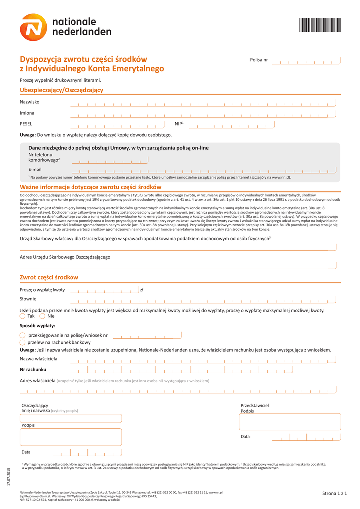 *C047* Dyspozycja zwrotu części środków z Indywidualnego Konta Emerytalnego Polisa nr Proszę wypełnić drukowanymi literami. Ubezpieczający/Oszczędzający Nazwisko Imiona PESEL NIP1 Uwaga: Do wniosku o wypłatę należy dołączyć kopię dowodu osobistego. Dane niezbędne do pełnej obsługi Umowy, w tym zarządzania polisą on-line Nr telefonu komórkowego2 E-mail 2 Na podany powyżej numer telefonu komórkowego zostanie przesłane hasło, które umożliwi samodzielne zarządzanie polisą przez Internet (szczegóły na www.nn.pl). Ważne informacje dotyczące zwrotu części środków Od dochodu oszczędzającego na indywidualnym koncie emerytalnym z tytułu zwrotu albo częściowego zwrotu, w rozumieniu przepisów o indywidualnych kontach emerytalnych, środków zgromadzonych na tym koncie pobierany jest 19% zryczałtowany podatek dochodowy (zgodnie z art. 41 ust. 4 w zw. z art. 30a ust. 1 pkt 10 ustawy z dnia 26 lipca 1991 r. o podatku dochodowym od osób fizycznych). Dochodem tym jest różnica między kwotą stanowiącą wartość środków zgromadzonych na indywidualnym koncie emerytalnym a sumą wpłat na indywidualne konto emerytalne (art. 30a ust. 8 powołanej ustawy). Dochodem przy całkowitym zwrocie, który został poprzedzony zwrotami częściowymi, jest różnica pomiędzy wartością środków zgromadzonych na indywidualnym koncie emerytalnym na dzień całkowitego zwrotu a sumą wpłat na indywidualne konto emerytalne pomniejszoną o koszty częściowych zwrotów (art. 30a ust. 8a powołanej ustawy). W przypadku częściowego zwrotu dochodem jest kwota zwrotu pomniejszona o koszty przypadające na ten zwrot; przy czym za koszt uważa się iloczyn kwoty zwrotu i wskaźnika stanowiącego udział sumy wpłat na indywidualne konto emerytalne do wartości środków zgromadzonych na tym koncie (art. 30a ust. 8b powołanej ustawy). Przy kolejnym częściowym zwrocie przepisy art. 30a ust. 8a i 8b powołanej ustawy stosuje się odpowiednio, z tym że do ustalenia wartości środków zgromadzonych na indywidualnym koncie emerytalnym bierze się aktualny stan środków na tym koncie. Urząd Skarbowy właściwy dla Oszczędzającego w sprawach opodatkowania podatkiem dochodowym od osób fizycznych3 Adres Urzędu Skarbowego Oszczędzającego Zwrot części środków Proszę o wypłatę kwoty zł Słownie Jeżeli podana przeze mnie kwota wypłaty jest większa od maksymalnej kwoty możliwej do wypłaty, proszę o wypłatę maksymalnej możliwej kwoty. n Tak n Nie Sposób wypłaty: n przeksięgowanie na polisę/wniosek nr n przelew na rachunek bankowy Uwaga: Jeśli nazwa właściciela nie zostanie uzupełniona, Nationale‑Nederlanden uzna, że właścicielem rachunku jest osoba występująca z wnioskiem. Nazwa właściciela Nr rachunku Adres właściciela (uzupełnić tylko jeśli właścicielem rachunku jest inna osoba niż występująca z wnioskiem) Oszczędzający Imię i nazwisko (czytelny podpis) Przedstawiciel Podpis Podpis Data Data Wymagany w przypadku osób, które zgodnie z obowiązującymi przepisami mają obowiązek posługiwania się NIP jako identyfikatorem podatkowym, 3 Urząd skarbowy według miejsca zamieszkania podatnika, a w przypadku podatnika, o którym mowa w art. 3 ust. 2a ustawy o podatku dochodowym od osób fizycznych, urząd skarbowy w sprawach opodatkowania osób zagranicznych. 17.07.2015 1 Nationale-Nederlanden Towarzystwo Ubezpieczeń na Życie S.A.; ul. Topiel 12, 00-342 Warszawa; tel. +48 (22) 522 00 00, fax +48 (22) 522 11 11, www.nn.pl Sąd Rejonowy dla m.st. Warszawy; XII Wydział Gospodarczy Krajowego Rejestru Sądowego KRS 25443; NIP: 527-10-02-574, Kapitał zakładowy – 41 000 000 zł, wpłacony w całości Strona 1 z 1