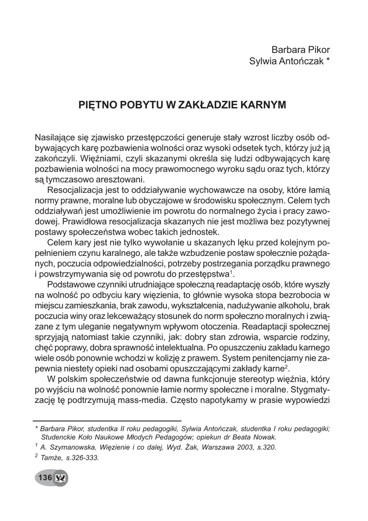 Barbara Pikor Sylwia Antoñczak * PIÊTNO POBYTU W ZAK£ADZIE KARNYM Nasilaj¹ce siê zjawisko przestêpczoœci generuje sta³y wzrost liczby osób odbywaj¹cych karê pozbawienia wolnoœci oraz wysoki odsetek tych, którzy ju¿ j¹ zakoñczyli. WiêŸniami, czyli skazanymi okreœla siê ludzi odbywaj¹cych karê pozbawienia wolnoœci na mocy prawomocnego wyroku s¹du oraz tych, którzy s¹ tymczasowo aresztowani. Resocjalizacja jest to oddzia³ywanie wychowawcze na osoby, które ³ami¹ normy prawne, moralne lub obyczajowe w œrodowisku spo³ecznym. Celem tych oddzia³ywañ jest umo¿liwienie im powrotu do normalnego ¿ycia i pracy zawodowej. Prawid³owa resocjalizacja skazanych nie jest mo¿liwa bez pozytywnej postawy spo³eczeñstwa wobec takich jednostek. Celem kary jest nie tylko wywo³anie u skazanych lêku przed kolejnym pope³nieniem czynu karalnego, ale tak¿e wzbudzenie postaw spo³ecznie po¿¹danych, poczucia odpowiedzialnoœci, potrzeby postrzegania porz¹dku prawnego i powstrzymywania siê od powrotu do przestêpstwa1. Podstawowe czynniki utrudniaj¹ce spo³eczn¹ readaptacjê osób, które wysz³y na wolnoœæ po odbyciu kary wiêzienia, to g³ównie wysoka stopa bezrobocia w miejscu zamieszkania, brak zawodu, wykszta³cenia, nadu¿ywanie alkoholu, brak poczucia winy oraz lekcewa¿¹cy stosunek do norm spo³eczno moralnych i zwi¹zane z tym uleganie negatywnym wp³ywom otoczenia. Readaptacji spo³ecznej sprzyjaj¹ natomiast takie czynniki, jak: dobry stan zdrowia, wsparcie rodziny, chêæ poprawy, dobra sprawnoœæ intelektualna. Po opuszczeniu zak³adu karnego wiele osób ponownie wchodzi w kolizjê z prawem. System penitencjarny nie zapewnia niestety opieki nad osobami opuszczaj¹cymi zak³ady karne2. W polskim spo³eczeñstwie od dawna funkcjonuje stereotyp wiêŸnia, który po wyjœciu na wolnoœæ ponownie ³amie normy spo³eczne i moralne. Stygmatyzacjê tê podtrzymuj¹ mass-media. Czêsto napotykamy w prasie wypowiedzi * Barbara Pikor, studentka II roku pedagogiki, Sylwia Antoñczak, studentka I roku pedagogiki; Studenckie Ko³o Naukowe M³odych Pedagogów; opiekun dr Beata Nowak. 1 A. Szymanowska, Wiêzienie i co dalej, Wyd. ¯ak, Warszawa 2003, s.320. 2 Tam¿e, s.326-333. 136 utrzymane w kategorycznym tonie: „¯aden psychopatyczny gwa³ciciel nie powinien wyjœæ na wolnoœæ, zw³aszcza na warunkowe zwolnienie”3. Zdaniem opinii publicznej „[...] surowe prawo, które karze z ca³¹ bezwzglêdnoœci¹ nawet dzieci, jest sprawiedliwe i skutecznie odstrasza potencjalnych zbrodniarzy”4. Spo³eczeñstwo chêtnie godzi siê na osadzanie przestêpcy w wiêzieniu, jednak¿e jego póŸniejszym losem na wolnoœci nie jest ju¿ zainteresowane. „Ludzie chêtnie widzieliby morderców i gwa³cicieli w kamienio³omach, albo innych tego typu miejscach urz¹dzonych na podobieñstwo obozów koncentracyjnych.”5 Badania polskie wskazuj¹, ¿e nasze spo³eczeñstwo cechuje sk³onnoœæ do silnego emocjonalnego potêpiania zachowañ dewiacyjnych oraz ich sprawców. Stopieñ tego napiêtnowania jest zale¿ny od rodzaju ocenianego zachowania, motywów, które kierowa³y sprawc¹ oraz okolicznoœci, w których pope³niony zosta³ dany czyn. Wobec osób naznaczonych wyrokiem skazuj¹cym na karê pozbawienia wolnoœci, stosowana jest czêsto zasada ograniczonego zaufania. Zatem piêtno pobytu w zak³adzie karnym zak³óca pewne wymiary stosunków spo³ecznych. Dlatego te¿ pozytywny proces readaptacji spo³ecznej jest uzale¿niony od pozytywnego stosunku spo³eczeñstwa wobec osób, które odbywa³y karê pozbawienia wolnoœci6. Niniejsze opracowanie obejmuje próbê zdiagnozowania stosunku m³odzie¿y do by³ych wiêŸniów oraz do kary pozbawienia wolnoœci. 1. Metodologia badañ. W pracy zastosowano metodê sonda¿u diagnostycznego z u¿yciem techniki wywiadu. Narzêdziem badawczym by³ kwestionariusz ankiety w³asnej konstrukcji. Badania przeprowadzono wœród studentów Wy¿szej Szko³y Zarz¹dzania i Administracji w Zamoœciu, ucz¹cych siê w trybie dziennym na kierunkach informatyka i ekonometria, administracja oraz ekonomia. Badaniom ankietowym poddano 31 osób w wieku od 20 do 25 lat (w tym 35,5% kobiet i 64,5% mê¿czyzn). Wœród nich znalaz³o siê 20 studentów zamieszkuj¹cych wieœ oraz 11 osób mieszkaj¹cych w mieœcie. Wœród badanych osób by³o 41,9% studentów administracji, 32,3% informatyki i ekonomerii oraz 25,8% ekonomii. 3 D. Kowalska, K. Bonda, Warunkowi mordercy, „Newsweek” 2005, nr 7, s. 76. I. Ryciak, Tak ma³o lat, tak du¿o z³a, „Newsweek” 2004, nr 44, s. 22. 5 W. Ozminkowski, Odbezpieczeni, „Newsweek” 2004, nr 23, s. 59. 6 B. Post, Reakcje spo³eczne wobec osób skazanych na karê pozbawienia wolnoœci, [w:], B. Ho³yst (red.), Opinia publiczna i œrodki masowego przekazu a ujemne zjawiska spo³eczne, Wydawnictwo Prawnicze, Warszawa 1981, s.196. 4 137 2. Wyniki badañ w³asnych. Analiza danych badawczych wykaza³a, i¿ obojêtny stosunek do by³ych wiêŸniów ma 71,0% respondentów, pozytywny – 16,1%, a niechêtnie odnosi siê do skazanych 12,9% badanych studentów. Pracê w instytucji, w której zatrudniani s¹ byli wiêŸniowie, podjê³oby 64,5% respondentów, w tym 20,0% wyrazi³oby zgodê na wspólne zatrudnienie tylko w przypadku, gdyby znali wczeœniej typ przestêpstwa, za które zostali oni skazani. Przeciwnych wspólnej pracy jest 32,3% osób badanych, z których po³owa swoj¹ odpowiedŸ uzasadnia³a brakiem zaufania do by³ych wiêŸniów. Za stosowaniem kary pozbawienia wolnoœci (wiêzieniem) opowiedzieli siê wszyscy badani studenci. W wiêkszoœci przypadków respondenci stwierdzali, ¿e za pope³nione przestêpstwo nale¿y ponieœæ odpowiedzialnoœæ w postaci sprawiedliwej i adekwatnej do wykroczenia kary. Badani optuj¹ za tym, by najgroŸniejsze jednostki izolowaæ w celu ochrony spo³eczeñstwa. M³odzi ludzie widz¹ potrzebê gruntownej reformy wiêziennictwa i wydzia³u sprawiedliwoœci tak, aby zak³ad 
