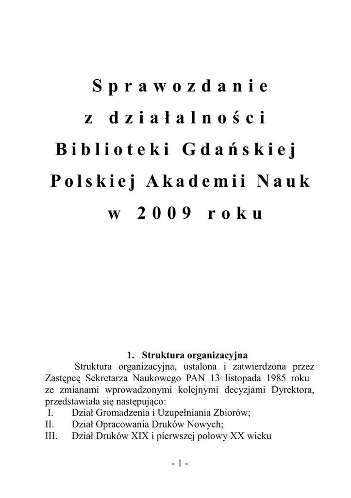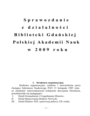 Sprawozdanie z działalności Biblioteki Gdańskiej Polskiej Akademii Nauk w 2009 roku 1. Struktura organizacyjna Struktura organizacyjna, ustalona i zatwierdzona przez Zastępcę Sekretarza Naukowego PAN 13 listopada 1985 roku ze zmianami wprowadzonymi kolejnymi decyzjami Dyrektora, przedstawiała się następująco: I. Dział Gromadzenia i Uzupełniania Zbiorów; II. Dział Opracowania Druków Nowych; III. Dział Druków XIX i pierwszej połowy XX wieku -1- (nabytki do roku 1945); Dział Udostępniania i Informacji Naukowej; Dział Zbiorów Specjalnych: Pracownia Dokumentów Wtórnych i Informatycznych ; Pracownia Dokumentów Życia Społecznego; Pracownia Grafiki; Pracownia Kartografii; Pracownia Muzykologiczna; Pracownia Numizmatów, Ekslibrisów i Fotografii; Pracownia Rękopisów; Pracownia Starych Druków; Pracownia Teatrologiczna; VI. Dział Konserwatorsko-Introligatorski: Pracownia Konserwacji; Pracownia Introligatorska; Laboratorium Odkwaszania Druków; VII. Dział Finansowo – Księgowy; VIII. Dział Administracyjno – Gospodarczy: Komórka ds. Pracowniczych; Komórka ds. Techniczno-Gospodarczych; Komórka ds. BHP; IX. Sekretariat; X. Archiwum Zakładowe; XI. Redakcja Wydawnictw; XII. Kancelaria Obrony Cywilnej. 2. Rada Naukowa IV. V. Rada Naukowa powołana decyzją Przewodniczącego Wydziału I Nauk Społecznych PAN z dnia 24 stycznia 2007 roku, działała w następującym składzie: prof. dr hab. Józef Borzyszkowski prof. dr hab. Jan Drwal mgr Michał Jagiełło prof. dr hab. Tomasz Jasiński mgr Ewa Kobierska – Maciuszko -2- prof. dr hab. inż. Aleksander Kołodziejczyk prof. dr hab. Jacek Marecki prof. dr hab. Mieczysław Nurek mgr Ewa Ogonowska dr Maria Pelczar mgr Wanda Pętlicka dr Dobrosława Platt prof. dr hab. Jan Strelau mgr Stefania Sychta dr Zofia Tylewska-Ostrowska mgr Anna Walczak W roku 2009 Rada Naukowa odbyła trzy posiedzenia. Na pierwszym posiedzeniu w dniu 30.03.2009 członkom Rady Naukowej zostało przedstawione przez Dyrektora sprawozdanie z działalności Biblioteki w roku 2008, oraz aktualna sytuacja Biblioteki. Z wyraźnym zadowoleniem przyjęto wiadomość o znacznych zmianach w zakresie uposażeń pracowników. Posiedzeniu Rady Naukowej towarzyszyła prezentacja zeskanowanych zbiorów BGPAN dostępnych na stronie NASK – www.polska.pl Drugie posiedzenie Rady Naukowej w dniu 03.07.2009 r. miało odmienny charakter. Członkom Rady zostały przedstawione przez Przewodniczącego Komisji Konkursowej wyniki prac Komisji powołanej do wyłonienia kandydata na dyrektora BG PAN w latach 2010-2013. Rada Naukowa w tajnym głosowaniu dokonała wyboru kandydata. Na trzecim posiedzeniu w dniu 27.11.2009 r. dyrektor dr Maria Pelczar omówiła najważniejsze dokonania roku 2009, szczególną uwagę poświęcając Pomorskiej Bibliotece Cyfrowej, a także postępowi prac w zakresie nowoczesnego opracowywania zbiorów, w tym zbiorów specjalnych i zbiorów XIX wieku. Wicedyrektor mgr Wanda Pętlicka przedstawiła plan prac naukowych i wydawniczych na rok 2010, a dyrektor dr Maria Pelczar wymieniła sprawy, które zdaniem dyrekcji winny być rozwiązane lub kontynuowane w roku 2010, tak z zakresu -3- podpisanych umów o współpracy jak również w zakresie inwestycji i remontów, niezależnie od tego, kto będzie sprawował funkcję dyrektora BG PAN. 3. Kolegium Biblioteki Gdańskiej Kolegium Biblioteki Gdańskiej odbyło dziesięć posiedzeń, na których zgodnie z przyjętym planem pracy Kolegium omawiano bieżące problemy: wyniki pracy w roku 2008; problemy poszczególnych Działów i Pracowni; stan zaawansowania prac nad elektroniczną formą dotychczasowych katalogów kartkowych i nad dostępnością informacji o zbiorach w internecie poprzez Pomorską Bibliotekę Cyfrową i Bibliotekę Cyfrową Biblioteki Gdańskiej, a także portal NASK; prace Komisji Szkoleniowej i Skontrowej; aktualną sytuację kadrową i finansową jednostki, w tym także wykorzystanie urlopów -4- wypoczynkowych; projekt budżetu Biblioteki Gdańskiej na rok 2010 i jego podział, a także podział funduszu socjalnego i mieszkaniowego i jego wykorzystanie ; plany pracy na rok 2010; aktualne problemy bieżące. 4. Skład osobowy na dzień 31 grudnia 2009 roku Ogółem w dniu 31 grudnia 2009 roku pracowało w Bibliotece Gdańskiej PAN 76 pracowników pełnozatrudnionych i 30 osób w grupie pracowników niepełnozatrudnionych. Łącznie 106 osób. Pracownicy pełnozatrudnieni: 76 osób Pracownik naukowo – badawczy: adiunkt dr Maria Pelczar -5- Bibliotekarze dyplomowani - starsi kustosze dyplomowani: mgr Roman Dzięgielewski mgr Jan Kordel* mgr Zenobia Pszczółkowska mgr Krystyna Świerkosz - kustosz dyplomowany: mgr Ewa Penkalla Pracownicy służby bibliotecznej - starsi kustosze: dr Aleksander Baliński mgr Elżbieta Czapiewska mgr Ewa Czerniakowska mgr Małgorzata Czerniakowska mgr Grażyna Ewert mgr Katarzyna Garstka mgr Danuta Lewczuk Anna Łaszewska mgr Maria Ożugowska mgr Wanda Pętlicka mgr Maria Sokołowska mgr Anna Szturgulewska mgr Joanna Śliwa mgr Izabela Wajer-Kjellander mgr Anna Walczak mgr inż. Anna Wytyk** * specjalista ds. obrony cywilnej i informacji niejawnych- dodatkowe ½ etatu ** sprzątanie na 1/5 etatu - starsi bibliotekarze: Józefa Klimkowska mgr Agnieszka Kubiak mgr Magdalena Madeja-Grzyb mgr Marta Pawlik -6- mgr Anna Potorska Urszula Preiss dr Zofia Tylewska-Ostrowska mgr Anna Więcek - bibliotekarze: mgr Dagmara Binkowska mgr Aneta Bury mgr Tomasz Larczyński mgr Ewa Łuniewska mgr Paweł Pinkiewicz Teresa Wieczerzak - młodsi bibliotekarze: Beata Formella Iwona Juras mgr Agata Larczyńska mgr Ewa Lichnerowicz Michał Morawski mgr Maria Otto Izabela Pawłowicz Grażyna Szymańska - starsi magazynierzy biblioteczni: Andrzej Czajka Małgorzata Dudzińska Krystyna Garbacz Maria Jurczyk* Bogusława Kowalska Stefania Kozłowska Dorota Kusz Grażyna Müller * sprzątanie na 1/3 etatu Danuta Nowak Grażyna Ogrodowczyk Anna Raplis Elżbieta Wasielewska Barbara 