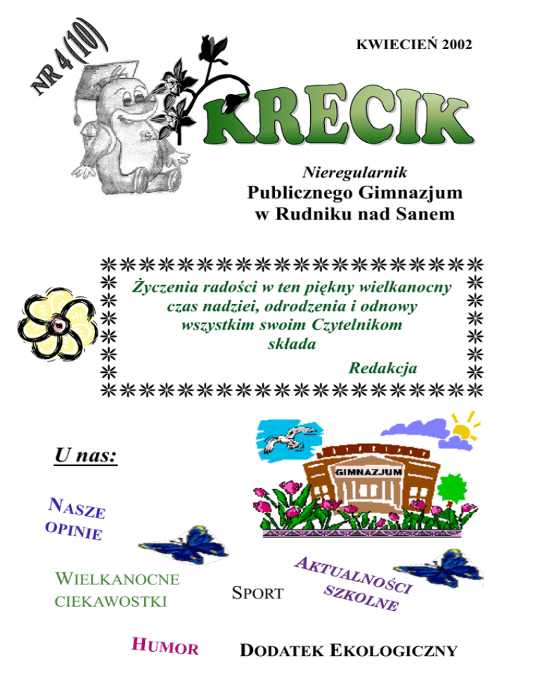 KWIECIEŃ 2002 Nieregularnik Publicznego Gimnazjum w Rudniku nad Sanem Życzenia radości w ten piękny wielkanocny czas nadziei, odrodzenia i odnowy wszystkim swoim Czytelnikom składa Redakcja U nas: NASZE OPINI E WIELKANOCNE CIEKAWOSTKI HUMOR A KT SPORT UA L NOŚ CI SZK OLN E DODATEK EKOLOGICZNY 1 ześć! To już dziesiąty, jubileuszowy, numer naszej gazetki. Gdy zaczynaliśmy, nikt nie wróżył nam tak długiego życia. Mimo to jednak się trzymamy i czekamy na większe grono czytelników. Cieszymy się, że jesteśmy z Wami tak długo i jednocześnie zapraszamy do lektury kolejnego numeru „Krecika”. Redakcja W tym numerze: Z życia Gimnazjum Aktualności szkolne Nasze opinie Reportaż Fotoreportaż Ciekawostki Wywiad numeru Wierszomania Wielkanocne ciekawostki Nasza recenzja Sport Muzyka Krecika Gwiazda Krecika Z życia gwiazd str. 3 str. 4 str. 5 str. 6 str. 8 str. 9 str. 10 str. 11 str. 13 str. 15 str. 16 str. 18 str. 18 str. 19 Redakcja: Ewelina Tofilska, Małgorzata Florek, Edyta Chrabąszcz, Dominika Pędlowska, Natalia Potoniec, Justyna Zając i Patryk Sobota z klasy III D oraz Anna Sztaba, Karolina Olko i Ewelina Olszowy z klasy I B Opieka nad Redakcją: mgr inż. Aleksandra Tofilska Składanie, korekta tekstu i oprawa graficzna: Ewelina Tofilska 2 Z życia Gimnazjum... KALENDARIUM 4 marzec - II etap Szkolnego Konkursu Matematycznego „Rachmistrz na Plus” 8 marzec Dzień Kobiet 11 - 13 marzec - Rekolekcje szkolne 15 marzec - II etap Szkolnego Konkursu Geograficznego „Wędrówki dalekie i bliskie” 21 marzec - Pierwszy Dzień Wiosny Konkurs Matematyczny „Kangur” 22 marzec - III etap Szkolnego Konkursu Geograficznego 24 marzec - Niedziela Palmowa 27 marzec - Apel wielkanocny 28 marzec - 2 kwiecień - przerwa świąteczna 31 marzec - Wielkanoc 1 kwiecień - Śmigus - Dyngus + Prima Aprilis Tata do Jasia: - Zabrałbyś się za naukę. Od tego jeszcze nikt nie umarł. - Prawdę powiedziawszy, wolałbym nie ryzykować. 3 Aktualności szkolne... Dzień Kobiet, Dzień Kobiet - niech każdy się dowie, że w szkole był Dzień Kobiet. I to jaki!!! Chłopcy nas kompletnie zaskoczyli. „Zniknęli jak kamfory” i tak samo niespodziewanie pojawili się w trakcie pierwszej lekcji. Postarali się dla klasowych koleżanek i pań nauczycielek o kwiaty, a czasem też słodkości czy kubeczki. W tym dniu chłopcy zmienili się w prawdziwych dżentelmenów. Czy tak nie mogłoby być codziennie? Dzień Kobiet w klasach drugich i trzecich wyglądał podobnie. Podczas lekcji chodziła delegacja wystrojonych chłopców i rozdawała lizaki. Po korytarzach, na których rozbrzmiewała muzyka puszczana z radioli, snuły się gromadki dziewczyn z kwiatami, misiami lub porcelanowymi figurkami. Żeńska część grona pedagogicznego i pracowników szkoły otrzymała od uczniów i nauczycieli kwiaty i drobne upominki. Dziewczyny mogły liczyć na „taryfę ulgową” podczas lekcji, a zwłaszcza w przypadku odpowiadania przy tablicy. Większość chłopców tego dnia naprawdę nas zadziwiła. Napisałam „większość”, ponieważ nie wszyscy wykazali się dobrym wychowaniem. Nie popisała się męska (?) część klasy III d , która postanowiła nie obchodzić Dnia Kobiet i nie wysiliła się nawet na marnego kwiatka dla swoich koleżanek (od których regularnie odpisują zadania domowe), ani nawet dla nauczycielek. Podobnie wyglądało to w klasie II f. Popsuli oni zdecydowanie opinię chłopców, mimo to jednak pozostałe solenizantki były mile zaskoczone tą jednodniową odmianą swoich kolegów. A już następnego dnia wszystko wróciło do normy... Ania Sz., Ewelina O. (klasy I) i Ewka (klasy III) 4 Nasze opinie... Pierwszy Dzień WIOSNY Dzisiaj przedstawiamy Wam opinie uczniów na temat obchodów w naszej szkole Pierwszego Dnia Wiosny. Nasze koleżanki nie popisały się zbytnio podczas meczów.i koleżanki Panie nauczycielki były Nasi koledzy nie popisali się niezbytnio do pokonania, za to koledzy obronipodczasale meczów. Nauczyciele li honor uczniów -nauczyciele poniebyli nie do pokonania. śli druzgocącą porażkę. COOL!!! Poprzednie lata były fajniejsze. Karykatura szkoły, „Klasolada” były znakomitymi pomysłami. W tym roku podobał mi się tylko mecz. Wybory Miss i Mistera były do bani... Bardzo udany pomysł z meczem !! Piękna korona i szarfa Miss Szkoły są siebie warte. Nie wiem, co się działo w szkole - byłam na wagarach. Pomysłowość z konkursami: „Szansa na sukces” i Wybory Miss i Mistera Szkoły. Trudziłam się nad zadaniami z „Kangura”. Zebrała: kl. III d 5 Reportaż... Wiosna przywitana Przywitaliśmy wiosnę wprawdzie bez topienia marzanny, ale i tak było super. Nowa pora roku została przywitana naszymi szaleństwami i chyba się z tego powodu nie obrazi. Od samego początku zaczęła się ostra rywalizacja pomiędzy klasami. Równocześnie rozgrywała się „Klasolada”, konkurs plastyczny i oczywiście „halówka”. W zmaganiach sportowych bezkonkurencyjnie zwyciężyli chłopcy z klasy I a. Sama widziałam dwa mecze i wiem, że emocje na hali sięgały zenitu. Tym bardziej należą się im duże gratulacje. W „Klasoladzie” zwyciężyła klasa I b, wygrywając kolejno starcia z klasą d, f i w finale z kl. I a. To była dla nich pestka, biorąc pod uwagę to, ile punktów zdobyli, a była to niezła sumka ponad 1500 punktów. Według jury najlepszą karykaturę szkoły wykonała kl. I a. Na plakatach można było dostrzec pająki no i oczywiście pana dyrektora. Najbardziej emocjonującym konkursem okazała się „Randka w ciemno”. Prowadzona ona była przez Karolinę Olko. Jednak to nie Karolina stała się gwiazdą dnia, był nią wybierający, którym później okazał się pan dyrektor. Miał on przed sobą trudny wybór, bo kandydatek było aż siedem, a w dodatku wszystkie były śliczne, miłe i inteligentne. Wygrała Diana Konior. Pani Grażyna Freyer, która była drugą osobą wybierającą, poradziła sobie
