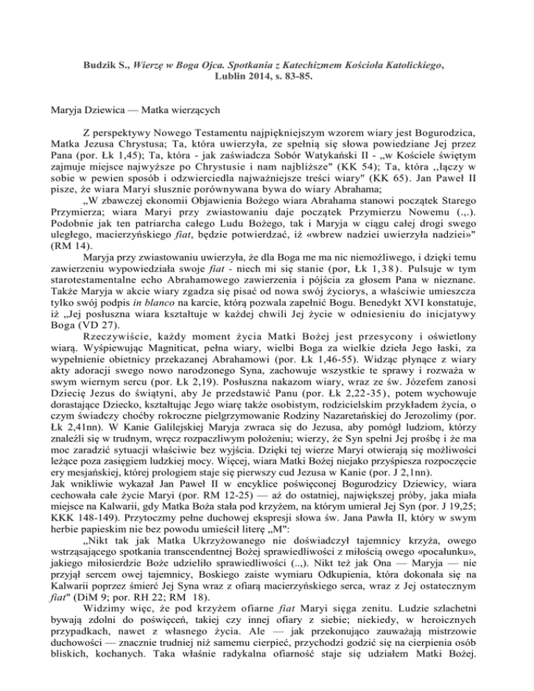 Budzik S., Wierzę w Boga Ojca. Spotkania z Katechizmem Kościoła Katolickiego, Lublin 2014, s. 83-85. Maryja Dziewica — Matka wierzących Z perspektywy Nowego Testamentu najpiękniejszym wzorem wiary jest Bogurodzica, Matka Jezusa Chrystusa; Ta, która uwierzyła, ze spełnią się słowa powiedziane Jej przez Pana (por. Łk 1,45); Ta, która - jak zaświadcza Sobór Watykański II - „w Kościele świętym zajmuje miejsce najwyższe po Chrystusie i nam najbliższe" (KK 54); Ta, która ,,łączy w sobie w pewien sposób i odzwierciedla najważniejsze treści wiary" (KK 65). Jan Paweł II pisze, że wiara Maryi słusznie porównywana bywa do wiary Abrahama; „W zbawczej ekonomii Objawienia Bożego wiara Abrahama stanowi początek Starego Przymierza; wiara Maryi przy zwiastowaniu daje początek Przymierzu Nowemu (.,.). Podobnie jak ten patriarcha całego Ludu Bożego, tak i Maryja w ciągu całej drogi swego uległego, macierzyńskiego fiat, będzie potwierdzać, iż «wbrew nadziei uwierzyła nadziei»" (RM 14). Maryja przy zwiastowaniu uwierzyła, że dla Boga me ma nic niemożliwego, i dzięki temu zawierzeniu wypowiedziała swoje fiat - niech mi się stanie (por, Łk 1, 3 8 ) . Pulsuje w tym starotestamentalne echo Abrahamowego zawierzenia i pójścia za głosem Pana w nieznane. Także Maryja w akcie wiary zgadza się pisać od nowa swój życiorys, a właściwie umieszcza tylko swój podpis in blanco na karcie, którą pozwala zapełnić Bogu. Benedykt XVI konstatuje, iż „Jej posłuszna wiara kształtuje w każdej chwili Jej życie w odniesieniu do inicjatywy Boga (VD 27). Rzeczywiście, każdy moment życia Matki Bożej jest przesycony i oświetlony wiarą. Wyśpiewując Magniticat, pełna wiary, wielbi Boga za wielkie dzieła Jego łaski, za wypełnienie obietnicy przekazanej Abrahamowi (por. Łk 1,46-55). Widząc płynące z wiary akty adoracji swego nowo narodzonego Syna, zachowuje wszystkie te sprawy i rozważa w swym wiernym sercu (por. Łk 2,19). Posłuszna nakazom wiary, wraz ze św. Józefem zanosi Dziecię Jezus do świątyni, aby Je przedstawić Panu (por. Łk 2,22-35 ) , potem wychowuje dorastające Dziecko, kształtując Jego wiarę także osobistym, rodzicielskim przykładem życia, o czym świadczy choćby rokroczne pielgrzymowanie Rodziny Nazaretańskiej do Jerozolimy (por. Łk 2,41nn). W Kanie Galilejskiej Maryja zwraca się do Jezusa, aby pomógł ludziom, którzy znaleźli się w trudnym, wręcz rozpaczliwym położeniu; wierzy, że Syn spełni Jej prośbę i że ma moc zaradzić sytuacji właściwie bez wyjścia. Dzięki tej wierze Maryi otwierają się możliwości leżące poza zasięgiem ludzkiej mocy. Więcej, wiara Matki Bożej niejako przyśpiesza rozpoczęcie ery mesjańskiej, której prologiem staje się pierwszy cud Jezusa w Kanie (por. J 2,1nn). Jak wnikliwie wykazał Jan Paweł II w encyklice poświęconej Bogurodzicy Dziewicy, wiara cechowała całe życie Maryi (por. RM 12-25) — aż do ostatniej, największej próby, jaka miała miejsce na Kalwarii, gdy Matka Boża stała pod krzyżem, na którym umierał Jej Syn (por. J 19,25; KKK 148-149). Przytoczmy pełne duchowej ekspresji słowa św. Jana Pawła II, który w swym herbie papieskim nie bez powodu umieścił literę „M": „Nikt tak jak Matka Ukrzyżowanego nie doświadczył tajemnicy krzyża, owego wstrząsającego spotkania transcendentnej Bożej sprawiedliwości z miłością owego «pocałunku», jakiego miłosierdzie Boże udzieliło sprawiedliwości (..,). Nikt też jak Ona — Maryja — nie przyjął sercem owej tajemnicy, Boskiego zaiste wymiaru Odkupienia, która dokonała się na Kalwarii poprzez śmierć Jej Syna wraz z ofiarą macierzyńskiego serca, wraz z Jej ostatecznym fiat" (DiM 9; por. RH 22; RM 18). Widzimy więc, że pod krzyżem ofiarne fiat Maryi sięga zenitu. Ludzie szlachetni bywają zdolni do poświęceń, takiej czy innej ofiary z siebie; niekiedy, w heroicznych przypadkach, nawet z własnego życia. Ale — jak przekonująco zauważają mistrzowie duchowości — znacznie trudniej niż samemu cierpieć, przychodzi godzić się na cierpienia osób bliskich, kochanych. Taka właśnie radykalna ofiarność staje się udziałem Matki Bożej. Benedykt XVI z charakterystyczną dla siebie teologiczną celnością powie: „Sprzeciw wobec Syna godzi również w Matkę i rani Jej serce. Gdy stanie się radykalny, ten Krzyż staje się dla Niej mieczem, który przenika duszę. Od Maryi możemy się uczyć autentycznego współcierpienia, całkowicie wolnego od sentymentalizmu, w przyjmowaniu cierpienia drugiego jako własnego. Niewrażliwość, obojętność wobec cierpienia drugiego Ojcowie Kościoła uważali za postawę typowo pogańską. Wiara chrześcijańska przeciwstawia temu Boga, który cierpi razem z ludźmi i w ten sposób pociąga nas do współcierpienia. Mater Dolorosa, Matka z mieczem w sercu, jest prawzorem tej najgłębszej postawy wiary chrześcijańskiej"'. Kościół, rozważając rolę Bogurodzicy w dziele Odkupienia, podkreśla, ze nie była Ona jakimś biernym narzędziem w rękach Bożej Opatrzności, lecz „wolną wiarą i posłuszeństwem współpracowała w dziele ludzkiego zbawienia" (KK 56; por. RM 22). Tym bardziej więc właśnie Maryja może stanowić wzór dla współczesnego człowieka wyjątkowo przeczulonego na punkcie swej wolności. Najkrócej rzecz ujmując, wierzyć wzorem Bogarodzicy, to znaczy w pełnej wolności przyjąć wolę Bożą objawioną nam przez Kościół, bezgranicznie jej zaufać i konsekwentnie, wiernie ją wypełniać, nie zrażając się żadnymi przeciwnościami. Chrześcijanin, który wstąpi na tę maryjną drogę wiary, może być pewien wsparcia Bogurodzicy, nieustannie gotowej pomagać. Wzięta do nieba Maryja, jako Matka Kościoła kontynuuje swą misję współpracy z Chrystusem w dziele Odkupienia; przez „wielorakie wstawiennictwo ustawicznie wyjednuje nam dary wiecznego zbawienia" (KK 62), stając