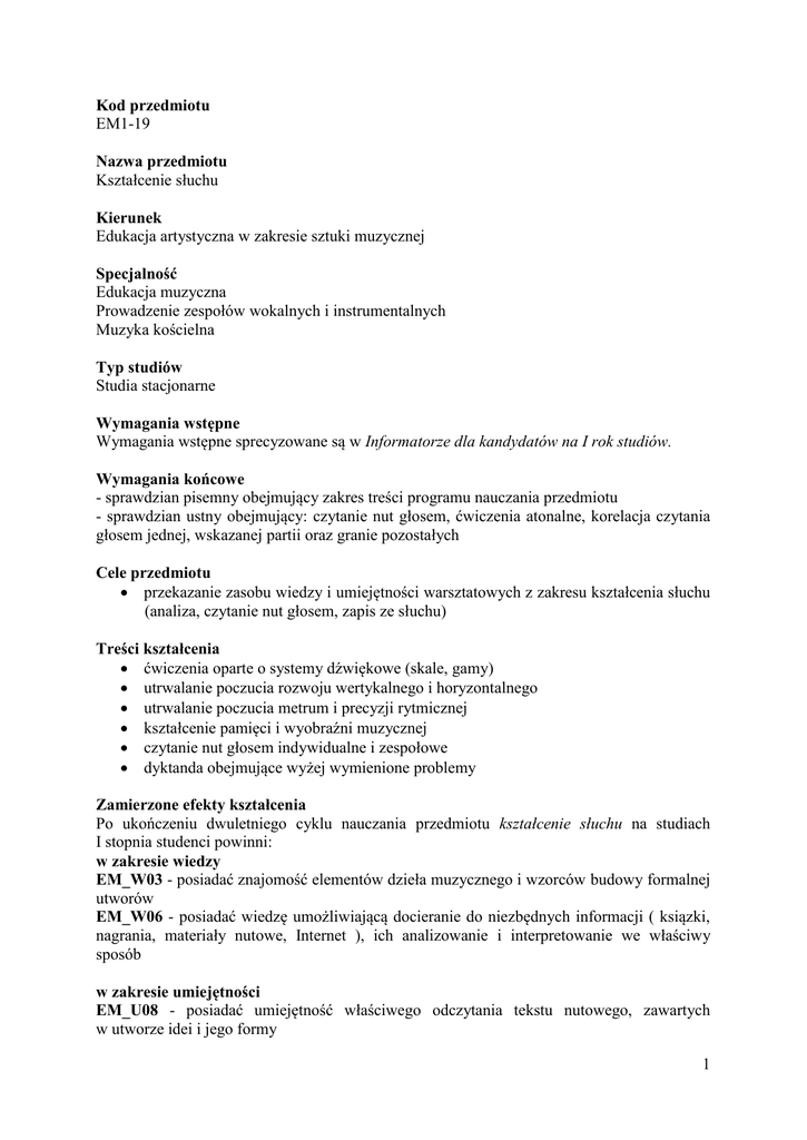 Kod przedmiotu EM1-19 Nazwa przedmiotu Kształcenie słuchu Kierunek Edukacja artystyczna w zakresie sztuki muzycznej Specjalność Edukacja muzyczna Prowadzenie zespołów wokalnych i instrumentalnych Muzyka kościelna Typ studiów Studia stacjonarne Wymagania wstępne Wymagania wstępne sprecyzowane są w Informatorze dla kandydatów na I rok studiów. Wymagania końcowe - sprawdzian pisemny obejmujący zakres treści programu nauczania przedmiotu - sprawdzian ustny obejmujący: czytanie nut głosem, ćwiczenia atonalne, korelacja czytania głosem jednej, wskazanej partii oraz granie pozostałych Cele przedmiotu przekazanie zasobu wiedzy i umiejętności warsztatowych z zakresu kształcenia słuchu (analiza, czytanie nut głosem, zapis ze słuchu) Treści kształcenia ćwiczenia oparte o systemy dźwiękowe (skale, gamy) utrwalanie poczucia rozwoju wertykalnego i horyzontalnego utrwalanie poczucia metrum i precyzji rytmicznej kształcenie pamięci i wyobraźni muzycznej czytanie nut głosem indywidualne i zespołowe dyktanda obejmujące wyżej wymienione problemy Zamierzone efekty kształcenia Po ukończeniu dwuletniego cyklu nauczania przedmiotu kształcenie słuchu na studiach I stopnia studenci powinni: w zakresie wiedzy EM_W03 - posiadać znajomość elementów dzieła muzycznego i wzorców budowy formalnej utworów EM_W06 - posiadać wiedzę umożliwiającą docieranie do niezbędnych informacji ( ksiązki, nagrania, materiały nutowe, Internet ), ich analizowanie i interpretowanie we właściwy sposób w zakresie umiejętności EM_U08 - posiadać umiejętność właściwego odczytania tekstu nutowego, zawartych w utworze idei i jego formy 1 EM_U11 - wykazywać umiejętność samodzielnego doskonalenia warsztatu technicznego EM_U13 - opanować czytanie nut w stopniu wystarczającym zarówno dla zrozumienia muzyki, jak i dla biegłego czytania nut głosem EM_U14 - posiadać biegłą znajomość w zakresie słuchowego rozpoznawania materiału muzycznego, zapamiętywania go i operowania nim w zakresie kompetencji społecznych EM_K01- wykazywać potrzebę uczenia się przez całe życie EM_K02 - posiadać umiejętność samodzielnego podejmowania niezależnych prac,wykazując się umiejętnościami zbierania ,analizowania i interpretowania informacji, rozwijania idei i formułowania krytycznej argumentacji EM_K03 - posiadać wewnętrzną motywację i umiejętność organizacji własnej i zespołowej pracy Formy kształcenia Wykład grupowy Nakład pracy studenta niezbędny do osiągnięcia zamierzonych efektów kształcenia Rok I II Semestr 1 2 3 4 Punkty ECTS 2 2 2 2 Liczba godzin 2 2 2 2 w tygodniu Rodzaj zaliczenia s sk s sk Legenda s – zaliczenie ze stopniem sk – zaliczenie ze stopniem komisyjne III 5 6 Kryteria oceny Przy ocenianiu studenta brane są pod uwagę umiejętności wynikające z realizacji materiału przewidzianego programem w formie: - różnego typu dyktand - czytania nut głosem indywidualnie i w zespole Literatura W. Aleksiejew - Garmoniczeskoje solfeggio M. antal - red. 230 kanonów klasycznych G. April - 36 solfeggirn J. S. Bach - 371 chorałów 4-gł. A. Bertalotti - Solfeż D. Dobrowolska-Marucha - Dyktanda muzyczne D. Dobrowolska-Marucha - Ćwiczenia do kształcenia słuchu, wybór z utworów F. Chopina D. Dobrowolska-Marucha - Czytanie nut głosem – wybór z podręcznika Larsa Edmunda D. Doleżil - Nauka solfeżu i elementarnego rytmu P. Draganierow - Solfeggio H. Danyszowa, Z. Iszkowska, J. Jargoń, M. Leitner, K. Moszumańska-Nazar - Zbiór ćwiczeń do kształcenia słuchu J. Dzielska - Materiały pomocnicze do kształcenia słuchu J. Dzielska, L. Kaszycki - Podręcznik do kształcenia słuchu M. Dziewulska, A. Frączkiewicz, K. Palowska - Materiały do kształcenia słuchu 2 A. Finck, G. Theurin - Schule des Blattlehrens E. Gaertner – Solfaggien Album K. Hławiczka - Solfeż polski T. Jarzęcki - Zbiór dyktand do szkoły muzycznej II stopnia Kałmykow i Fridken - Solfeggio odnogolesnoje S. Kazuro - Solfeggio, czyli nauka czytania nut głosem Z. Kodaly - 33 ćwiczenia do kształcenia słuchu Z. Kodaly - 66 2 – gł. ćwiczeń do kształcenia słuchu Z. Kodaly - 77 2-gł ćwiczeń do kształcenia słuchu Z. Kodaly - Materiały do kształcenia słuchu Z. Kodaly – Tricinia W. Kulikowski - 100 kanonów Laduchin - Odnogolesnoje solfeggio J. K. Lasocki - Mały solfeż J. K. Lasocki - Solfeż cz. I, II J. K. Lasocki - Solfeż cz. I – III F. Lamperii - 8 solfeggi T. Mjuller - Trechgolesnoje diktanty A. Ostrowski - Solfeggio A. Ostrowski - Uczebnik solfeggio J. Puzderka - Sborowa intonacje J. Peter - 165 kanonów J. Peret-Ziemlańska - Ćwiczenia do samodzielnego kształcenia słuchu J. Peret-Ziemiańska, E. Szewczyk - Uczymy się solfeżu J. Powrożniak - Wszyscy śpiewamy z nut W. Raczkowski - Materiały do kształcenia słuchu A. Rubec - Odnogolesnoje solfeggio W. Sokołow - Naczalnoje solfeggio W. Sokołow - Trigolesnoje solfeggio W. Sokołow - Mnogolesnoje solfeggio P. Schenk - Schule des Blattsingens L. Stark - Solfegien in Album J. Subel - Materiały do kształcenia słuchu cz. I, II E. Szewczyk - Materiały do czytania nut głosem I. Targońska - Ćwiczenia do kształcenia słuchu I. Targońska - Podstawy korekty błędów M. Wacholc - Czytanie nut głosem cz. I, II, III F. Wesołowski - Materiały do nauki o skalach muzycznych Język wykładowy Polski, istnieje możliwość prowadzenia zajęć w języku francuskim Prowadzący ad. dr hab. Ewa Grygar st. wykł. Irena Zathey-Tom 3