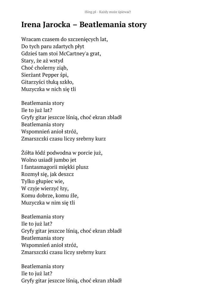 iSing.pl - Każdy może śpiewać! Irena Jarocka – Beatlemania story Wracam czasem do szczenięcych lat, Do tych paru zdartych płyt Gdzieś tam stoi McCartney'a grat, Stary, że aż wstyd Choć cholerny ziąb, Sierżant Pepper śpi, Gitarzyści tłuką szkło, Muzyczka w nich się tli Beatlemania story Ile to już lat? Gryfy gitar jeszcze lśnią, choć ekran zbladł Beatlemania story Wspomnień anioł stróż, Zmarszczki czasu liczy srebrny kurz Żółta łódź podwodna w porcie już, Wolno usiadł jumbo jet I fantasmagorii miękki plusz Rozmył się, jak deszcz Tylko głupiec wie, W czyje wierzyć łzy, Komu dobrze, komu źle, Muzyczka w nim się tli Beatlemania story Ile to już lat? Gryfy gitar jeszcze lśnią, choć ekran zbladł Beatlemania story Wspomnień anioł stróż, Zmarszczki czasu liczy srebrny kurz Beatlemania story Ile to już lat? Gryfy gitar jeszcze lśnią, choć ekran zbladł Beatlemania story Wspomnień anioł stróż, Zmarszczki czasu liczy srebrny kurz Słowa: brak danych Muzyka: brak danych Rok wydania: 1987 Płyta: Irena Jarocka II