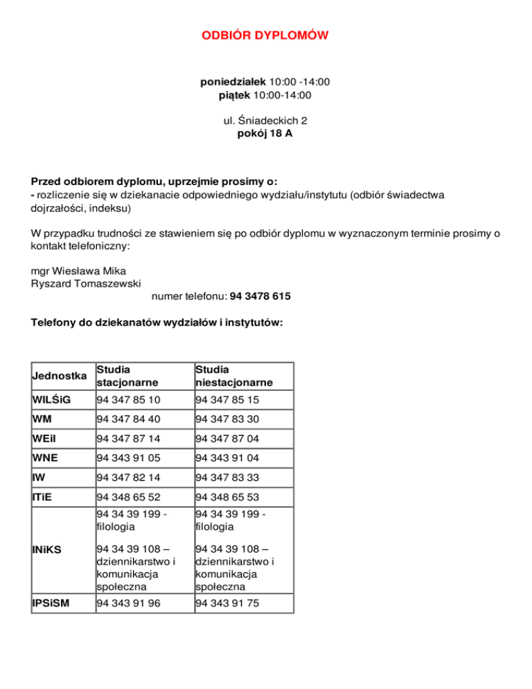 ODBIÓR DYPLOMÓW poniedziałek 10:00 -14:00 piątek 10:00-14:00 ul. Śniadeckich 2 pokój 18 A Przed odbiorem dyplomu, uprzejmie prosimy o: - rozliczenie się w dziekanacie odpowiedniego wydziału/instytutu (odbiór świadectwa dojrzałości, indeksu) W przypadku trudności ze stawieniem się po odbiór dyplomu w wyznaczonym terminie prosimy o kontakt telefoniczny: mgr Wiesława Mika Ryszard Tomaszewski numer telefonu: 94 3478 615 Telefony do dziekanatów wydziałów i instytutów: Jednostka Studia stacjonarne Studia niestacjonarne WILŚiG 94 347 85 10 94 347 85 15 WM 94 347 84 40 94 347 83 30 WEiI 94 347 87 14 94 347 87 04 WNE 94 343 91 05 94 343 91 04 IW 94 347 82 14 94 347 83 33 ITiE 94 348 65 52 94 348 65 53 94 34 39 199 filologia 94 34 39 199 filologia INiKS 94 34 39 108 – dziennikarstwo i komunikacja społeczna 94 34 39 108 – dziennikarstwo i komunikacja społeczna IPSiSM 94 343 91 96 94 343 91 75