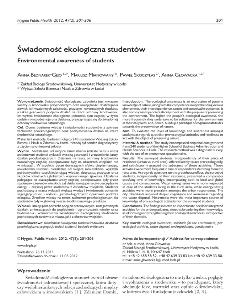 Bednarek-Gejo Hygeia Public Health A, Mianowany 2012, 47(2): M, Skoczylas 201-206P, Głowacka A. Świadomość ekologiczna studentów 201 Świadomość ekologiczna studentów Environmental awareness of students Anna Bednarek-Gejo 1,2/, Mariusz Mianowany 1/, Paweł Skoczylas 2/, Anna Głowacka 1,2/ 1/ 2/ Zakład Biologii Środowiskowej, Uniwersytet Medyczny w Łodzi Wyższa Szkoła Biznesu i Nauk o Zdrowiu w Łodzi Wprowadzenie. Świadomość ekologiczna człowieka jest wyrazem wiedzy o środowisku przyrodniczym oraz umiejętności dostrzegania zjawisk, ich wzajemnych zależności, przyczyn i ewentualnych skutków, a także gotowości podjęcia działań na rzecz ochrony środowiska. Im wyższa świadomość ekologiczna jednostki, tym częściej w życiu codziennym podejmuje ona działania, przyczyniające się do świadomej ochrony środowiska naturalnego. Cel. Ocena poziomu wiedzy i świadomości studentów z zakresu zachowań proekologicznych oraz podejmowania działań na rzecz środowiska naturalnego. Materiał i metoda. Badaniem objęto 240 studentów Wyższej Szkoły Biznesu i Nauk o Zdrowiu w Łodzi. Metodą był sondaż diagnostyczny z użyciem anonimowej ankiety. Wyniki. Niezależnie od miejsca zamieszkania (miasto versus wieś) ankietowani studenci wykazali wysoką gotowość i zrozumienie istoty działań proekologicznych. Działania na rzecz ochrony środowiska naturalnego częściej podejmowane były na obszarach wiejskich niż w miastach. W aspekcie pytań dotyczących efektu cieplarnianego, ankietowani studenci, niezależnie od miejsca zamieszkania, wykazali porównywalnie satysfakcjonującą wiedzę, dotyczącą przyczyn oraz skutków lokalnych i globalnych wspomnianego zjawiska. Działania polegające na oszczędzaniu wody częściej podejmowane były przez studentów z terenów wiejskich, zaś działania mające na celu oszczędzanie energii – częściej przez studentów z ośrodków miejskich. Studenci pochodzący z miasta wykazali większą wiedzę i świadomość odnośnie segregacji śmieci i wyboru „proekologicznych” opakowań podczas zakupów. Źródłem wiedzy na temat zachowań proekologicznych dla studentów były w głównej mierze środki masowego przekazu. Wnioski. Istnieje pilna potrzeba podjęcia przemyślanych i zintegrowanych działań, zmierzających do pogłębienia i ugruntowania wiedzy oraz budowania i wzmocnienia świadomości ekologicznej studentów pochodzących zarówno z miasta, jak i z obszarów wiejskich. Introduction. The ecological awareness is an expression of genuine knowledge of nature, along with the competence in apprehending various phenomena, their interdependence, causes and conceivable outcomes; it also encompasses people’s alacrity to act with the purpose of preserving the environment. The higher the people’s ecological awareness, the more frequently they undertake to be solicitous for the environment in their daily lives, and, hence, build up a paradigm of cognizant attitudes towards the preservation of nature. Aim. To evaluate the level of knowledge and awareness amongst students as regards quotidian pro-ecological attitudes and readiness to act with the object of preserving nature. Material & method. The study encompassed empirical data gathered from 240 students of the Higher School of Business Administration and Health Sciences in Lodz. The research method was a diagnostic survey, with the use of an anonymous questionnaire. Results. The surveyed students, independently of their place of residence (urban vs. rural area), offered keenly to act pro-ecologically, and satisfactorily grasped the substance of these activities. Those activities were more frequent in case of respondents stemming from the rural area. As regards questions on the greenhouse effect, the surveyed students, independently of their residence, presented a comparably satisfying level of knowledge, encompassing both its local and global causes and consequences. Water-saving issues were more respected in case of the students living in the rural area, while energy-saving activities were more prevalent amongst the urban respondents. The city inhabitants acquired deeper cognizance and awareness regarding the waste disposal. Mass-media were the most important source of knowledge of pro-ecological attitudes for the surveyed students. Conclusions. The findings indicate an importunate need for integrated activities for the undergraduates, aimed at broadening their knowledge, as of forming and strengthening their ecological awareness, irrespective of their domicile. Słowa kluczowe: świadomość ekologiczna, troska o środowisko, działania proekologiczne, segregacja śmieci, studenci, badanie ankietowe Key words: ecological awareness, solicitude for the environment, proecological activities, waste disposal, undergraduates, questionnaire © Hygeia Public Health 2012, 47(2): 201-206 Adres do korespondencji / Address for correspondence www.h-ph.pl dr hab. n. med. Anna Głowacka Zakład Biologii Środowiskowej, Uniwersytet Medyczny w Łodzi, pl. Hallera 1, bl. II, 90-647 Łódź tel. +48 42 658 58 52, +48 42 639 33 83 lub +48 42 639 33 80, e-mail: [email protected] Nadesłano: 26.11.2011 Zakwalifikowano do druku: 21.05.2012 Wprowadzenie Świadomość ekologiczna stanowi szeroki obszar świadomości jednostkowej i społecznej, która dotyczy wielokierunkowych relacji zachodzących między człowiekiem a środowiskiem [1]. Zdaniem Domki, świadomość ekologiczna to nie tylko wiedza, poglądy i wyobrażenia o środowisku – to paradygmat, który obejmuje idee, wartości oraz opinie o środowisku, w którym żyje i funkcjonuje człowiek [2, 3]. Hygeia Public Health 2012, 47(2): 201-206 202 Świat stoi w obliczu globalnego kryzysu ekologicznego i postępujących zagrożeń, wynikających z szaleńczego tempa rozwoju cywilizacji. Jakość środowiska życia człowieka, obecnie i w przyszłości, zależy od naszej świadomości i naszych postaw. W życiu codziennym pow