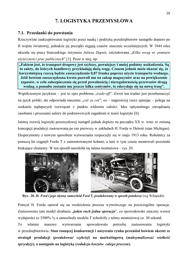 39 7. LOGISTYKA PRZEMYSŁOWA 7.1. Przesłanki do powstania Rzeczywiste zaakceptowanie logistyki przez naukę i praktykę przedsiębiorstw nastąpiło dopiero po II wojnie światowej, jednakŜe jej początki sięgają czasów znacznie wcześniejszych. W 1844 roku ukazała się praca francuskiego inŜyniera Juliesa Dupuit, zatytułowana „Kilka uwag nt. pomiaru uŜyteczności prac publicznych” [1]. Pisze w niej, np: „Faktem jest, Ŝe transport drogowy jest szybszy, pewniejszy i mniej podatny uszkodzenia. Są to zalety, do których handlowcy przykładają duŜą wagę. Czasem jednak moŜe okazać się, Ŝe korzystniejszą rzeczą będzie zaoszczędzenie 0,87 franka poprzez uŜycie transportu wodnego. Jeśli bowiem zaoszczędzona kwota pozwoli mu na zakup magazynów oraz na powiększenie zapasów, w celu zabezpieczenia się przed powolnością i nieregularnością przewozów drogą wodną, a ponadto zostanie mu jeszcze kilka centymów, to zdecyduje się na nową trasę”. Współczesnym językiem – jest to opis problemu „trade-off”. Zwrot ten trudno jest przetłumaczyć na język polski, ale odpowiada naszemu „coś za coś”, co – najprościej rzecz ujmując – polega na szukaniu najlepszych rozwiązań z punktu widzenia całości. Idea optymalnego zarządzania zasobami i procesami naleŜy do podstawowych zagadnień w teorii logistyki [6]. Istotny rozwój logistyki przemysłowej nastąpił jednak dopiero na początku XX w. wraz ze zmianą koncepcji produkcji zastosowaną po raz pierwszy w zakładach H. Forda w Detroit (stan Michigan). Eksperymenty z nowym sposobem wytwarzania rozpoczęły się w maju 1913 roku. Robotnicy za pomocą lin ciągnęli Forda T z zamontowanymi kołami, a inni w tym czasie montowali pozostałe brakujące elementy. W ten sposób narodziła się taśma montaŜowa – rys. 20. Rys. 20. H. Ford i jego słynny samochód Ford T, produkowany w sposób potokowy (wg Wikipedii) Pomysł H. Forda opierał się na rozdzielenia procesu wytwórczego na poszczególne operacje. Zastosowano tam model działania „jeden ruch jedna operacja”, co spowodowało znaczny wzrost wydajności (o 3500% !), a samochody modelu T schodziły z taśmy montaŜowej co 30 sekund. To właśnie masowe wytwarzanie spowodowało potrzebę zastosowania logistyki w przedsiębiorstwie. Stan rosnącej konkurencji i nasycenia rynku przeniósł bowiem akcent ze strategii produkcji (produkować szybciej) na marketingową (maksymalizować wielkość sprzedaŜy), a następnie na logistykę (redukcja kosztów całego procesu). 40 7.2. Fazy rozwojowe W XIX wieku, w okresie rewolucji przemysłowej, kiedy gospodarki rynkowe dopiero się tworzyły, teoria i praktyka ekonomiczna były skoncentrowane na sposobach przełamywania barier technologicznych w procesach produkcyjnych. Myślano o tym, jak szybko i tanio wyprodukować towary. Pojawienie się parowozu, elektryczności, telefonu, silnika spalinowego, powodowało szybki rozwój rynków zbytu. W tym czasie zaopatrzenie i dystrybucję traktowano jako dodatkowe czynności, wprawdzie kosztotwórcze, jednak bez większego znaczenia. AŜ do połowy XX w. utrzymywał się jednak klimat działań marketingowych. Brak efektywności w dziedzinie fizycznej dystrybucji był maskowany tworzeniem nowych rynków zbytu (spektakularne przykłady zastosowania logistyki w praktyce wojennej z okresu II Wojny Światowej nie zostały w pełni wykorzystane). Miały więc swoje uzasadnienie słowa Druckera, który pisał [20]: „Sfera dystrybucji jest najbardziej zaniedbaną i jednocześnie najbardziej obiecującą dziedziną amerykańskiego biznesu”. (P. F. Drucker) Dopiero okres od połowy lat 50. do lat 70. był czasem „przebijania się” myśli logistycznej do grona uznanych dyscyplin naukowych i zastosowania jej w praktyce. Okazało się, Ŝe dla klienta bardzo istotna jest takŜe uŜyteczność czasu i miejsca, a dla firmy istnieje moŜliwość redukcji kosztów drogą koordynacji wszystkich sfer funkcjonalnych związanych z przepływem produktów i związanej z nią informacji. Kolejne stadia rozwoju logistyki pokazuje rys. 21 [67]. FAZA I Lata 60. (USA) FAZA II Lata 70. (Japonia) FAZA IIII Lata 80. FAZA IV Lata 90. FAZA V Po roku 2000 CEL: optymalizacja produkcji METODA: physical distribution CEL: planowanie i sterowanie produkcją METODA: produkcja na zlecenie CEL: optymalizacja zaopatrzenia METODA: JIT (Just in Time) CIM (Computer Inegrated.Manuf.) CEL: kooperacyjna koncepcja zarządzania METODA: CEL: CIL (Computer Integrated Logistic) zintegrowana koncepcja zarządzania METODA: CILS (Computer Integrated Logistic Systems) Rys. 21. Fazy rozwojowe logistyki przemysłowej (wg E. Michlowicza [67] ) 41 7.3. Czynniki sprzyjające rozwojowi Punktem przełomowym w historii logistyki był rok 1956, w którym opublikowano wyniki badania nad współzaleŜnością kosztów frachtu lotniczego i kosztów utrzymania zapasów. Okazało się, Ŝe wysoki poziom stawek transportu lotniczego nie powinien być jedynym miernikiem jego uŜycia. Znacznie waŜniejszą rzeczą jest, aby całkowity koszt transportu i gospodarki zapasami był jak najmniejszy [17]. Wniosek, do którego doszli, oraz idea kosztów alternatywnych, nie była nowością, teraz jednak zaistniały realne przesłanki jej realizacji. Wiele firm amerykańskich dokonało wtedy reorganizacji pewnych grup czynności, których koszty były wymienne. Zazwyczaj wybierano droŜszy i szybszy transport lotniczy, redukując w ten sposób rozmiary zapasów i sieci magazynowej, co w sumie przynosiło obniŜkę kosztów łącznych. Na okres ten przypada równieŜ rozwój teorii systemów (opublikowanie „Ogólnej teorii systemów” przez Ludwiga von Berfantlego), jednego z kierunków nauki o organizacji i zarządzaniu, który kładł nacisk na wiedzę systemową, czyli postrzeganie wszelkich zjawisk jako układu logicznie powiązanych ze sobą zdarzeń. Całościowe spojrzenie na przepływy i transformacje zasobów w prz