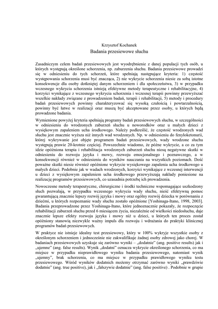 Krzysztof Kochanek Badania przesiewowe słuchu Zasadniczym celem badań przesiewowych jest wyodrębnienie z danej populacji tych osób, u których występują określone schorzenia, np. zaburzenia słuchu. Badania przesiewowe prowadzi się w odniesieniu do tych schorzeń, które spełniają następujące kryteria: 1) częstość występowania schorzenia musi być znacząca, 2) nie wykrycie schorzenia niesie za sobą istotne konsekwencje dla osoby dotkniętej danym schorzeniem i dla społeczeństwa, 3) w przypadku wczesnego wykrycia schorzenia istnieją efektywne metody terapeutyczne i rehabilitacyjne, 4) korzyści wynikające z wczesnego wykrycia schorzenia i wczesnej terapii powinny przewyŜszać wszelkie nakłady związane z prowadzeniem badań, terapii i rehabilitacji, 5) metody i procedury badań przesiewowych powinny charakteryzować się wysoką czułością i powtarzalnością, powinny być łatwe w realizacji oraz muszą być akceptowane przez osoby, u których będą prowadzone badania. Wymienione powyŜej kryteria spełniają programy badań przesiewowych słuchu, w szczególności w odniesieniu do wrodzonych zaburzeń słuchu u noworodków oraz u małych dzieci z wysiękowym zapaleniem ucha środkowego. NaleŜy podkreślić, Ŝe częstość wrodzonych wad słuchu jest znacznie wyŜsza niŜ innych wad wrodzonych. Np. w odniesieniu do fenyloketonurii, której wykrywanie jest objęte programem badań przesiewowych, wady wrodzone słuchu występują prawie 20-krotnie częściej. Powszechnie wiadomo, Ŝe późne wykrycie, a co za tym idzie opóźniona terapia i rehabilitacja wrodzonych zaburzeń słuchu niosą negatywne skutki w odniesieniu do rozwoju języka i mowy, rozwoju emocjonalnego i poznawczego, a w konsekwencji równieŜ w odniesieniu do wyników nauczania na wszystkich poziomach. Dość powaŜne skutki niesie równieŜ opóźnione wykrycie wysiękowego zapalenia ucha środkowego u małych dzieci. Podobnie jak w wadach wrodzonych, korzyści wynikające z wczesnej interwencji u dzieci z wysiękowym zapaleniem ucha środkowego przewyŜszają nakłady poniesione na realizację programów przesiewowych, co uzasadnia potrzebę ich prowadzenia. Nowoczesne metody terapeutyczne, chirurgiczne i środki techniczne wspomagające uszkodzony słuch pozwalają, w przypadku wczesnego wykrycia wady słuchu, nieść efektywną pomoc gwarantującą znacznie lepszy rozwój języka i mowy oraz ogólny rozwój dziecka w porównaniu z dziećmi, u których rozpoznanie wady słuchu zostało opóźnione [Yoshinaga-Itano, 1998, 2003]. Badania przeprowadzone przez Yoshinaga-Itano, które jednoznacznie pokazały, Ŝe rozpoczęcie rehabilitacji zaburzeń słuchu przed 6 miesiącem Ŝycia, niezaleŜnie od wielkości niedosłuchu, daje znacznie lepsze efekty rozwoju języka i mowy niŜ u dzieci, u których ten proces został opóźniony stanowią niezwykle waŜny impuls dla rozwoju i wdraŜania do praktyki klinicznej programów badań przesiewowych. W praktyce nie istnieje idealny test przesiewowy, który w 100% wykryje wszystkie osoby z określonym schorzeniem i jednocześnie nie zakwalifikuje Ŝadnej osoby zdrowej jako chorej. W badaniach przesiewowych uzyskuje się zarówno wyniki – „dodatnie” (ang. positive results) jak i „ujemne” (ang. false results). Wynik „dodatni” oznacza wykrycie określonego schorzenia, co ma miejsce w przypadku nieprawidłowego wyniku badania przesiewowego, natomiast wynik „ujemny”, brak schorzenia, co ma miejsce w przypadku prawidłowego wyniku testu przesiewowego. Wśród wyników dodatnich moŜemy otrzymać zarówno wyniki „prawdziwie dodatnie” (ang. true positive), jak i „fałszywie dodatnie” (ang. false positive) . Podobnie w grupie wyników ujemnych mogą wystąpić wyniki „prawdziwie ujemne” (ang. true negative) oraz „fałszywie ujemne” (ang. false negative). Wyniki „prawdziwie dodatnie” dotyczą osób z patologią, u których wynik testu przesiewowego był dodatni, natomiast wyniki „fałszywie dodatnie” dotyczą osób zdrowych, u których wynik testu przesiewowego był nieprawidłowy (osoba zdrowa została niesłusznie zakwalifikowana do grupy osób chorych). Wyniki „prawdziwie ujemne” dotyczą osób zdrowych, natomiast „fałszywie ujemne” (ang. false negative) osób z patologią, u których otrzymano ujemny wynik test przesiewowego (osoba ze schorzeniem została zakwalifikowana niesłusznie do grupy osób zdrowych). W praktyce pewien procent osób z danym schorzeniem pozostaje zazwyczaj niewykryty (wyniki fałszywie ujemne), a część osób zdrowych zostaje zakwalifikowana niesłusznie do grupy osób chorych (wyniki fałszywie dodatnie). Miarami, które określają kliniczną uŜyteczność testu przesiewowego są jego czułość i specyficzność. Czułość testu przesiewowego jest to procent poprawnie wykrytych patologii (iloraz wyników prawdziwie dodatnich i liczby osób z patologią), natomiast specyficzność testu oznacza procent poprawnie wykrytych osób zdrowych (iloraz wyników prawdziwie ujemnych i liczby osób zdrowych). 100 badanie metodą referencyjną patologia norma 20 80 + badanie przesiewowe - 18 2 68 czułość 18/20 * 100% = 90% specyficzność 68/80 * 100% = 85% Rys. 1. Schemat wyznaczania czułości i specyficznosci testu przesiewowego. + 12 test przesiewowy W praktyce klinicznej czułość i specyficzność testu przesiewowego słuchu określa się w następujący sposób (rys. 1). W pierwszym etapie za pomocą metody referencyjnej (tzw. gold standard) wyodrębniamy grupy osób z zaburzeniami słuchu oraz osób normalnie słyszących. JeŜeli test przesiewowy ma wykrywać osoby z ubytkami słuchu to standardową metodą referencyjną jest progowe badanie audiometryczne. W przykładzie prezentowanym na rys. 1 cała populacja osób normalnie słyszących i z zaburzeniami słuchu wynosiła 100 osób, z czego na podstawie audiogramu do grupy osób z zaburzeniami słuchu zakwalifikowano 20 osób, a