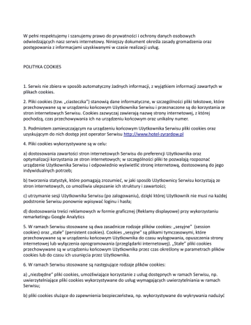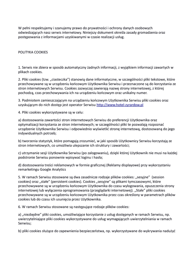 W pełni respektujemy i szanujemy prawo do prywatności i ochrony danych osobowych odwiedzających nasz serwis internetowy. Niniejszy dokument określa zasady gromadzenia oraz postępowania z informacjami uzyskiwanymi w czasie realizacji usług. POLITYKA COOKIES 1. Serwis nie zbiera w sposób automatyczny żadnych informacji, z wyjątkiem informacji zawartych w plikach cookies. 2. Pliki cookies (tzw. „ciasteczka”) stanowią dane informatyczne, w szczególności pliki tekstowe, które przechowywane są w urządzeniu końcowym Użytkownika Serwisu i przeznaczone są do korzystania ze stron internetowych Serwisu. Cookies zazwyczaj zawierają nazwę strony internetowej, z której pochodzą, czas przechowywania ich na urządzeniu końcowym oraz unikalny numer. 3. Podmiotem zamieszczającym na urządzeniu końcowym Użytkownika Serwisu pliki cookies oraz uzyskującym do nich dostęp jest operator Serwisu http://www.hotel-zyrardow.pl 4. Pliki cookies wykorzystywane są w celu: a) dostosowania zawartości stron internetowych Serwisu do preferencji Użytkownika oraz optymalizacji korzystania ze stron internetowych; w szczególności pliki te pozwalają rozpoznać urządzenie Użytkownika Serwisu i odpowiednio wyświetlić stronę internetową, dostosowaną do jego indywidualnych potrzeb; b) tworzenia statystyk, które pomagają zrozumieć, w jaki sposób Użytkownicy Serwisu korzystają ze stron internetowych, co umożliwia ulepszanie ich struktury i zawartości; c) utrzymanie sesji Użytkownika Serwisu (po zalogowaniu), dzięki której Użytkownik nie musi na każdej podstronie Serwisu ponownie wpisywać loginu i hasła; d) dostosowania treści reklamowych w formie graficznej (Reklamy displayowe) przy wykorzystaniu remarketingu Google Analytics 5. W ramach Serwisu stosowane są dwa zasadnicze rodzaje plików cookies: „sesyjne” (session cookies) oraz „stałe” (persistent cookies). Cookies „sesyjne” są plikami tymczasowymi, które przechowywane są w urządzeniu końcowym Użytkownika do czasu wylogowania, opuszczenia strony internetowej lub wyłączenia oprogramowania (przeglądarki internetowej). „Stałe” pliki cookies przechowywane są w urządzeniu końcowym Użytkownika przez czas określony w parametrach plików cookies lub do czasu ich usunięcia przez Użytkownika. 6. W ramach Serwisu stosowane są następujące rodzaje plików cookies: a) „niezbędne” pliki cookies, umożliwiające korzystanie z usług dostępnych w ramach Serwisu, np. uwierzytelniające pliki cookies wykorzystywane do usług wymagających uwierzytelniania w ramach Serwisu; b) pliki cookies służące do zapewnienia bezpieczeństwa, np. wykorzystywane do wykrywania nadużyć w zakresie uwierzytelniania w ramach Serwisu; c) „wydajnościowe” pliki cookies, umożliwiające zbieranie informacji o sposobie korzystania ze stron internetowych Serwisu; d) „funkcjonalne” pliki cookies, umożliwiające „zapamiętanie” wybranych przez Użytkownika ustawień i personalizację interfejsu Użytkownika, np. w zakresie wybranego języka lub regionu, z którego pochodzi Użytkownik, rozmiaru czcionki, wyglądu strony internetowej itp.; e) „reklamowe” pliki cookies, umożliwiające dostarczanie Użytkownikom treści reklamowych bardziej dostosowanych do ich zainteresowań. 7. W wielu przypadkach oprogramowanie służące do przeglądania stron internetowych (przeglądarka internetowa) domyślnie dopuszcza przechowywanie plików cookies w urządzeniu końcowym Użytkownika. Użytkownicy Serwisu mogą dokonać w każdym czasie zmiany ustawień dotyczących plików cookies. Ustawienia te mogą zostać zmienione w szczególności w taki sposób, aby blokować automatyczną obsługę plików cookies w ustawieniach przeglądarki internetowej bądź informować o ich każdorazowym zamieszczeniu w urządzeniu Użytkownika Serwisu. Szczegółowe informacje o możliwości i sposobach obsługi plików cookies dostępne są w ustawieniach oprogramowania (przeglądarki internetowej). Użytkownicy mogą zablokować usługę Analytics dla reklam displayowych oraz dostosowywać reklamy w sieci reklamowej Google w Menedżerze preferencji reklam. Można również pobrać program blokujący Google Analytics ze strony https://tools.google.com/dlpage/gaoptout/ 8. Operator Serwisu informuje, że ograniczenia stosowania plików cookies mogą wpłynąć na niektóre funkcjonalności dostępne na stronach internetowych Serwisu. 9. Pliki cookies zamieszczane w urządzeniu końcowym Użytkownika Serwisu i wykorzystywane mogą być również przez współpracujących z operatorem Serwisu reklamodawców oraz partnerów. 10. Więcej informacji na temat plików cookies dostępnych jest pod adresem http://wszystkoociasteczkach.pl lub w sekcji „Pomoc” w menu przeglądarki internetowej.