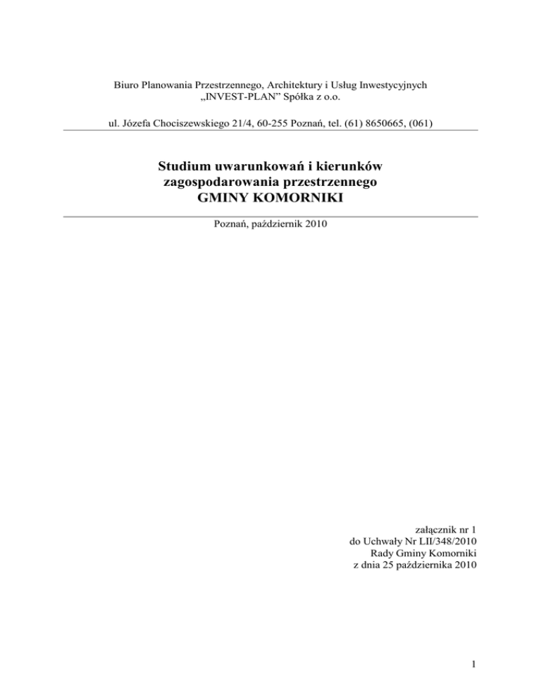 Biuro Planowania Przestrzennego, Architektury i Usług Inwestycyjnych „INVEST-PLAN” Spółka z o.o. ul. Józefa Chociszewskiego 21/4, 60-255 Poznań, tel. (61) 8650665, (061) Studium uwarunkowań i kierunków zagospodarowania przestrzennego GMINY KOMORNIKI Poznań, październik 2010 załącznik nr 1 do Uchwały Nr LII/348/2010 Rady Gminy Komorniki z dnia 25 października 2010 1 Zespół autorski opracowania mgr inż. Daria Ziemkowska (ZOIU Nr Z-180) mgr inż. Stefan Dutkowiak (ZOIU Nr Z-132) mgr Janina Łyszczak mgr inż. Alicja Pogorzelska mgr Maciej Lewandowicz mgr inż. Jędrzej Moraczewski tech. geod. Jadwiga Cybińska Każda rzecz jest powiązana ze wszystkimi innymi rzeczami. Każda rzecz musi się gdzieś podziać. Przyroda wie najlepiej. Nie istnieje coś takiego, jak „obiad za darmo”. (Prawa ekologii, Barry Commoner) 2 Spis treści str. ROZDZIAŁ I WPROWADZENIE ----------------------------------------------------------------------------------------- 5 ROZDZIAŁ II UWARUNKOWANIA ROZWOJU GMINY KOMORNIKI--------------------------------------- 7 1. Przeznaczenie, zagospodarowanie i uzbrojenie terenu-------------------------------------------- 7 2. Ład przestrzenny i wymogi jego ochrony ----------------------------------------------------------- 8 3. Stan środowiska, w tym stan rolniczej i leśnej przestrzeni produkcyjnej, wielkości i jakości zasobów wodnych oraz wymogów ochrony środowiska, przyrody i krajobrazu kulturowego ------------------------------------------------------------------------------ 7 4. Dziedzictwo kulturowe i zabytki oraz dobra kultury współczesnej ----------------------------13 5. Warunki i jakość życia mieszkańców --------------------------------------------------------------13 6. Zagrożenie bezpieczeństwa ludności i jej mienia-------------------------------------------------14 7. Potrzeby i możliwości rozwoju gminy -------------------------------------------------------------14 8. Stan prawny gruntów----------------------------------------------------------------------------------15 9. Obiekty i tereny chronione na podstawie przepisów odrębnych --------------------------------15 10. Obszary naturalnych zagrożeń ekologicznych-----------------------------------------------------15 11. Udokumentowane złoża kopalin oraz zasobów wód podziemnych ----------------------------16 12. Obszary górnicze wyznaczone na podstawie przepisów odrębnych ---------------------------16 13. Systemy komunikacji ---------------------------------------------------------------------------------16 14. Systemy infrastruktury technicznej -----------------------------------------------------------------17 15. Zadania służące realizacji ponadlokalnych celów publicznych---------------------------------24 ROZDZIAŁ III KIERUNKI ZAGOSPODAROWANIA PRZESTRZENNEGO GMINY KOMORNIKI---26 1. Rozwój demograficzny -------------------------------------------------------------------------------26 2. Perspektywiczne zaspokojenie podstawowych potrzeb mieszkańców gminy ----------------30 3. Kierunki zmian w strukturze przestrzennej gminy oraz w przeznaczeniu terenów ----------33 4. Kierunki i wskaźniki dotyczące zagospodarowania oraz użytkowania terenów, w tym tereny wyłączone z zabudowy------------------------------------------------------------------36 5. Obszary i zasady ochrony środowiska i jego zasobów, ochrony przyrody i krajobrazu kulturowego ------------------------------------------------------------------------------45 6. Obszary i zasady ochrony dziedzictwa kulturowego i zabytków oraz dóbr kultury współczesnej -------------------------------------------------------------------------------------------46 7. Kierunki rozwoju systemów komunikacji ---------------------------------------------------------48 8. Kierunki rozwoju systemów infrastruktury technicznej -----------------------------------------53 9. Obszary, na których będą rozmieszczone inwestycje celu publicznego o znaczeniu lokalnym ------------------------------------------------------------------------------------------------57 10. Obszary, na których zostaną rozmieszczone inwestycje celu publicznego o znaczeniu ponadlokalnym ----------------------------------------------------------------------------57 11. Obszary, dla których obowiązkowe jest sporządzenie miejscowego planu zagospodarowania przestrzennego na podstawie przepisów odrębnych, w tym obszary wymagające przeprowadzenia scaleń i podziału nieruchomości, a także obszary rozmieszczenia obiektów handlowych o powierzchni sprzedaży powyżej 2000 m2 oraz obszary przestrzeni publicznej------------------------------------------------------58 3 12. Obszary, dla których gmina zamierza sporządzić miejscowy plan zagospodarowania przestrzennego, w tym obszary wymagające zmiany przeznaczenia gruntów rolnych i leśnych na cele nierolnicze i nieleśne ----------------------58 13. Kierunki i zasady kształtowania rolniczej i leśnej przestrzeni produkcyjnej -----------------59 14. Obszary narażone na niebezpieczeństwo powodzi i osuwania się mas ziemnych -----------59 15. Obiekty lub obszary, dla których wyznacza się w złożu kopaliny filar ochronny------------60 16. Obszary pomników zagłady i ich stref ochronnych-----------------------------------------------60 17. Obszary wymagające przekształceń, rehabilitacji lub rekultywacji ----------------------------61 18. Granice terenów zamkniętych i ich stref ochronnych --------------------------------------------61 19. Inne obszary problemowe, w zależności od uwarunkowań i potrzeb zagospodarowania występujących w gminie ------------------------------------------------------61 ROZDZIAŁ IV UZASADNIENIE PRZYJĘTYCH KIERUNKÓW ROZWOJU ---------------------------------64 ROZDZIAŁ V ZAŁĄCZNIKI TEKSTOWE -----------------------------------------------------------------------------66 1. Sytuacja demograficzna, zatrudnienie i wyposażenie w usługi -------------