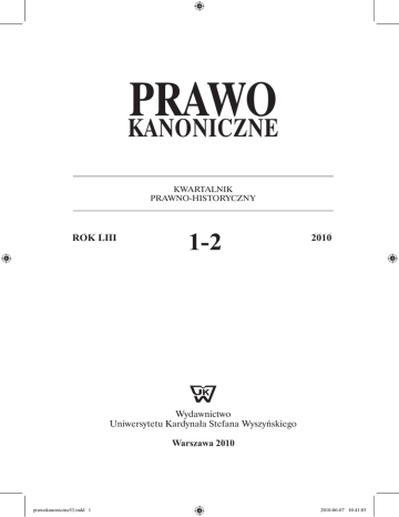 PRAWO KANONICZNE KWARTALNIK PRAWNO-HISTORYCZNY ROK LIII LII ROK 3-4 1-2 2009 2010 Wydawnictwo Uniwersytetu Kardynała Stefana Wyszyńskiego Warszawa 2009 Warszawa 2010 Prawo Kanoniczne_52_3-4.indd 1 prawokanoniczne53.indd 1 28-10-2009 09:03:58 2010-06-07 10:41:03 PRAWO KANONICZNE KWARTALNIK IUS CANONICUM FOLIA TRIMESTRIA studiis canonico-historicis dedicata Założyciel i pierwszy redaktor naczelny ks. Marian Alfons Myrcha Redaktor naczelny ks. Józef Wroceński SCJ Zastępca redaktora naczelnego s. Bożena Szewczul WNO Sekretarz Redakcji ks. Marek Stokłosa SCJ Rada Naukowa: ks. M. Fąka, ks. T. Gałkowski CP, ks. W. Góralski, ks. J. Gręźlikowski, ks. J. Kałowski MIC, ks. W. Kiwior OCD, ks. G. Leszczyński, ks. R. Sobański, ks. H. Stawniak SDB, J. Zabłocki Za pozwoleniem Kurii Metropolitalnej Warszawskiej Pozycja dofinansowana ze środków Komitetu Badań Naukowych ISSN-0551-911X Zgłoszenia prenumeraty przyjmuje Wydawnictwo UKSW ul. Dewajtis 5, 01-815 Warszawa, tel./fax 22 561 89 23 Adres redakcji: ul. Dewajtis 5, 01-815 Warszawa e-mail: [email protected] www.wydawnictwo.uksw.edu.pl Druk i oprawa: OFICYNA WYDAWNICZO-POLIGRAFICZNA „ADAM” 02-729 Warszawa, ul. Rolna 191/193, tel. 022-843-37-23, 022-843-08-79; tel./fax 022-843-20-52 e-mail: [email protected] http://www.oficyna-adam.com.pl prawokanoniczne53.indd 2 2010-06-07 10:41:03 Dnia 18 października 2009 roku niespodziewanie odszedł od nas na zawsze nasz Kolega Śp. Prof. dr hab. TOMASZ DYBOWSKI Był wieloletnim (60 lat) profesorem Wydziału Prawa i Administracji UW, a także profesorem (37 lat) Wydziału Prawa Kanonicznego ATK, a następnie od 1999 r. UKSW w Warszawie, gdzie zajmował stanowisko profesora zwyczajnego i kierownika Katedry Prawa Cywilnego. Z zamiłowaniem i poświęceniem oddawał się pracy naukowej i dydaktycznej. Wykształcił kilkuset magistrów i kilkunastu doktorów prawa. Był promotorem licznych prac magisterskich z prawa porównawczego: prawa kanonicznego i polskiego prawa cywilnego. Występował jako recenzent w przewodach doktorskich, habilitacyjnych i w postępowaniu o nadanie tytułu profesora nauk prawnych. Pozostawił po sobie wybitne prace naukowe z zakresu prawa własności i jego ochrony, odpowiedzialności odszkodowawczej i instytucji prawa rodzinnego. Nie wszystkie zamierzenia zdążył zrealizować. To, czego jednak dokonał, zapewnia Mu trwałe miejsce w cywilistyce polskiej, jako wybitnemu znawcy prawa cywilnego. Angażował się w prace dla dobra dwóch Uczelni. Pełnił odpowiedzialne funkcje w państwie i społeczeństwie. W 1991 r. został wybrany przez Sejm na sędziego Trybunału Konstytucyjnego. Urząd ten sprawował do 1997 roku. W latach 1992-1993 pełnił obowiązki Prezesa tegoż Trybunału. Był członkiem licznych komitetów i komisji rządowych. Jako ekspert był zapraszany do prac w komisjach sejmowych i senackich. Wiele sił poświęcił dla pracy w Fundacji Uniwersytetu Warszawskiego, w Komitecie budowy biblioteki uniwersyteckiej na Powiślu, a także w Komitecie budowy pomnika Prymasa Tysiąclecia. Od samego początku był też członkiem Solidarności. Za ogrom ciężkiej pracy był kilkakrotnie nagradzany wysokimi odznaczeniami państwowymi. Ostatnią posługę – modlitwy i pamięci, licznie zgromadzeni pracownicy Wydziału Prawa Kanonicznego UKSW i Wydziału Prawa i Administracji UW, oddali śp. Profesorowi Tomaszowi Dybowskiemu w dniu 27 października 2009 r. w kościele pw. Wszystkich Świętych w Warszawie. Homilię pogrzebową wygłosił Dziekan Wydziału Prawa Kanonicznego UKSW. Dziękujemy Panu Profesorowi, że był wśród nas. Był dobrym człowiekiem i kolegą, pokornym uczonym i wymagającym profesorem. Ufamy, że Pan Zmartwychwstały da Mu udział w uczcie Swojego Królestwa. Wydział Prawa Kanonicznego Uniwersytetu Kardynała Stefana Wyszyńskiego w Warszawie prawokanoniczne53.indd 3 2010-06-07 10:41:03 prawokanoniczne53.indd 4 2010-06-07 10:41:03 KS. JÓZEF WROCENSKI SCJ Prof. dr hab. Tomasz Dybowski (1923-2009) Tomasz Dybowski urodził się dnia 29 grudnia 1923 roku w Bia łymstoku. Szkołę podstawową ukończył w rodzinnym mieście. Świadectwo dojrzałości zdobył na tajnych kompletach w 1944 roku. T. Dybowski już w młodym wieku odkrył w sobie wielką fascynację nauką, zwłaszcza prawem i tej pasji poświęcił całe swoje życie. Owa fascynacja prawem wyraziła się w odbyciu w latach 1945-1949 studiów prawniczych. Pierwszy rok tych studiów odbył w Uniwersytecie Jagiellońskim w Krakowie, zaś kolejne lata w Uniwersytecie War szawskim. Po ukończeniu studiów w 1949 roku został zatrudniony w tymże Uniwersytecie na Wydziale Prawa na stanowisku asystenta. W roku 1960 uzyskał stopień doktora nauk prawnych na podstawie pracy pt. Własność wód. Praca z racji walorów naukowych została opublikowana drukiem. Po uzyskaniu stopnia doktora został zatrudniony na stanowisku adiunkta. W roku 1969 uzyskał stopień doktora habilitowanego na podstawie monografii zatytułowanej Rei vindicatio – actio negatoria i w niedługim czasie (1970 r.) otrzymał stanowisko docenta. W roku 1980 uzyskał tytuł profesora nadzwyczajnego nauk prawnych, a następnie w 1993 roku tytuł profesora zwyczajnego Wydziału Prawa i Administracji Uniwersytetu Warszawskiego. W 1974 roku został mianowany kierownikiem Katedry Prawa Cywil nego. W latach zaś 1985-1990 był dyrektorem Instytutu Prawa Cy wilnego. Po przejściu na emeryturę w 1994 roku został na tymże Wydziale zatrudniony w wymiarze ¾ etatu. W sumie w Uniwersytecie Warszawskim na Wydziale Prawa i Administracji przepracował 60 lat. W roku 1972 Profesor T. Dybowski podjął pracę w Akademii Teologii Katolickiej w Warszawie, a następnie w Uniwersytecie Kardynała Stefana Wyszyńskiego na Wydziale Prawa Kanonicznego, w Katedrze Prawa Cywilnego, najpierw na podstawie umowy zlecenia, następnie od roku 1983 w wymiarze połowy etatu, a od roku 1992 na podstawie umowy o pracę w wymiarze pełnego etatu. P