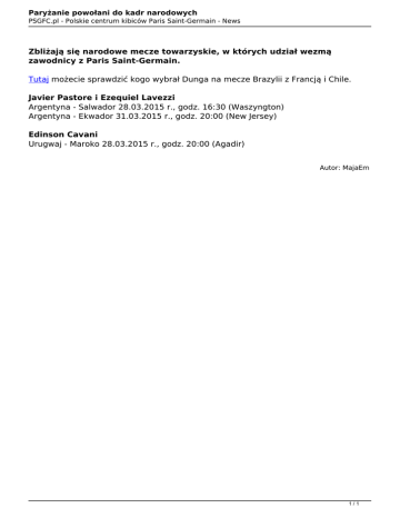 Paryżanie powołani do kadr narodowych PSGFC.pl - Polskie centrum kibiców Paris Saint-Germain - News Zbliżają się narodowe mecze towarzyskie, w których udział wezmą zawodnicy z Paris Saint-Germain. Tutaj możecie sprawdzić kogo wybrał Dunga na mecze Brazylii z Francją i Chile. Javier Pastore i Ezequiel Lavezzi Argentyna - Salwador 28.03.2015 r., godz. 16:30 (Waszyngton) Argentyna - Ekwador 31.03.2015 r., godz. 20:00 (New Jersey) Edinson Cavani Urugwaj - Maroko 28.03.2015 r., godz. 20:00 (Agadir) Autor: MajaEm 1/1 Powered by TCPDF (www.tcpdf.org)