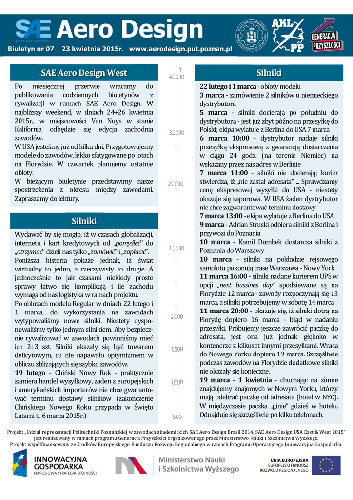 Biuletyn nr 07 23 kwietnia 2015r. www.aerodesign.put.poznan.pl SAE Aero Design West Po miesięcznej przerwie wracamy do publikowania codziennych biuletynów z rywalizacji w ramach SAE Aero Design. W najbliższy weekend, w dniach 24÷26 kwietnia 2015r., w miejscowości Van Nuys w stanie Kalifornia odbędzie się edycja zachodnia zawodów. W USA jesteśmy już od kilku dni. Przygotowujemy modele do zawodów, lekko sfatygowane po lotach na Florydzie. W czwartek planujemy ostatnie obloty. W bieżącym biuletynie przedstawimy nasze spostrzeżenia z okresu między zawodami. Zapraszamy do lektury. ft 42000 32000 22000 Silniki Wydawać by się mogło, iż w czasach globalizacji, internetu i kart kredytowych od „pomyśleć” do „otrzymać” dzieli nas tylko „zamówić” i „zapłacić”. Poniższa historia pokaże jednak, iż świat wirtualny to jedno, a rzeczywisty to drugie. A jednocześnie to jak czasami niekiedy proste sprawy łatwo się komplikują i ile zachodu wymaga od nas logistyka w ramach projektu. Po oblotach modelu Regular w dniach 22 lutego i 1 marca, do wykorzystania na zawodach wytypowaliśmy nowe silniki. Niestety dysponowaliśmy tylko jednym silnikiem. Aby bezpiecznie rywalizować w zawodach powinniśmy mieć ich 2÷3 szt. Silniki okazały się być towarem deficytowym, co nie napawało optymizmem w obliczu zbliżających się szybko zawodów. 19 lutego - Chiński Nowy Rok - praktycznie zamiera handel wysyłkowy, żaden z europejskich i amerykańskich importerów nie chce gwarantować terminu dostawy silników (zakończenie Chińskiego Nowego Roku przypada w Święto Latarni tj. 6 marca 2015r.) 12000 2000 1500 1000 500 Silniki 22 lutego i 1 marca - obloty modelu 3 marca - zamówienie 2 silników u niemieckiego dystrybutora 5 marca - silniki docierają po południu do dystrybutora - jest już zbyt późno na przesyłkę do Polski; ekipa wylatuje z Berlina do USA 7 marca 6 marca 10:00 - dystrybutor nadaje silniki przesyłką ekspresową z gwarancją dostarczenia w ciągu 24 godz. (na terenie Niemiec) na wskazany przez nas adres w Berlinie 7 marca 11:00 - silniki nie docierają; kurier stwierdza, iż „nie zastał adresata” ... Sprawdzamy cenę ekspresowej wysyłki do USA - niestety okazuje się zaporowa. W USA żaden dystrybutor nie chce zagwarantować terminu dostawy 7 marca 13:00 - ekipa wylatuje z Berlina do USA 9 marca - Adrian Struski odbiera silniki z Berlina i przywozi do Poznania 10 marca - Kamil Dombek dostarcza silniki z Poznania do Warszawy 10 marca - silniki na pokładzie rejsowego samolotu pokonują trasę Warszawa - Nowy York 11 marca 16:00 - silniki nadane kurierem UPS w opcji „next bussines day” spodziewane są na Florydzie 12 marca - zawody rozpoczynają się 13 marca, a silniki potrzebujemy w sobotę 14 marca 11 marca 20:00 - okazuje się, iż silniki dotrą na Florydę dopiero 16 marca - błąd w nadaniu przesyłki. Próbujemy jeszcze zawrócić paczkę do adresata, jest ona już jednak głęboko w kontenerze z kilkuset innymi przesyłkami. Wraca do Nowego Yorku dopiero 19 marca. Szczęśliwie podczas zawodów na Florydzie dodatkowe silniki nie okazały się konieczne. 19 marca - 1 kwietnia - chuchając na zimne znajdujemy znajomych w Nowym Yorku, którzy mają odebrać paczkę od adresata (hotel w NYC). W międzyczasie paczka „ginie” gdzieś w hotelu. Odnajduje się szczęśliwie po kilku telefonach. Projekt „Udział reprezentacji Politechniki Poznańskiej w zawodach akademickich SAE Aero Design Brasil 2014, SAE Aero Design USA East & West 2015” jest realizowany w ramach programu Generacja Przyszłości organizowanego przez Ministerstwo Nauki i Szkolnictwa Wyższego. Projekt współfinansowany ze środków Europejskiego Funduszu Rozwoju Regionalnego w ramach Programu Operacyjnego Innowacyjna Gospodarka. Biuletyn nr 07 23 kwietnia 2015r. www.aerodesign.put.poznan.pl Silniki 1 kwietnia - kurier UPS odbiera silniki z hotelu w NYC 7 kwietnia - przesyłka dociera do Kalifornii. Szczęśliwie jej zawartość nie okazuje się być np. kremami przeciwzmarszczkowymi :-) czego nie mogliśmy wykluczyć obserwując drogę paczki Dziedzina w której działamy jest wąsko wyspecjalizowana. Części wielokrotnie są dostępne jedynie bezpośrednio u zagranicznych producentów. Utrudnia to znacznie stosowanie zasad zamówień publicznych, wymaga także przemyślanej polityki zakupowej i logistyki. ft 42000 32000 22000 Skrzynia Pamiętając poprzednią historię z drogą skrzyni do USA tym razem z podejrzliwością śledziliśmy losy przesyłki. Szczęśliwie skrzynia nadana w poniedziałek 16 marca na Florydzie przemierzyła z kurierem UPS w poprzek USA 2500 mil i tydzień później, 23 marca bezpiecznie i w jednym kawałku dotarła do Marka Małolepszego w Kalifornii. Sama droga z Orlando, FL do Rialto, CA zajęła 3 dni i 16 minut. Akumulatory LiPo do naszych modeli spoczęły w lodówce, dzięki czemu miały spełnione najlepsze warunki przechowywania. Równolegle dotarły też dokumenty celne, w tym karnet ATA, wysłane z DHL w Orlando. 12000 Trasa Chiny - Drezno - Berlin - Poznań - Warszawa - Nowy York - Orlando - Nowy York - Los Angeles, której przebycie zajęło paczce ponad miesiąc. Obecnie trwają ostatnie prace mające na celu przygotowanie modeli do czwartkowych oblotów 2000 1500 1000 500 Projekt „Udział reprezentacji Politechniki Poznańskiej w zawodach akademickich SAE Aero Design Brasil 2014, SAE Aero Design USA East & West 2015” jest realizowany w ramach programu Generacja Przyszłości organizowanego przez Ministerstwo Nauki i Szkolnictwa Wyższego. Projekt współfinansowany ze środków Europejskiego Funduszu Rozwoju Regionalnego w ramach Programu Operacyjnego Innowacyjna Gospodarka. Biuletyn nr 07 23 kwietnia 2015r. www.aerodesign.put.poznan.pl Media Jednym z elementów projektu, który realizujemy jest zaangażowanie medialne, które w ostatnich czasach przejawiało się m.in. konferencją prasową w dniu 16 kwietnia 2015r