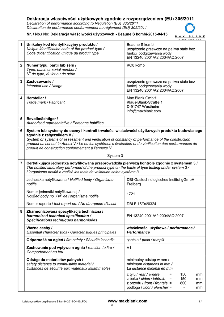 Deklaracja właściwości użytkowych zgodnie z rozporządzeniem (EU) 305/2011 Declaration of performance according to Regulation (EU) 305/2011 Déclaration de performance conformément au règlement (EU) 305/2011 Nr. / No./ No: Deklaracja właściwości użytkowych - Beaune S kombi-2015-04-15 1 Unikalny kod identyfikacyjny produktu / Unique identification code of the product-type / Code d’identification unique du produit type Beaune S kombi urządzenie grzewcze na paliwa stałe bez funkcji podgrzewania wody EN 13240:2001/A2:2004/AC:2007 2 Numer typu, partii lub serii / Type, batch or serial number / No de type, du lot ou de série KO8 kombi 3 Zastosowanie / Intended use / Usage urządzenie grzewcze na paliwa stałe bez funkcji podgrzewania wody EN 13240:2001/A2:2004/AC:2007 4 Hersteller / Trade mark / Fabricant Max Blank GmbH Klaus-Blank-Straße 1 D-91747 Westheim [email protected] 5 Bevollmächtiger / Authorised representative / Personne habilitée 6 System lub systemy do oceny i kontroli trwałości właściwości użytkowych produktu budowlanego zgodnie z załącznikiem V / System or systems of assessment and verification of constancy of performance of the construction product as set out in Annex V / Le ou les systèmes d’évaluation et de vérification des performances du produit de construction conformément à l’annexe V System 3 7 8 Certyfikująca jednostka notyfikowana przeprowadziła pierwszą kontrolę zgodnie z systemem 3 / The notified laboratory performed of the product type on the basis of type testing under system 3 / L’organisme notifié a réalisé les tests de validation selon système 3. Jednostka notyfikowana / Notified body / Organisme notifié DBI-Gastechnologisches Institut gGmbH Freiberg Numer jednostki notyfikowanej / Notified body no. / No de l’organisme notifié 1721 Numer raportu / test report no. / No du rapport d’essai DBI F 15/04/0324 Zharmonizowana specyfikacja techniczna / harmonized technical spezification / Spécifications techniques harmonisées EN 13240:2001/A2:2004/AC:2007 Ważne cechy / Essential characteristics / Caractéristiques principales właściwości użytkowe / performance / Performance Odporność na ogień / fire safety / Sécurité incendie spełnia / pass / remplit Zachowanie pod wpływem ognia / reaction to fire / Comportement au feu A1 Odstęp do materiałów palnych / safety distance to combustible material / Distances de sécurité aux matériaux inflammables minimalny odstęp w mm / minimum distances in mm / La distance minimal en mm z tyłu / rear / arrière z boku / sides / latérale z przodu / front / frontale podłoga / floor / plancher Leistungserklaerung-Beaune S kombi-2015-04-15_POL www.maxblank.com 3 = = = = 150 150 800 - mm mm mm mm 1/ Niebezpieczeństwo pożaru spowodowane wypadnięciem palących się części opału / risk of burning fuelfalling out / Risque d'incendie dû à la chute de combustible allumé spełnia / pass / remplit Możliwość wyczyszczenia / cleanability / Facilité d‘entretien spełnia / pass / remplit Emisja produktów spalania / emission of combustion products / Emission de produits de combustion 1208 mg/m³ Temperatura powierzchni / surface temperature / Température de surface spełnia / pass / remplit Bezpieczeństwo elektryczne / electrical safety / Sécurité électrique spełnia / pass / remplit Uwalnianie się substancji niebezpiecznych / Release of dangerous substance / Emission de substances dangéreuses nie stwierdzono żadnych / NPD / RAS Max ciśnienie robocze /max. operation pressure / / Emission de substances dangéreuses - - bar Temperatura spalin przy znamionowej wydajności cieplnej / flue gas temperature at nominal heat output / Température des fumées à la puissance nominale 255 °C Wytrzymałość mechaniczna (w celu udźwignięcia komina) / mechanical resistance (to carry a a chimney/flue) / Résistance mécanique (pour supporter un conduit) nieoznaczona / NPD / RAS Wydajność cieplna / thermal output / Performance calorifique Znamionowa wydajność cieplna / nominal heat output / Puissance nominale 5,8 kW Wydajność grzewcza / room heating output / Puissance calorifique 5,8 kW Wydajność podgrzewania wody / water heating output / Puissance chauffage eau - - kW Skuteczność / efficiency / Rendement Ƞ 84,0 % Trwałość / durability / durabilité 9 spełnia / pass / remplit Wydajność produktu zgodnie z nr. 1 i 2 jest zgodna z deklarowaną wydajnością wg nr 8. / The performance of the product identified in points 1 and 2 is in conformity with the declared performance in point 8 / La performance du produit conformément aux paragraphes 1 et 2 correspond à la performùance déclarée au point 8. Odpowiedzialny za sporządzenie tej deklaracji właściwości użytkowych produktu jest sam producent, zgodnie z danymi podanymi w nr 4. / This declaration of performance is issued under the sole responsibility of the manufacturer identified in point 4 / Seul le fabricant visé à l’alinea 4 est responsable de la réalisation de cette déclaration des performances.. W imieniu producenta podpisał / signed on behalf of the manufacturer / Signé pour le fabricant Thomas Blank, Kierownik Produkcji Nazwisko, stanowisko / name and function / Nom et fonction Leistungserklaerung-Beaune S kombi-2015-04-15_POL www.maxblank.com 3 2/ Westheim, 15.04.2015 Miejscowość, data / place and date of issue / Lieu et date podpis / signature / signature Leistungserklaerung-Beaune S kombi-2015-04-15_POL www.maxblank.com 3 3/