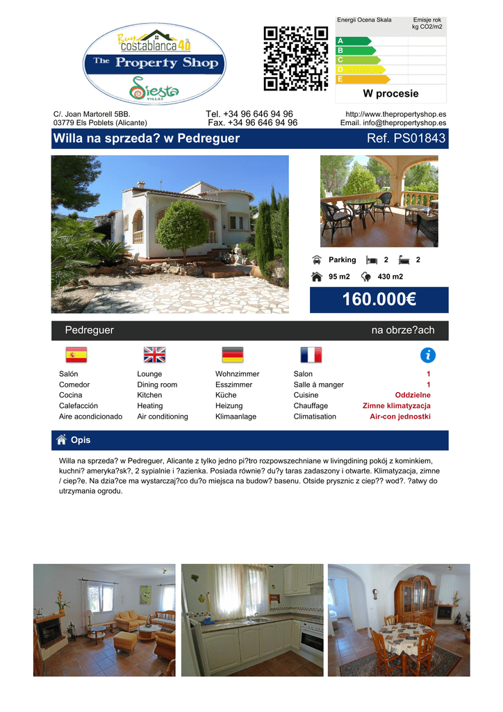 Energii Ocena Skala A B C D E F G C/. Joan Martorell 5BB. 03779 Els Poblets (Alicante) Tel. +34 96 646 94 96 Fax. +34 96 646 94 96 Emisje rok kg CO2/m2 W procesie http://www.thepropertyshop.es Email. [email protected] Willa na sprzeda? w Pedreguer Ref. PS01843 Parking 95 m2 2 2 430 m2 160.000€ Pedreguer Salón Comedor Cocina Calefacción Aire acondicionado na obrze?ach Lounge Dining room Kitchen Heating Air conditioning Wohnzimmer Esszimmer Küche Heizung Klimaanlage Salon Salle à manger Cuisine Chauffage Climatisation 1 1 Oddzielne Zimne klimatyzacja Air-con jednostki Opis Willa na sprzeda? w Pedreguer, Alicante z tylko jedno pi?tro rozpowszechniane w livingdining pokój z kominkiem, kuchni? ameryka?sk?, 2 sypialnie i ?azienka. Posiada równie? du?y taras zadaszony i otwarte. Klimatyzacja, zimne / ciep?e. Na dzia?ce ma wystarczaj?co du?o miejsca na budow? basenu. Otside prysznic z ciep?? wod?. ?atwy do utrzymania ogrodu.