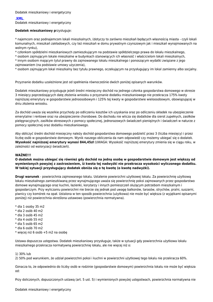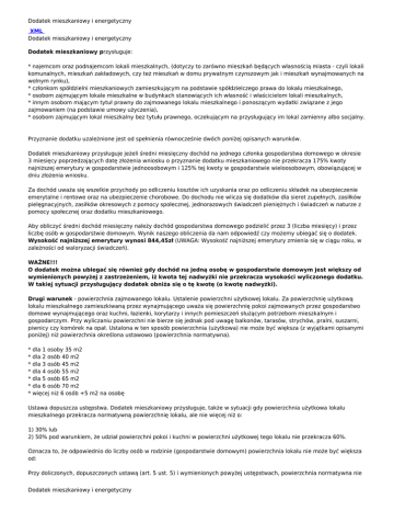 Dodatek mieszkaniowy i energetyczny XML Dodatek mieszkaniowy i energetyczny Dodatek mieszkaniowy przysługuje: * najemcom oraz podnajemcom lokali mieszkalnych, (dotyczy to zarówno mieszkań będących własnością miasta - czyli lokali komunalnych, mieszkań zakładowych, czy też mieszkań w domu prywatnym czynszowym jak i mieszkań wynajmowanych na wolnym rynku), * członkom spółdzielni mieszkaniowych zamieszkującym na podstawie spółdzielczego prawa do lokalu mieszkalnego, * osobom zajmującym lokale mieszkalne w budynkach stanowiących ich własność i właścicielom lokali mieszkalnych, * innym osobom mającym tytuł prawny do zajmowanego lokalu mieszkalnego i ponoszącym wydatki związane z jego zajmowaniem (na podstawie umowy użyczenia), * osobom zajmującym lokal mieszkalny bez tytułu prawnego, oczekującym na przysługujący im lokal zamienny albo socjalny. Przyznanie dodatku uzależnione jest od spełnienia równocześnie dwóch poniżej opisanych warunków. Dodatek mieszkaniowy przysługuje jeżeli średni miesięczny dochód na jednego członka gospodarstwa domowego w okresie 3 miesięcy poprzedzających datę złożenia wniosku o przyznanie dodatku mieszkaniowego nie przekracza 175% kwoty najniższej emerytury w gospodarstwie jednoosobowym i 125% tej kwoty w gospodarstwie wieloosobowym, obowiązującej w dniu złożenia wniosku. Za dochód uważa się wszelkie przychody po odliczeniu kosztów ich uzyskania oraz po odliczeniu składek na ubezpieczenie emerytalne i rentowe oraz na ubezpieczenie chorobowe. Do dochodu nie wlicza się dodatków dla sierot zupełnych, zasiłków pielęgnacyjnych, zasiłków okresowych z pomocy społecznej, jednorazowych świadczeń pieniężnych i świadczeń w naturze z pomocy społecznej oraz dodatku mieszkaniowego. Aby obliczyć średni dochód miesięczny należy dochód gospodarstwa domowego podzielić przez 3 (liczba miesięcy) i przez liczbę osób w gospodarstwie domowym. Wynik naszego obliczenia da nam odpowiedź czy możemy ubiegać się o dodatek. Wysokość najniższej emerytury wynosi 844,45zł (UWAGA: Wysokość najniższej emerytury zmienia się w ciągu roku, w zależności od waloryzacji świadczeń). WAŻNE!!! O dodatek można ubiegać się również gdy dochód na jedną osobę w gospodarstwie domowym jest większy od wymienionych powyżej z zastrzeżeniem, iż kwota tej nadwyżki nie przekracza wysokości wyliczonego dodatku. W takiej sytuacji przysługujący dodatek obniża się o tę kwotę (o kwotę nadwyżki). Drugi warunek - powierzchnia zajmowanego lokalu. Ustalenie powierzchni użytkowej lokalu. Za powierzchnię użytkową lokalu mieszkalnego zamieszkiwaną przez wynajmującego uważa się powierzchnię pokoi zajmowanych przez gospodarstwo domowe wynajmującego oraz kuchni, łazienki, korytarzy i innych pomieszczeń służącym potrzebom mieszkalnym i gospodarczym. Przy wyliczaniu powierzchni nie bierze się jednak pod uwagę balkonów, tarasów, strychów, pralni, suszarni, piwnicy czy komórek na opał. Ustalona w ten sposób powierzchnia (użytkowa) nie może być większa (z wyjątkami opisanymi poniżej) niż powierzchnia określona ustawowo (powierzchnia normatywna). * dla 1 osoby 35 m2 * dla 2 osób 40 m2 * dla 3 osób 45 m2 * dla 4 osób 55 m2 * dla 5 osób 65 m2 * dla 6 osób 70 m2 * więcej niż 6 osób +5 m2 na osobę Ustawa dopuszcza ustępstwa. Dodatek mieszkaniowy przysługuje, także w sytuacji gdy powierzchnia użytkowa lokalu mieszkalnego przekracza normatywną powierzchnię lokalu, ale nie więcej niż o: 1) 30% lub 2) 50% pod warunkiem, że udział powierzchni pokoi i kuchni w powierzchni użytkowej tego lokalu nie przekracza 60%. Oznacza to, że odpowiednio do liczby osób w rodzinie (gospodarstwie domowym) powierzchnia lokalu nie może być większa od: Przy doliczonych, dopuszczonych ustawą (art. 5 ust. 5) i wymienionych powyżej ustępstwach, powierzchnia normatywna nie Dodatek mieszkaniowy i energetyczny Dodatek mieszkaniowy i energetyczny może przekroczyć: +30% * dla 1 osoby 45,5 m2 * dla 2 osób 52,0 m2 * dla 3 osób 58,5 m2 * dla 4 osób 71,5 m2 * dla 5 osób 84,5 m2 * dla 6 osób 91,0 m2 +50% - udział pokoi i kuchni nie przekracza 60% lokalu * dla 1 osoby 52,5 m2 * dla 2 osób 60,0 m2 * dla 3 osób 67,5 m2 * dla 4 osób 82,5 m2 * dla 5 osób 97,5 m2 * dla 6 osób 105,0 m2 Dodatek nie zostanie przyznany, jeśli na osobę przypada więcej m2 powierzchni lokalu niż dopuszcza ustawa. Ustawa dopuszcza jeszcze dwie możliwości kiedy można powierzchnię normatywną dodatkowo powiększyć. 1. Jeśli w lokalu mieszka więcej niż 6 osób, na każdą następną osobę zwiększa się powierzchnię normatywną o 5 m2. 2. Jeśli w lokalu mieszka osoba niepełnosprawna poruszająca się na wózku, lub jeżeli niepełnosprawność wymaga zamieszkiwania w odrębnym pokoju, wówczas wielkość powierzchni normatywnej zwiększa się o 15 m2, przy spełnieniu określonych ustawowo warunków 1. Należy udać się do Gminnego Ośrodka Pomocy Społecznej w Brójcach i pobrać formularze dokumentów o przyznanie dodatku mieszkaniowego. 2. Z wnioskiem trzeba udać się do "swojej" administracji domu. Musi ona potwierdzić takie dane jak: adres zamieszkania, nazwa i siedziba zarządcy domu, tytuł prawny do zajmowanego lokalu, sposób ogrzewania lokalu i wody, kwotę wydatków na mieszkanie za ostatni miesiąc. 2a Właściciele domów jednorodzinnych dołączają do wniosku dokument potwierdzający powierzchnię użytkową i wyposażenie techniczne domu, wystawione przez właściwy organ nadzoru budowlanego wydający pozwolenia na budowę, oraz rachunki dotyczące wydatków na utrzymanie domu. 3. Osoba ubiegająca się o pomoc wypełnia deklarację o dochodach za ostatnie 3 miesiące (sprzed daty złożenia wniosku). 4. Komplet dokumentów, składa się w siedzibie GOPS-u w Brójcach. W określonych przypadkach może zostać przeprowadzony wywiad środowiskowy połączony z koniecznością złożenia p