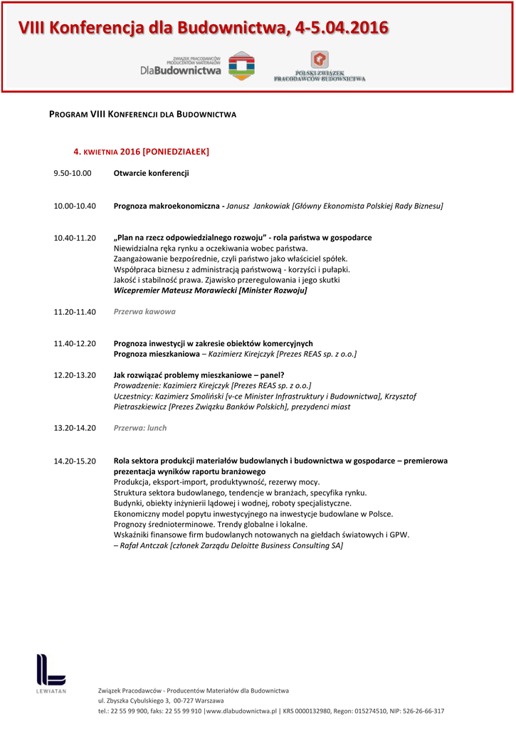 VIII Konferencja dla Budownictwa, 4-5.04.2016 PROGRAM VIII KONFERENCJI DLA BUDOWNICTWA 4. KWIETNIA 2016 [PONIEDZIAŁEK] 9.50-10.00 Otwarcie konferencji 10.00-10.40 Prognoza makroekonomiczna - Janusz Jankowiak [Główny Ekonomista Polskiej Rady Biznesu] 10.40-11.20 „Plan na rzecz odpowiedzialnego rozwoju” - rola państwa w gospodarce Niewidzialna ręka rynku a oczekiwania wobec państwa. Zaangażowanie bezpośrednie, czyli państwo jako właściciel spółek. Współpraca biznesu z administracją państwową - korzyści i pułapki. Jakość i stabilność prawa. Zjawisko przeregulowania i jego skutki Wicepremier Mateusz Morawiecki [Minister Rozwoju] 11.20-11.40 Przerwa kawowa 11.40-12.20 Prognoza inwestycji w zakresie obiektów komercyjnych Prognoza mieszkaniowa – Kazimierz Kirejczyk [Prezes REAS sp. z o.o.] 12.20-13.20 Jak rozwiązać problemy mieszkaniowe – panel? Prowadzenie: Kazimierz Kirejczyk [Prezes REAS sp. z o.o.] Uczestnicy: Kazimierz Smoliński [v-ce Minister Infrastruktury i Budownictwa], Krzysztof Pietraszkiewicz [Prezes Związku Banków Polskich], prezydenci miast 13.20-14.20 Przerwa: lunch 14.20-15.20 Rola sektora produkcji materiałów budowlanych i budownictwa w gospodarce – premierowa prezentacja wyników raportu branżowego Produkcja, eksport-import, produktywność, rezerwy mocy. Struktura sektora budowlanego, tendencje w branżach, specyfika rynku. Budynki, obiekty inżynierii lądowej i wodnej, roboty specjalistyczne. Ekonomiczny model popytu inwestycyjnego na inwestycje budowlane w Polsce. Prognozy średnioterminowe. Trendy globalne i lokalne. Wskaźniki finansowe firm budowlanych notowanych na giełdach światowych i GPW. – Rafał Antczak [członek Zarządu Deloitte Business Consulting SA] Związek Pracodawców - Producentów Materiałów dla Budownictwa ul. Zbyszka Cybulskiego 3, 00-727 Warszawa tel.: 22 55 99 900, faks: 22 55 99 910 |www.dlabudownictwa.pl | KRS 0000132980, Regon: 015274510, NIP: 526-26-66-317 VIII Konferencja dla Budownictwa, 4-5.04.2016 15.20-16.20 Nie buduj szarej strefy Czy polskie władze publiczne rzeczywiście chcą ograniczać szarą strefę? Komu opłaca się utrzymywanie szarej strefy na rynku pracy? Czy firmy wykonawcze są w stanie przetrwać bez nielegalnego obniżania kosztów pracy? Jaki poziom szarej strefy staje się niebezpieczny dla funkcjonowania gospodarki? Jakie działania prawne i organizacyjne ograniczą szarą strefę w budownictwie? Co jest podstawową przyczyną szarej strefy – postawy społeczne czy wady regulacyjne? Prowadzenie: dr Bohdan Wyżnikiewicz [V-ce Prezes Instytutu Badań nad Gospodarką Rynkową]. Uczestnicy: V-ce Minister Mariusz Haładyj [Ministerstwo Rozwoju], Aleksander Łaszek [Główny Ekonomista FOR], V-ce Minister Pracy, V-ce Minister Finansów, Dariusz Stachura [Prezes Zarządu Termo Organika sp. z o.o.] 16.20-16.40 Przerwa kawowa 16.45-18.15 SESJE RÓWNOLEGŁE – WARSZTATY Nowy klient, nowy konsument Klient z pokolenia Y: postrzeganie rzeczywistości, nowe modele zachowań Jak dostosować modele sprzedaży do wymagań nowego klienta? Zmiany w relacjach producent-konsument rola nowych form komunikacji, Techniki pomocne w rozpoznawaniu potrzeb klienta CSR - Odpowiedzialna firma wobec nowych wyzwań CSR w strategiach firm - dotychczasowa praktyka i doświadczenia Odpowiedzialność społeczna w czasach stagnacji gospodarczej. Ludzka twarz biznesu- maksymalizacja zysku a wizerunek firmy Nowe formy działań w obszarze CSR wobec presji na ochronę środowiska i klimatu Odpowiedzialna firma na rynku pracy i w relacjach ze środowiskiem lokalnym Zmiany na rynku wyrobów budowlanych - Tomasz Żuchowski [Podsekretarz Stanu w Min. Infrastruktury i Budownictwa] Systemy oceny zgodności oraz sposób deklarowania właściwości użytkowych wyrobów budowlanych – projekt Rozporządzenia Ministra Infrastruktury i Budownictwa Skuteczne i efektywne kontrole rynku Propozycje zmian w ustawie o wyrobach budowlanych. Zmiany w prawie zamówień publicznych – Grzegorz Lang [Dyrektor Dept. Doskonalenia Regulacji Gospodarczych Ministerstwo Rozwoju] 19.00 – 20.30 Kolacja 20.45 Konformizm a uczciwość. Jacy obywatele, takie państwo – debata wieczorna Prowadzenie: prof. dr hab. Andrzej Rychard [Dyrektor Instytutu Filozofii i Socjologii PAN]. Uczestnicy: prof. dr hab. Krzysztof Jasiecki [Instytut Filozofii i Socjologii PAN], prof. dr hab. Anna Giza-Poleszczuk [Prorektor Uniw. Warszawskiego], prof. dr hab. Ireneusz Krzemiński [Instytut Socjologii UW] Związek Pracodawców - Producentów Materiałów dla Budownictwa ul. Zbyszka Cybulskiego 3, 00-727 Warszawa tel.: 22 55 99 900, faks: 22 55 99 910 |www.dlabudownictwa.pl | KRS 0000132980, Regon: 015274510, NIP: 526-26-66-317 VIII Konferencja dla Budownictwa, 4-5.04.2016 5. KWIETNIA 2016 [WTOREK] 9.15-10.15 Menadżerska Triada: zmiana, strategia i przywództwo – prof. Krzysztof Obłój [Uniwersytet Warszawski, Akademia Koźmińskiego] Komentatorzy: Tomasz Kruppik [Prezes Zarządu Xella Polska sp. z o.o.], Przemysław Powalacz [Prezes Zarządu Geberit Polska sp. z o.o.] Dariusz Blocher [Prezes Zarządu Budimex SA] 10.15-11.10 Fuzje i przejęcia, czyli zdolność do konsolidacji w budownictwie – ryzyka w tym antymonopolowe. Grupy zakupowe, umowy kooperacyjne, networking. Prowadzenie: prof. dr hab. Anna Fornalczyk [partner-założyciel Comper sp.j, członek Międzynarodowej Rady Programowej - Instytut Konsumenckich Badań Antymonopolowych, Chicago], Edyta Hajtka [radca prawny, wspólnik - Kancelaria Prawna Piszcz, Norek i Wspólnicy] 11.10-11.25 Przerwa kawowa 11.25-12.05 Rynek finansowy i kapitałowy a rynek budowlany. Analizy ryzyk przedsięwzięć budowlanych, możliwość i przewidywana skala finansowania, nowe instrumenty i zabezpieczenia. Finansowanie, gwarancje płatności. Partner debaty - Związek Banków Polskich. Jacek Furga, Przewodniczący Komitetu ds. Finansowania Nieruchomości Związku Banków Polskich 12.05-13.05 Marnotrawstwo czy bezpiec