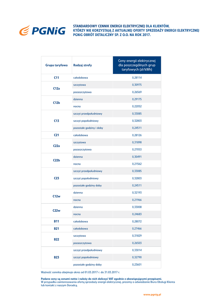 STANDARDOWY CENNIK ENERGII ELEKTRYCZNEJ DLA KLIENTÓW, KTÓRZY NIE KORZYSTAJĄ Z AKTUALNEJ OFERTY SPRZEDAŻY ENERGII ELEKTRYCZNEJ PGNiG OBRÓT DETALICZNY SP. Z O.O. NA ROK 2017. Grupa taryfowa C11 Rodzaj strefy Ceny energii elektrycznej dla poszczególnych grup taryfowych (zł/kWh) całodobowa 0,28114 szczytowa 0,30975 pozaszczytowa 0,26569 dzienna 0,29175 nocna 0,22052 szczyt przedpołudniowy 0,33085 szczyt popołudniowy 0,32803 pozostałe godziny i doby 0,24511 całodobowa 0,28126 szczytowa 0,31898 pozaszczytowa 0,27053 dzienna 0,30491 nocna 0,21562 szczyt przedpołudniowy 0,33085 szczyt popołudniowy 0,32803 pozostałe godziny doby 0,24511 dzienna 0,32193 nocna 0,21966 dzienna 0,33008 nocna 0,24683 B11 całodobowa 0,28072 B21 całodobowa 0,27466 szczytowa 0,31829 pozaszczytowa 0,26503 szczyt przedpołudniowy 0,33014 szczyt popołudniowy 0,32790 pozostałe godziny doby 0,23601 C12a C12b C13 C21 C22a C22b C23 C12w C22w B22 B23 Ważność cennika obejmuje okres od 01.03.2017 r. do 31.03.2017 r. Podane ceny są cenami netto i należy do nich doliczyć VAT zgodnie z obowiązującymi przepisami. W przypadku zainteresowania ofertą sprzedaży energii elektrycznej, prosimy o odwiedzenie Biura Obsługi Klienta lub kontakt z naszym Doradcą. www.pgnig.pl