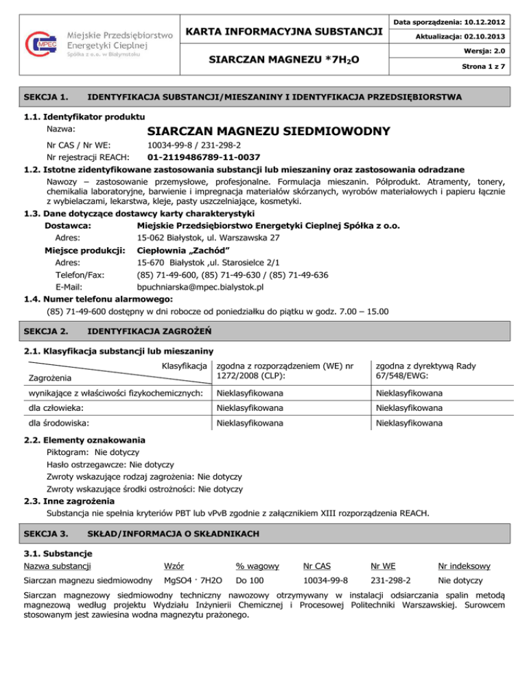 Data sporządzenia: 10.12.2012 KARTA INFORMACYJNA SUBSTANCJI Aktualizacja: 02.10.2013 Wersja: 2.0 SIARCZAN MAGNEZU *7H2O SEKCJA 1. Strona 1 z 7 IDENTYFIKACJA SUBSTANCJI/MIESZANINY I IDENTYFIKACJA PRZEDSIĘBIORSTWA 1.1. Identyfikator produktu Nazwa: SIARCZAN MAGNEZU SIEDMIOWODNY Nr CAS / Nr WE: 10034-99-8 / 231-298-2 Nr rejestracji REACH: 01-2119486789-11-0037 1.2. Istotne zidentyfikowane zastosowania substancji lub mieszaniny oraz zastosowania odradzane Nawozy – zastosowanie przemysłowe, profesjonalne. Formulacja mieszanin. Półprodukt. Atramenty, tonery, chemikalia laboratoryjne, barwienie i impregnacja materiałów skórzanych, wyrobów materiałowych i papieru łącznie z wybielaczami, lekarstwa, kleje, pasty uszczelniające, kosmetyki. 1.3. Dane dotyczące dostawcy karty charakterystyki Dostawca: Adres: Miejskie Przedsiębiorstwo Energetyki Cieplnej Spółka z o.o. 15-062 Białystok, ul. Warszawska 27 Miejsce produkcji: Ciepłownia „Zachód” Adres: 15-670 Białystok ,ul. Starosielce 2/1 Telefon/Fax: (85) 71-49-600, (85) 71-49-630 / (85) 71-49-636 E-Mail: [email protected] 1.4. Numer telefonu alarmowego: (85) 71-49-600 dostępny w dni robocze od poniedziałku do piątku w godz. 7.00 – 15.00 SEKCJA 2. IDENTYFIKACJA ZAGROŻEŃ 2.1. Klasyfikacja substancji lub mieszaniny Zagrożenia zgodna z rozporządzeniem (WE) nr 1272/2008 (CLP): zgodna z dyrektywą Rady 67/548/EWG: wynikające z właściwości fizykochemicznych: Nieklasyfikowana Nieklasyfikowana dla człowieka: Nieklasyfikowana Nieklasyfikowana dla środowiska: Nieklasyfikowana Nieklasyfikowana Klasyfikacja 2.2. Elementy oznakowania Piktogram: Nie dotyczy Hasło ostrzegawcze: Nie dotyczy Zwroty wskazujące rodzaj zagrożenia: Nie dotyczy Zwroty wskazujące środki ostrożności: Nie dotyczy 2.3. Inne zagrożenia Substancja nie spełnia kryteriów PBT lub vPvB zgodnie z załącznikiem XIII rozporządzenia REACH. SEKCJA 3. SKŁAD/INFORMACJA O SKŁADNIKACH 3.1. Substancje Nazwa substancji Wzór % wagowy Nr CAS Nr WE Nr indeksowy Siarczan magnezu siedmiowodny MgSO4 · 7H2O Do 100 10034-99-8 231-298-2 Nie dotyczy Siarczan magnezowy siedmiowodny techniczny nawozowy otrzymywany w instalacji odsiarczania spalin metodą magnezową według projektu Wydziału Inżynierii Chemicznej i Procesowej Politechniki Warszawskiej. Surowcem stosowanym jest zawiesina wodna magnezytu prażonego. Data sporządzenia: 10.12.2012 KARTA INFORMACYJNA SUBSTANCJI Aktualizacja: 02.10.2013 Wersja: 2.0 SIARCZAN MAGNEZU *7H2O SEKCJA 4. Strona 2 z 7 ŚRODKI PIERWSZEJ POMOCY 4.1. Opis środków pierwszej pomocy Wdychanie: Środki specjalne nie są wymagane. W przypadku pojawienia się niepokojących objawów skonsultować się z lekarzem. Kontakt ze skórą: Zmyć pył ze skóry dużą ilością wody. W przypadku utrzymujących się objawów podrażnienia skonsultować się z lekarzem. Kontakt z oczami: Jeśli pył dostanie się do oczu, przemyć dużą ilością wody. W przypadku utrzymujących się objawów podrażnienia skonsultować się z lekarzem. Połknięcie: Podać do wypicia dużą ilość wody. W przypadku złego samopoczucia skonsultować się z lekarzem. 4.2. Najważniejsze ostre i opóźnione objawy oraz skutki narażenia Może wystąpić lekkie podrażnienie skóry i oczu. 4.3. Wskazania dotyczące wszelkiej natychmiastowej pomocy lekarskiej i szczególnego postępowania z poszkodowanym Wdychanie gazów powstających podczas pożaru, zawierających tlenki siarki może działać drażniąco i żrąco na drogi oddechowe. Mogą wystąpić problemy z płucami. SEKCJA 5. POSTĘPOWANIE W PRZYPADKU POŻARU 5.1. Środki gaśnicze Odpowiednie środki gaśnicze: substancja niepalna. Stosować środki gaśnicze odpowiednie do palącego się otoczenia. Niewłaściwe środki gaśnicze: nie są znane. 5.2. Szczególne zagrożenia związane z substancją lub mieszaniną W środowisku pożaru mogą tworzyć się trujące gazy: tlenki siarki (SOx). 5.3. Informacje dla straży pożarnej Nie dopuścić do przedostania się ścieków po gaszeniu pożaru do kanalizacji, wód i gleby. W przypadku pożaru stosować odzież ochronną i aparaty oddechowe z niezależnym dopływem powietrza. Otworzyć okna i drzwi pomieszczenia, aby umożliwić wentylację. SEKCJA 6. POSTĘPOWIANIE W PRZYPADKU NIEZAMIERZONEGO UWOLNIENIA DO ŚRODOWISKA 6.1. Indywidualne środki ostrożności, wyposażenie ochronne i procedury w sytuacjach awaryjnych Stosować środki ochrony indywidualnej – zob. sekcja 8 karty informacyjnej. Unikać tworzenia się pyłu oraz jego rozprzestrzeniania. Zapewnić odpowiednią wentylację pomieszczeń. Unikać kontaktu z oczami, skórą i odzieżą. 6.2. Środki ostrożności w zakresie ochrony środowiska Unikać tworzenia się pyłu. 6.3. Metody i materiały zapobiegające rozprzestrzenianiu się skażenia i służące do usuwania skażenia Zebrać i w miarę możliwości odzyskać lub unieszkodliwić. Aby uniknąć tworzenia się pyłu w powietrzu, substancję można odkurzyć na sucho lub zmyć na mokro przy użyciu urządzeń mechanicznych. 6.4. Odniesienia do innych sekcji Odnieść się również do sekcji 8 i 13 karty informacyjnej. SEKCJA 7. POSTĘPOWANIE Z SUBSTANCJAMI I MIESZANINAMI ORAZ ICH MAGAZYNOWANIE 7.1. Środki ostrożności dotyczące bezpiecznego postępowania Podczas stosowania produktu nie jeść, nie pić, nie palić. Myć ręce po zakończeniu pracy z produktem. Unikać długotrwałego kontaktu ze skórą. Unikać tworzenia się pyłu. Nie wdychać pyłu. Stosować środki ochrony indywidualnej – zob. sekcja 8 karty informacyjnej. Data sporządzenia: 10.12.2012 KARTA INFORMACYJNA SUBSTANCJI Aktualizacja: 02.10.2013 Wersja: 2.0 SIARCZAN MAGNEZU *7H2O Strona 3 z 7 7.2. Warunki bezpiecznego magazynowania, łącznie z informacjami dotyczącymi wszelkich wzajemnych niezgodności Magazynować w suchym, dobrze wentylowanym pomieszczeniu, z dala od źródeł ciepła, bezpośredniego nasłonecznienia, wilgoci i wody. Dopuszcza się nietrwałe 