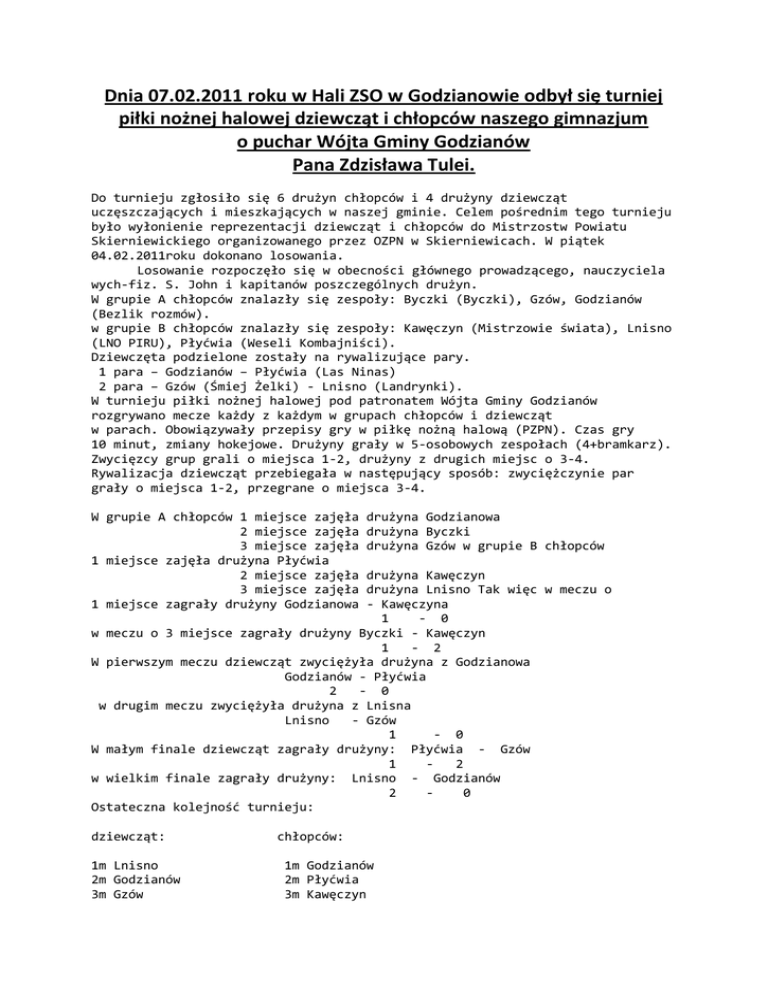 Dnia 07.02.2011 roku w Hali ZSO w Godzianowie odbył się turniej piłki nożnej halowej dziewcząt i chłopców naszego gimnazjum o puchar Wójta Gminy Godzianów Pana Zdzisława Tulei. Do turnieju zgłosiło się 6 drużyn chłopców i 4 drużyny dziewcząt uczęszczających i mieszkających w naszej gminie. Celem pośrednim tego turnieju było wyłonienie reprezentacji dziewcząt i chłopców do Mistrzostw Powiatu Skierniewickiego organizowanego przez OZPN w Skierniewicach. W piątek 04.02.2011roku dokonano losowania. Losowanie rozpoczęło się w obecności głównego prowadzącego, nauczyciela wych-fiz. S. John i kapitanów poszczególnych drużyn. W grupie A chłopców znalazły się zespoły: Byczki (Byczki), Gzów, Godzianów (Bezlik rozmów). w grupie B chłopców znalazły się zespoły: Kawęczyn (Mistrzowie świata), Lnisno (LNO PIRU), Płyćwia (Weseli Kombajniści). Dziewczęta podzielone zostały na rywalizujące pary. 1 para – Godzianów – Płyćwia (Las Ninas) 2 para – Gzów (Śmiej Żelki) - Lnisno (Landrynki). W turnieju piłki nożnej halowej pod patronatem Wójta Gminy Godzianów rozgrywano mecze każdy z każdym w grupach chłopców i dziewcząt w parach. Obowiązywały przepisy gry w piłkę nożną halową (PZPN). Czas gry 10 minut, zmiany hokejowe. Drużyny grały w 5-osobowych zespołach (4+bramkarz). Zwycięzcy grup grali o miejsca 1-2, drużyny z drugich miejsc o 3-4. Rywalizacja dziewcząt przebiegała w następujący sposób: zwyciężczynie par grały o miejsca 1-2, przegrane o miejsca 3-4. W grupie A chłopców 1 miejsce zajęła 2 miejsce zajęła 3 miejsce zajęła 1 miejsce zajęła drużyna Płyćwia 2 miejsce zajęła 3 miejsce zajęła 1 miejsce zagrały drużyny Godzianowa drużyna Godzianowa drużyna Byczki drużyna Gzów w grupie B chłopców drużyna Kawęczyn drużyna Lnisno Tak więc w meczu o - Kawęczyna 1 - 0 w meczu o 3 miejsce zagrały drużyny Byczki - Kawęczyn 1 - 2 W pierwszym meczu dziewcząt zwyciężyła drużyna z Godzianowa Godzianów - Płyćwia 2 - 0 w drugim meczu zwyciężyła drużyna z Lnisna Lnisno - Gzów 1 - 0 W małym finale dziewcząt zagrały drużyny: Płyćwia - Gzów 1 2 w wielkim finale zagrały drużyny: Lnisno - Godzianów 2 0 Ostateczna kolejność turnieju: dziewcząt: 1m Lnisno 2m Godzianów 3m Gzów chłopców: 1m Godzianów 2m Płyćwia 3m Kawęczyn 4m Płyćwia 4m Byczki 5-6m Gzów, Lnisno Podczas turnieju i nagrodzono pamiątkowymi statuetkami najlepszego strzelca wśród dziewcząt i chłopców. Po blisko 3 godzinach zmagań zakończono zawody. Wójt Gminy dyrektor ZSO nagrodzili pamiątkowymi pucharami i dyplomami turnieju drużyny. wybrano i bramkarza Godzianów wraz z uczestniczące w